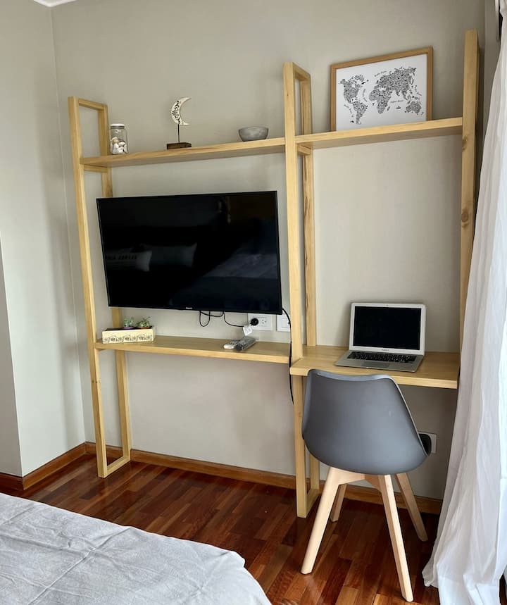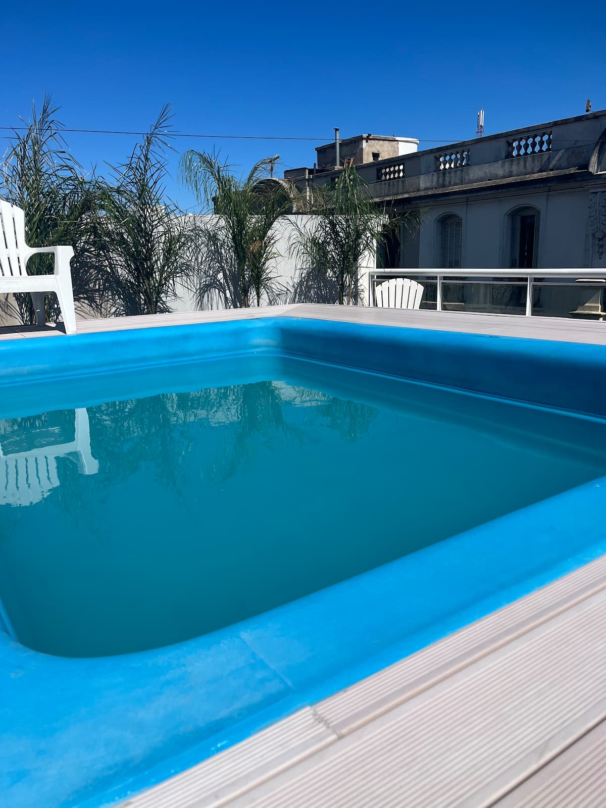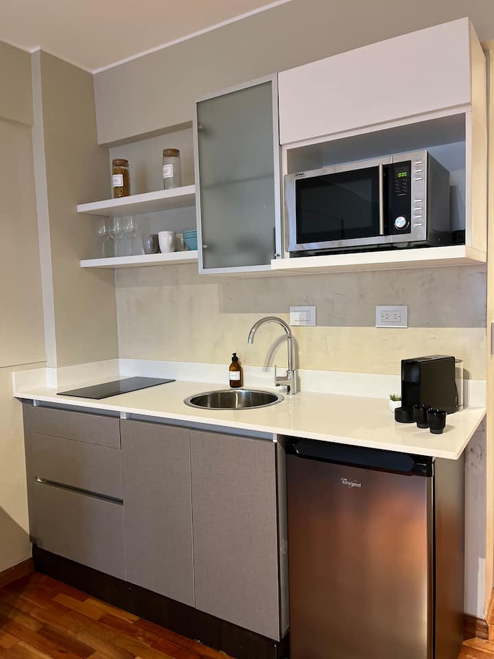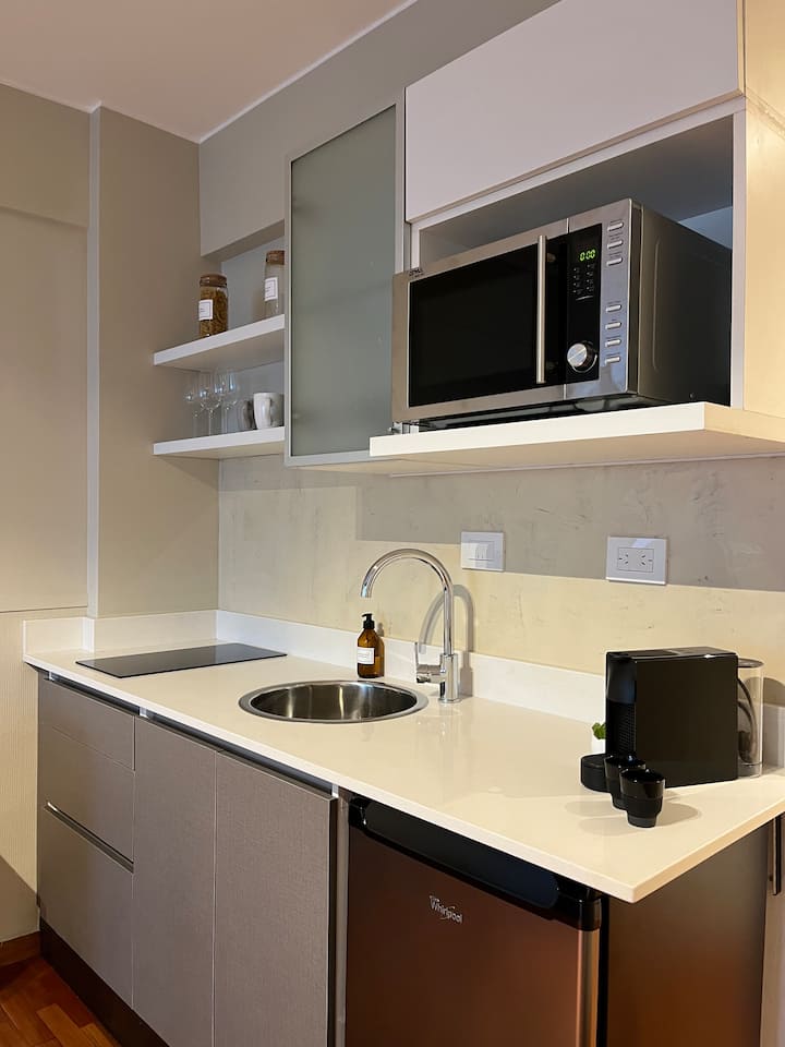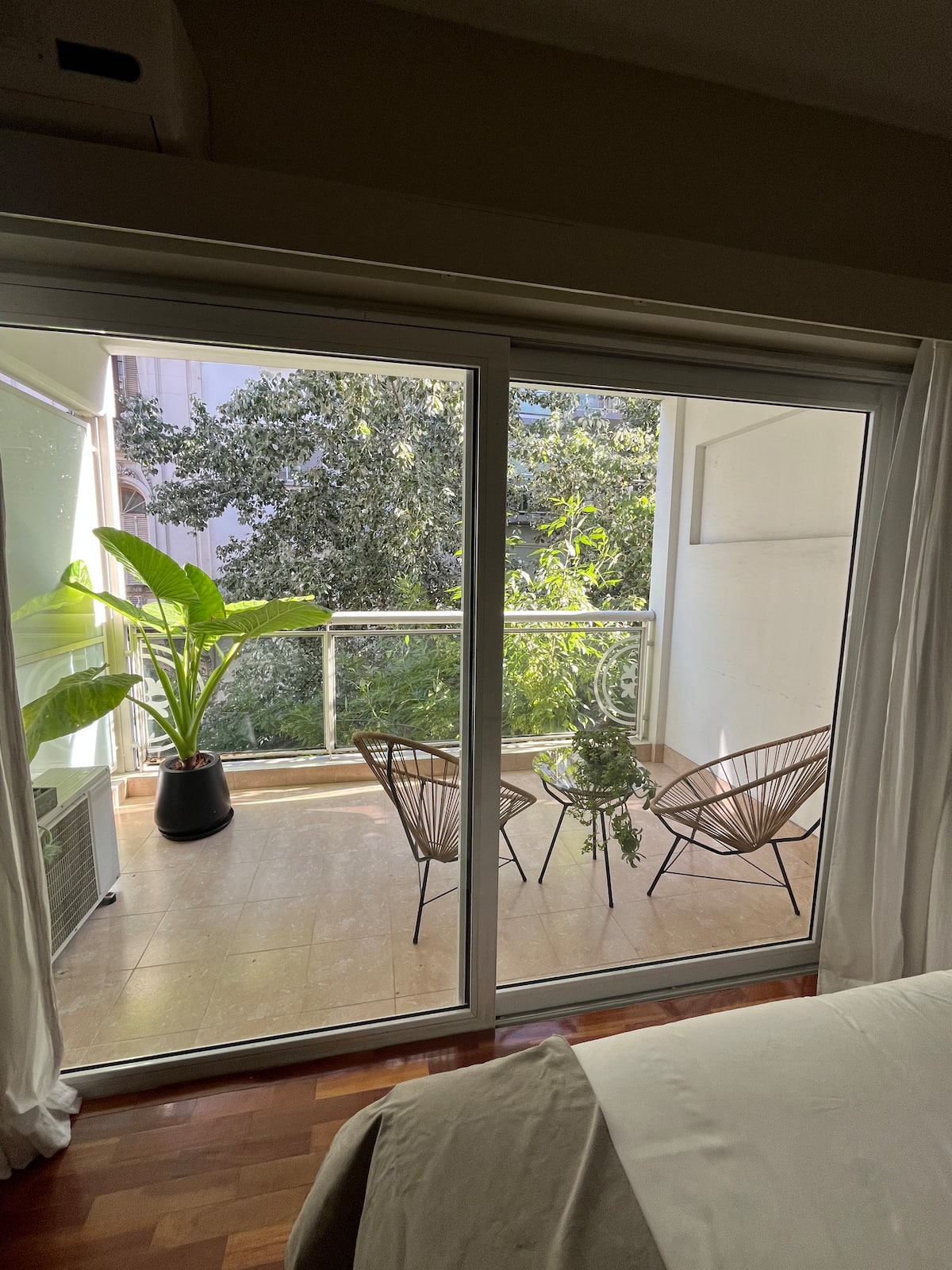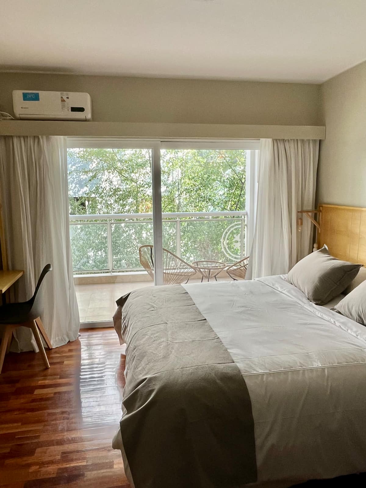 Квартира-студия площадью 50 m² в Monserrat, в здании с кухонной зоной для приготовления и приёма пищи. Окна выходят на Av 9 de Julio: расстояние указано как 50 метров. В студии есть рабочий стол, Wi-Fi, кровать king size; по запросу заранее возможна компоновка в 2 раздельные кровати. Указана мебель: кресло, которое может трансформироваться в спальное место. В описании также упоминается близость UADE University, UCA, Subte и Metrobus, а также Plaza Dorrego, Calle Defensa и Obelisco.