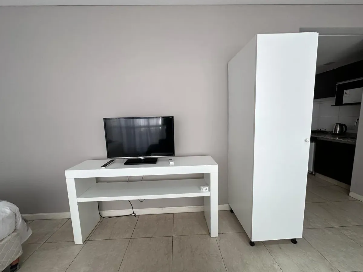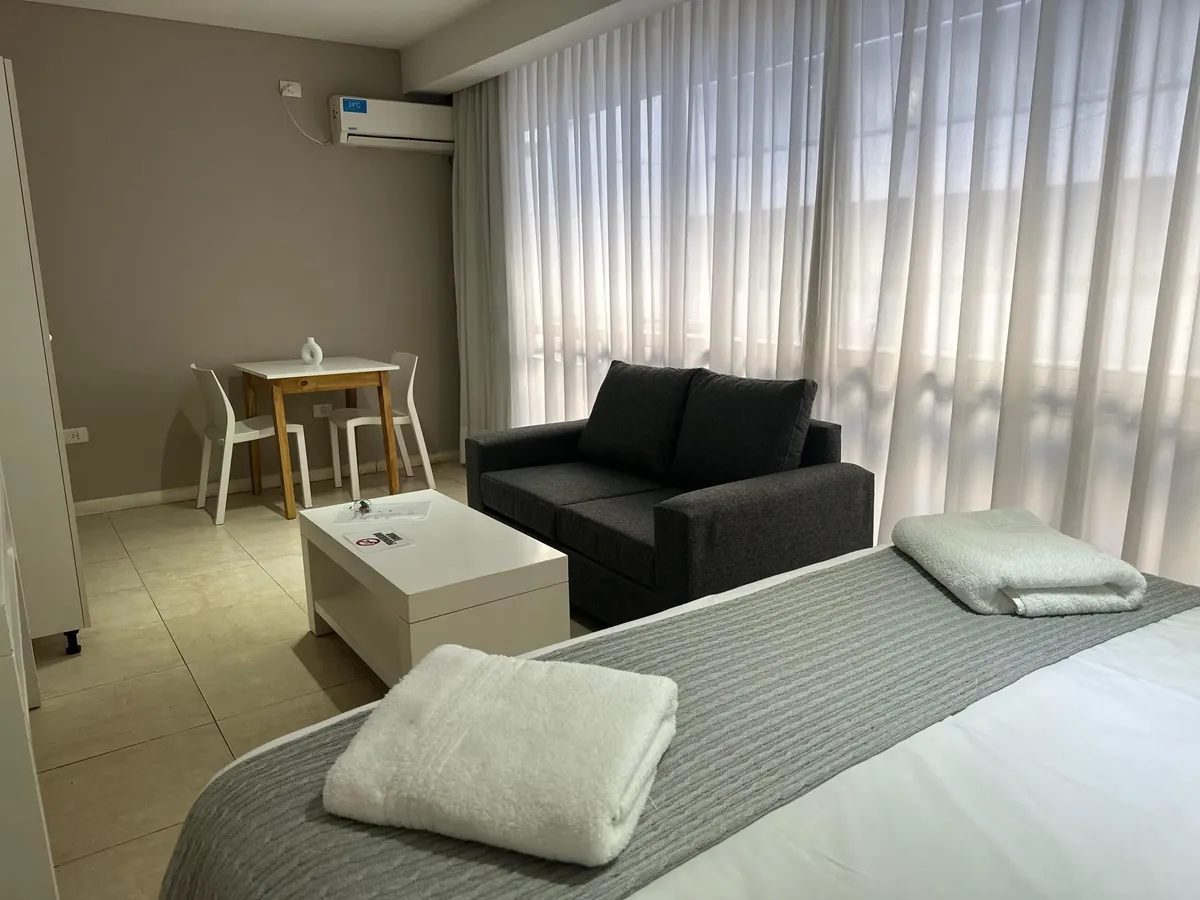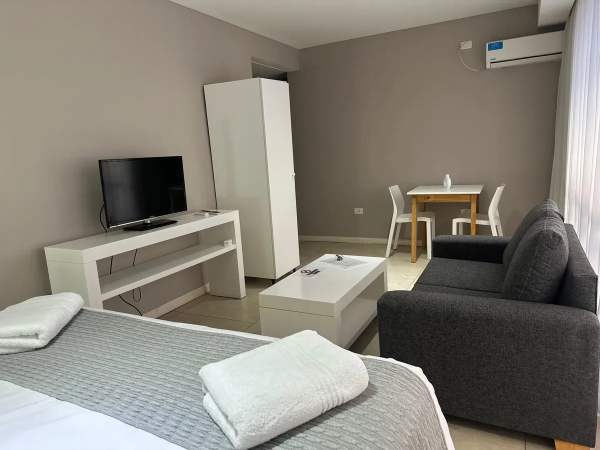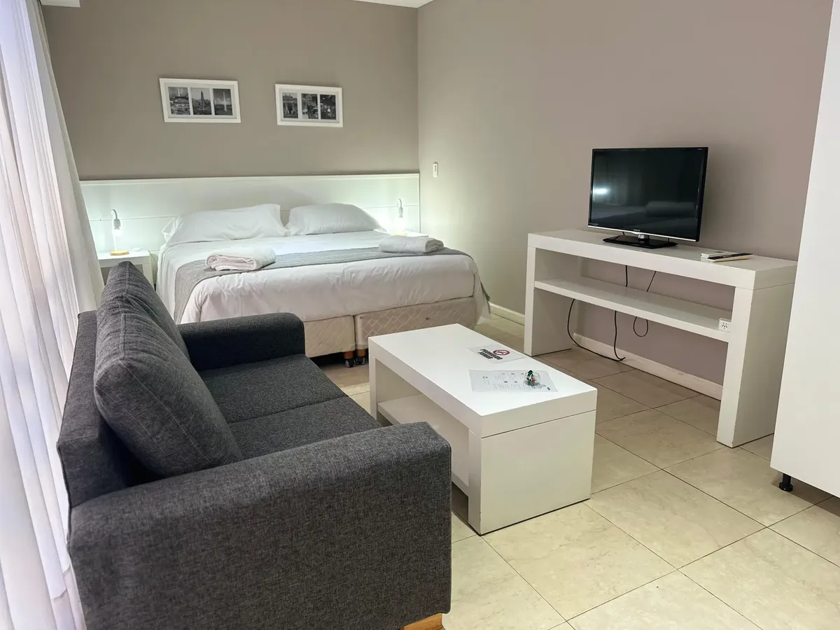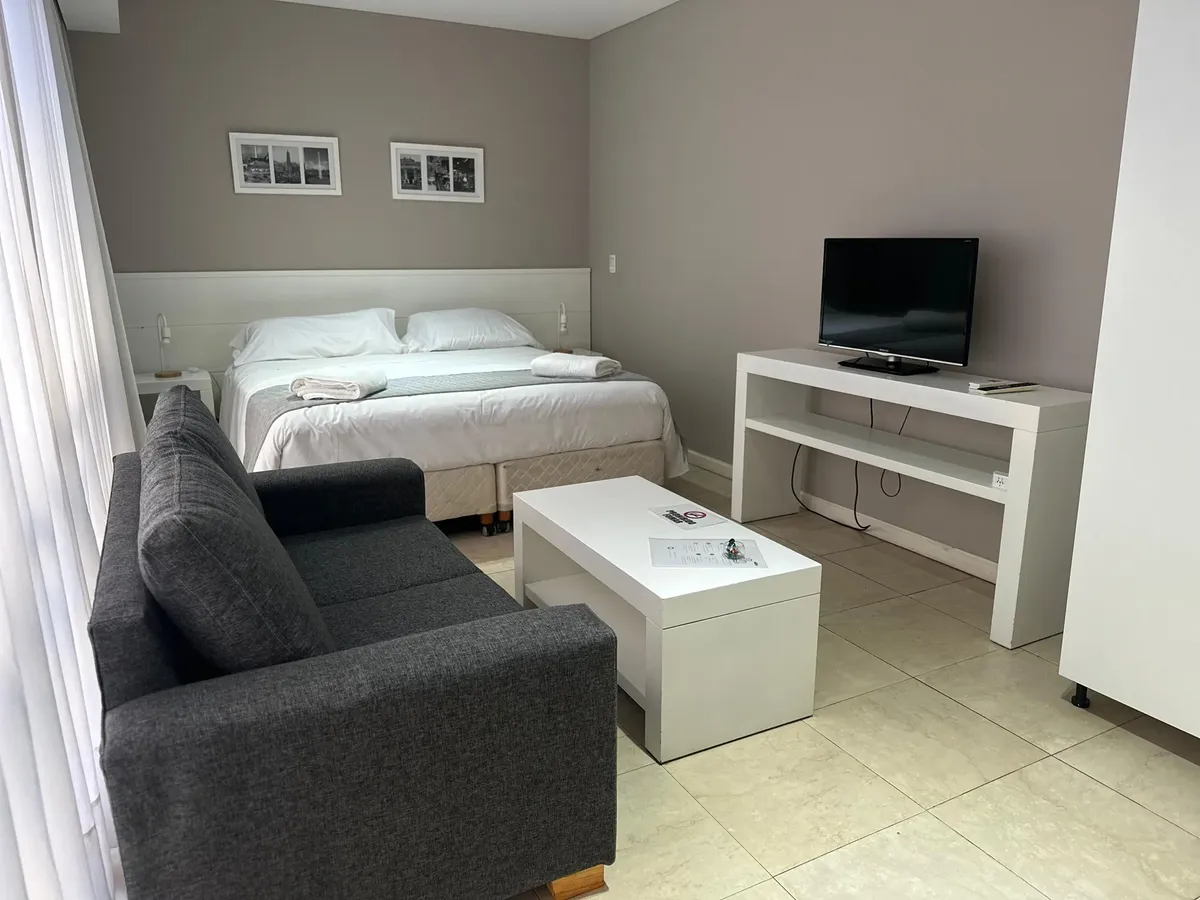 Квартира-студия с мебелью и полной комплектацией для помесячной временной аренды в Buenos Aires, рассчитана на 2 человека. В комнате установлена двуспальная кровать, предусмотрена возможность раздельной конфигурации на две односпальные кровати. Есть совмещённый санузел с ванной и мини-кухня с холодильником (frigobar), электрической варочной панелью и микроволновой печью. В квартире установлены кондиционер (холод/тепло), телевизор LED 32 дюйма и WiFi. В стоимость аренды включены коммунальные плат