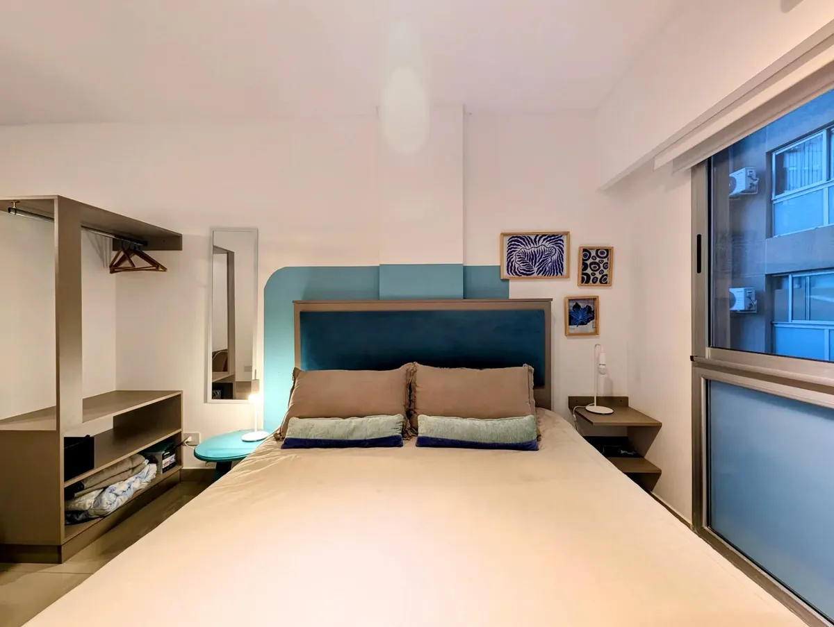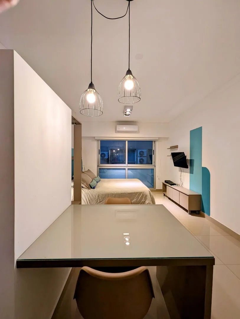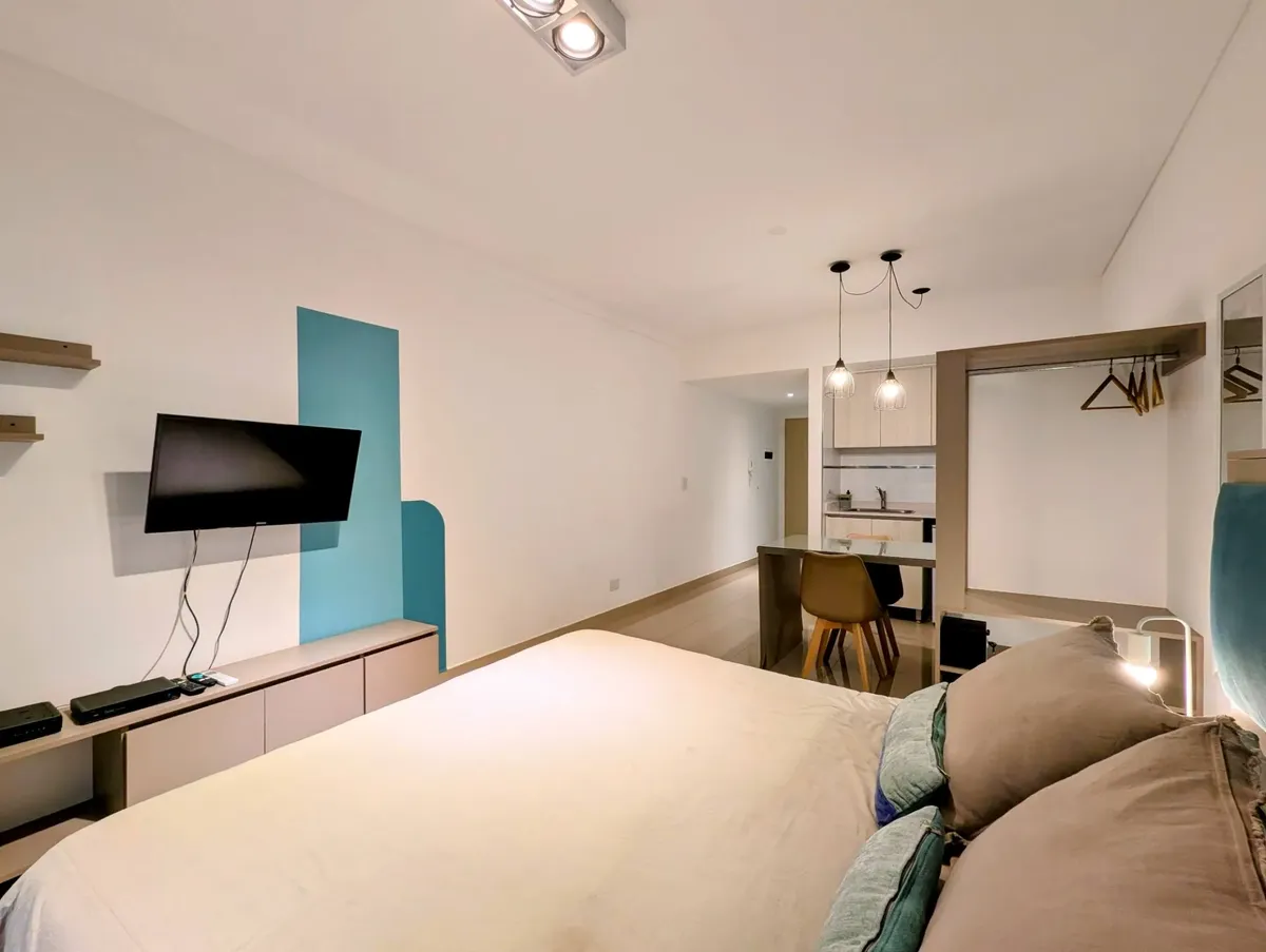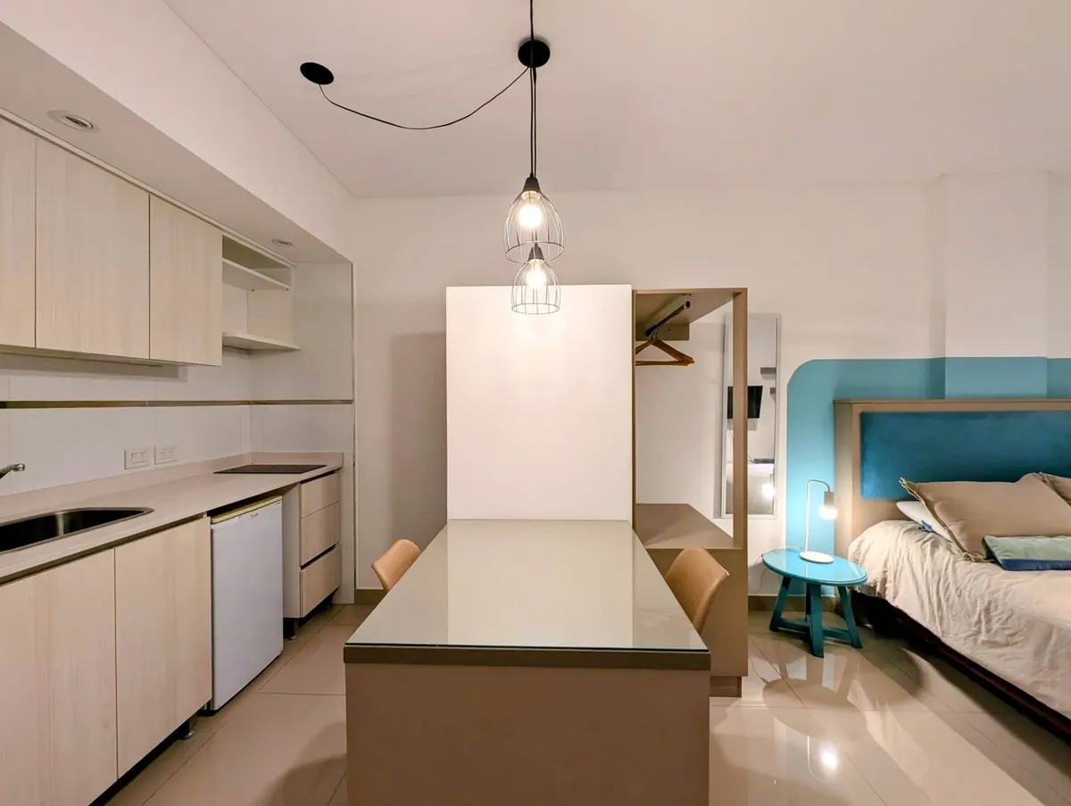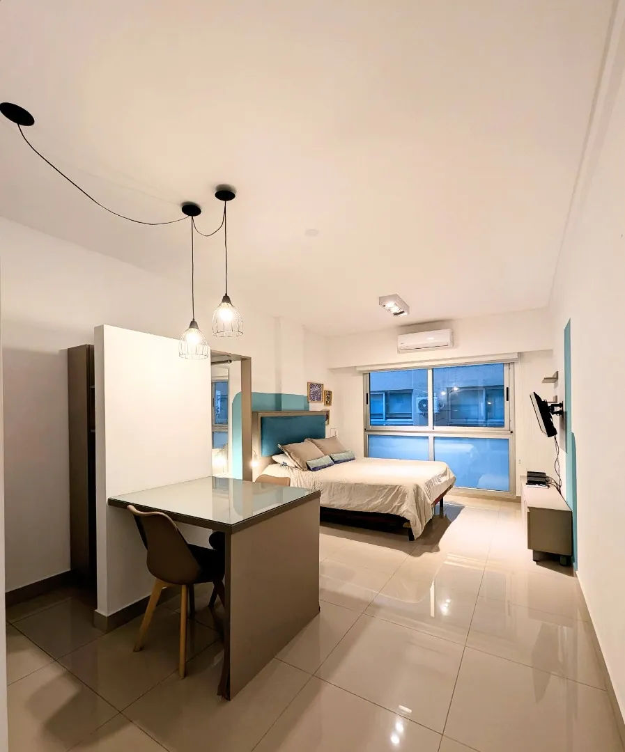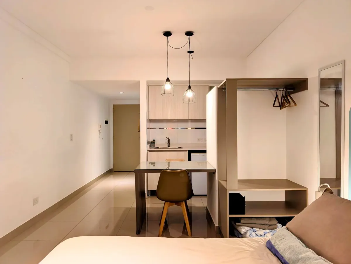 Квартира-студия площадью для 2 человек в здании LA CISTERNA, с кондиционером и отоплением. Полностью меблирована и оборудована: обеденная зона, двуспальная кровать, шкафы, кухня с холодильником и микроволновой печью, ванная комната с ванной, телевизор. В здании есть терраса, бассейн, солярий, прачечная, кафе, пространство для коворкинга; электронный замок и круглосуточная охрана. В стоимость аренды на временный срок включены ABL, AYSA, коммунальные платежи здания и Wi‑Fi; отдельно оплачиваются э