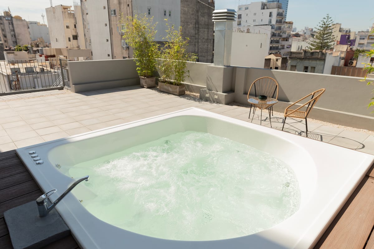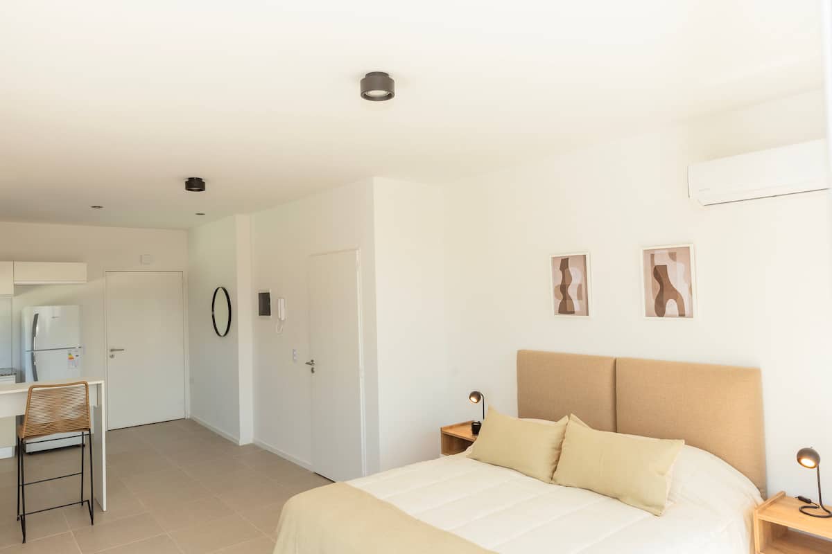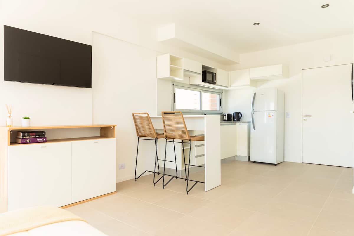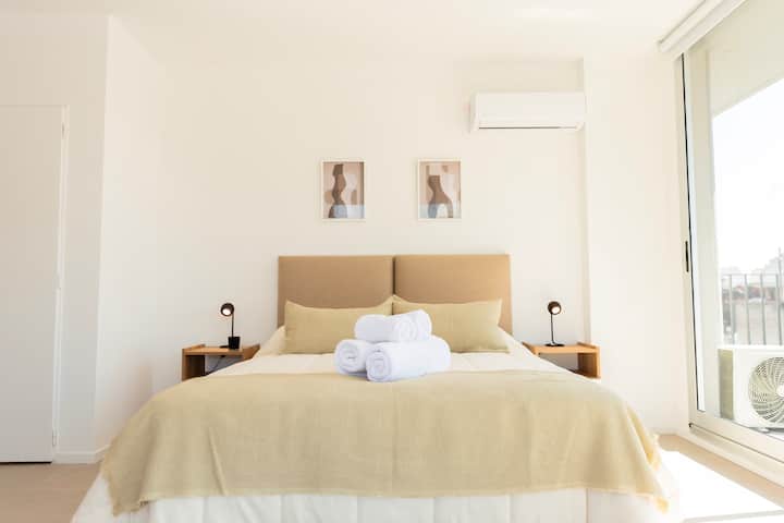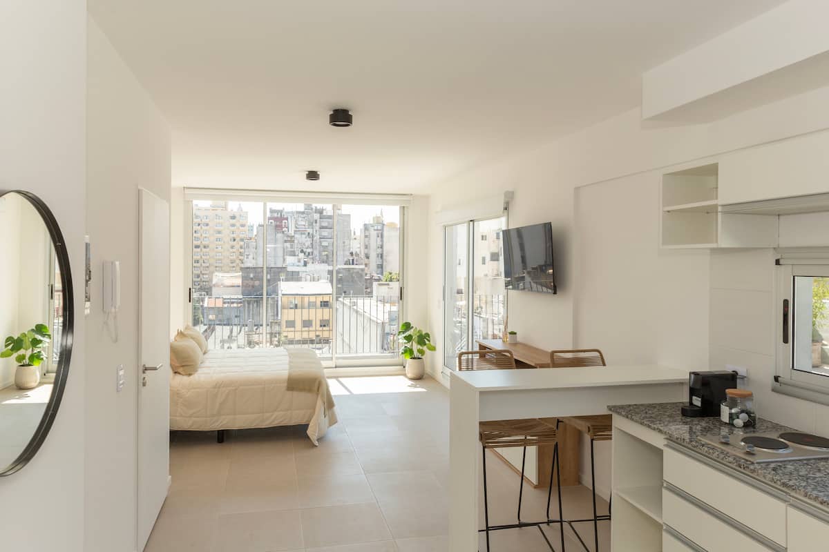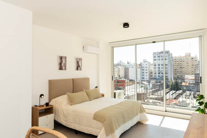 Квартира-студия на 6-м этаже в современном здании в Monserrat. В здании есть лифт, бассейн и общие зоны. В квартире предусмотрены кухня с полным набором принадлежностей, Wi‑Fi, телевизор высокой чёткости, утюг и фен; частная терраса выходит на город. Метро: станция “Independencia” (Линия C) находится в 3 кварталах. Заселение проводится в согласованное время; персонал в здании отсутствует 24 часа в сутки.
