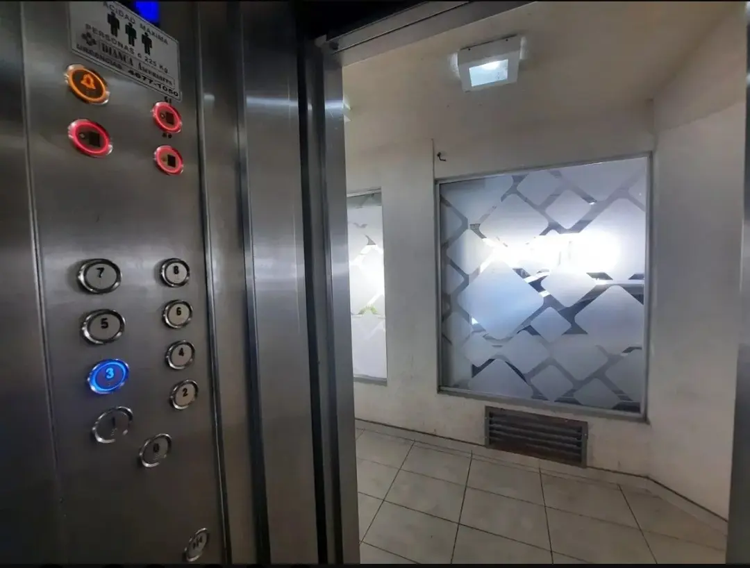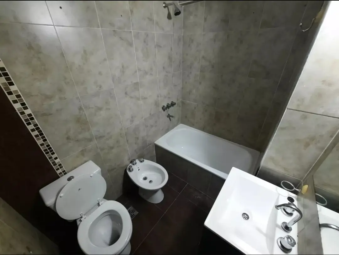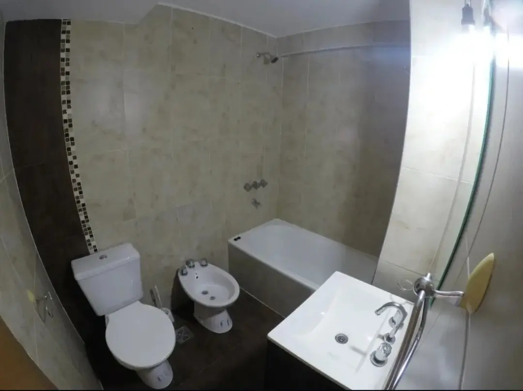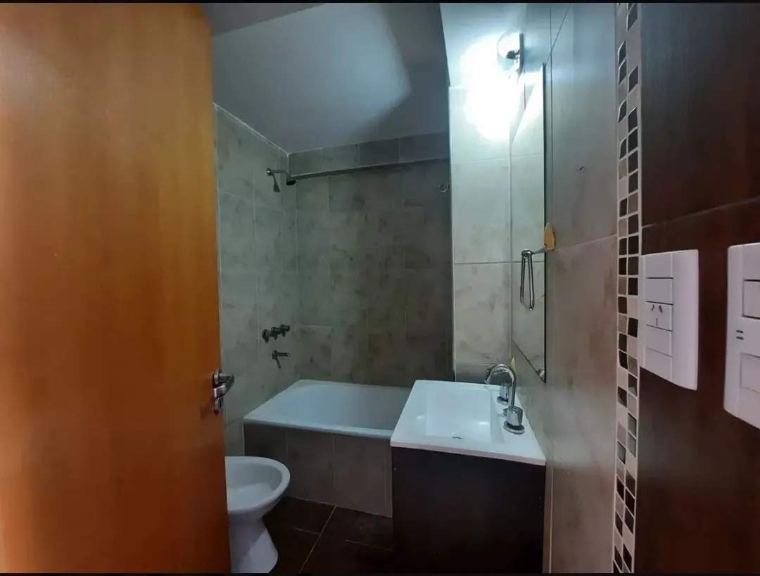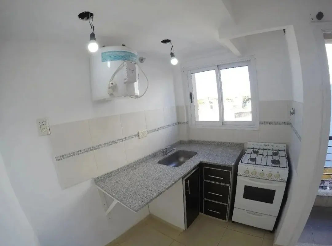 Квартира-студия в Morón, окна во двор (contrafrente), с балконом и видом на Marconi. Площадь в объявлении не указана. Отдельная кухня с гранитной столешницей серого цвета, плитой на 4 конфорки и духовкой Candor, электрическим бойлером на 40 л, предусмотрена установка для фронтальной стиральной машины. Ванная комната с ванной, есть умывальник (vanitory) с раковиной, зеркало. Предусмотрен вывод под кондиционер для установки на балконе, сделана предустановка под сплит. В здании 2 автоматических лиф