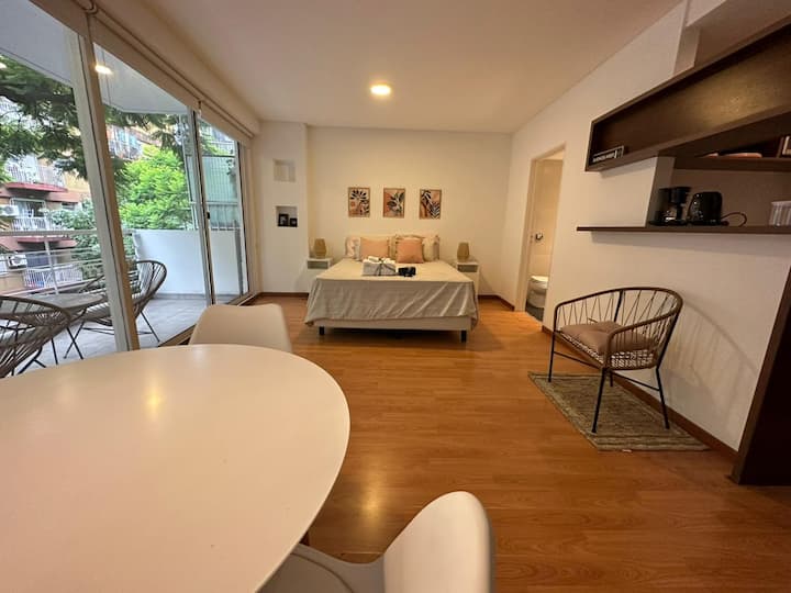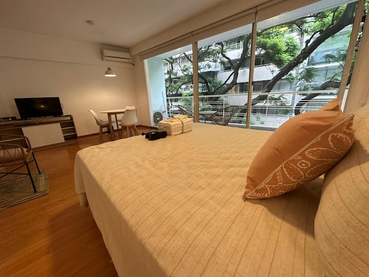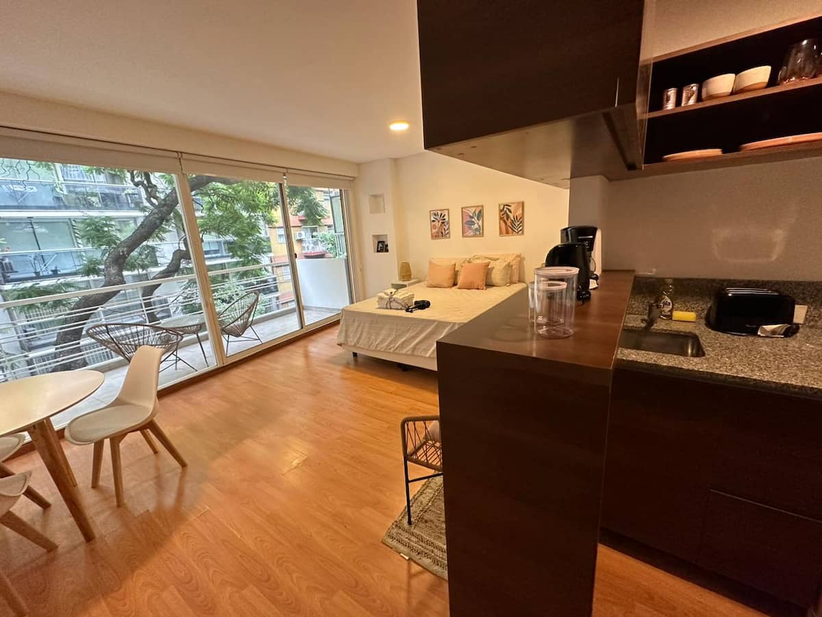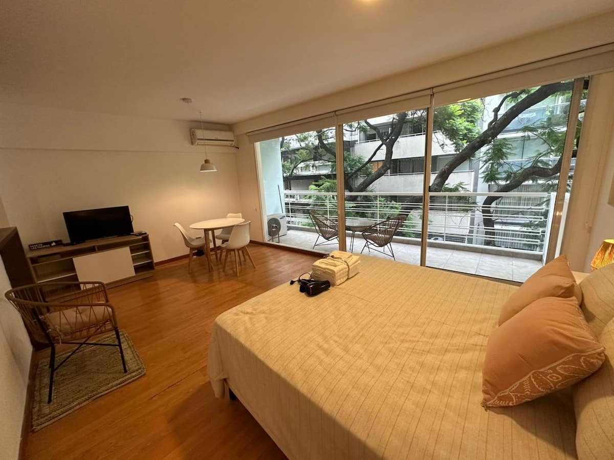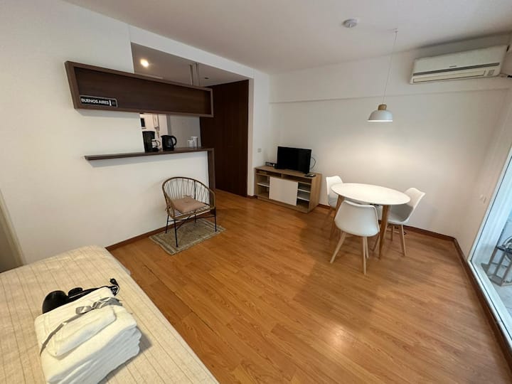 Квартира-студия в Palermo с новой мебелью и оборудованием. В помещении двуспальная кровать, стол со стульями, полностью оборудованная кухня и полный санузел. Кондиционер холод/тепло. Предоставляются постельные принадлежности и полотенца.