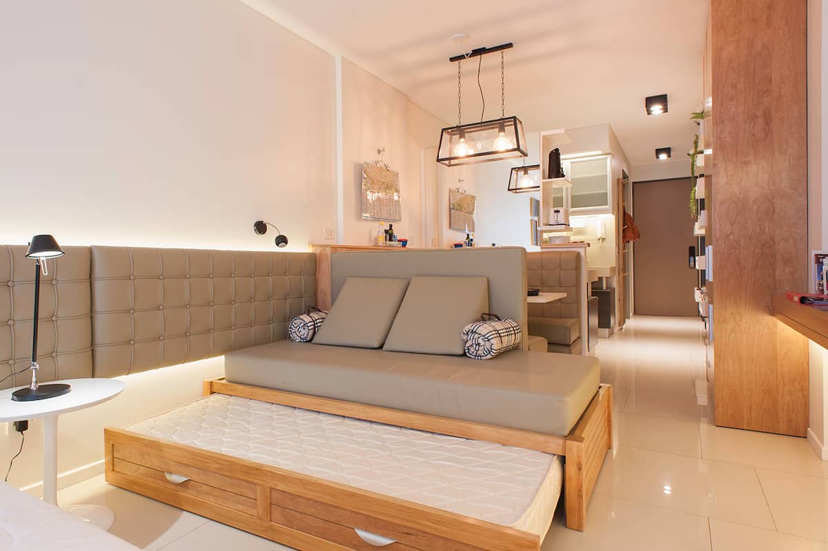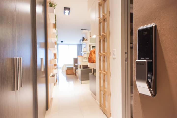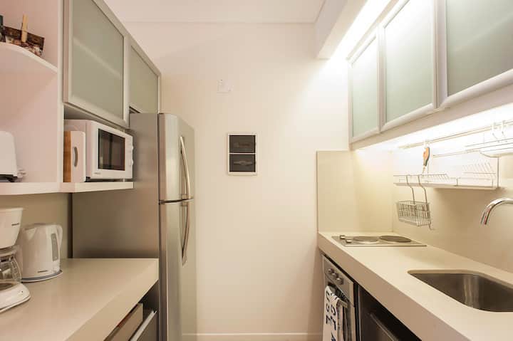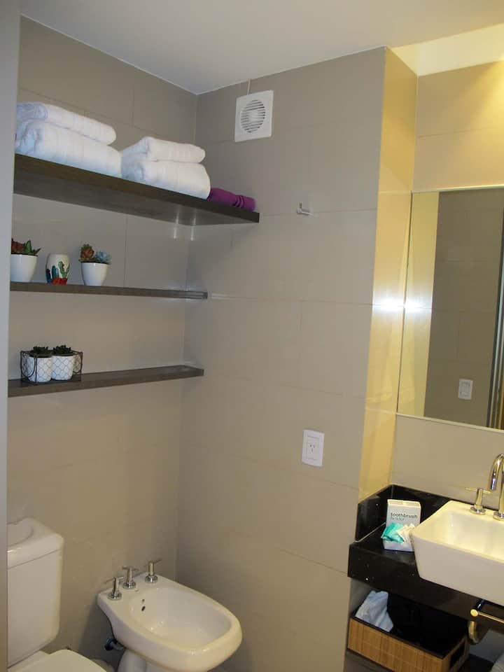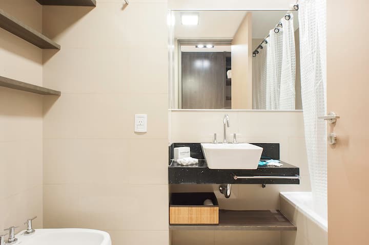 Квартира-студия в Palermo, с балконом. В здании есть бассейн и зона гриля, круглосуточная охрана. Кухня оборудована холодильником с морозильной камерой, тостером, микроволновой печью и соковыжималкой; также есть посуда на 6 человек и принадлежности для уборки, утюг и пылесос. В ванной установлена ванна, фен, полотенца. Предусмотрены спальные места: двуспальная кровать и диван, который может использоваться как 2 отдельных спальных места; есть 2 шкафа и обеденный стол на 4 человека. В стоимость вк