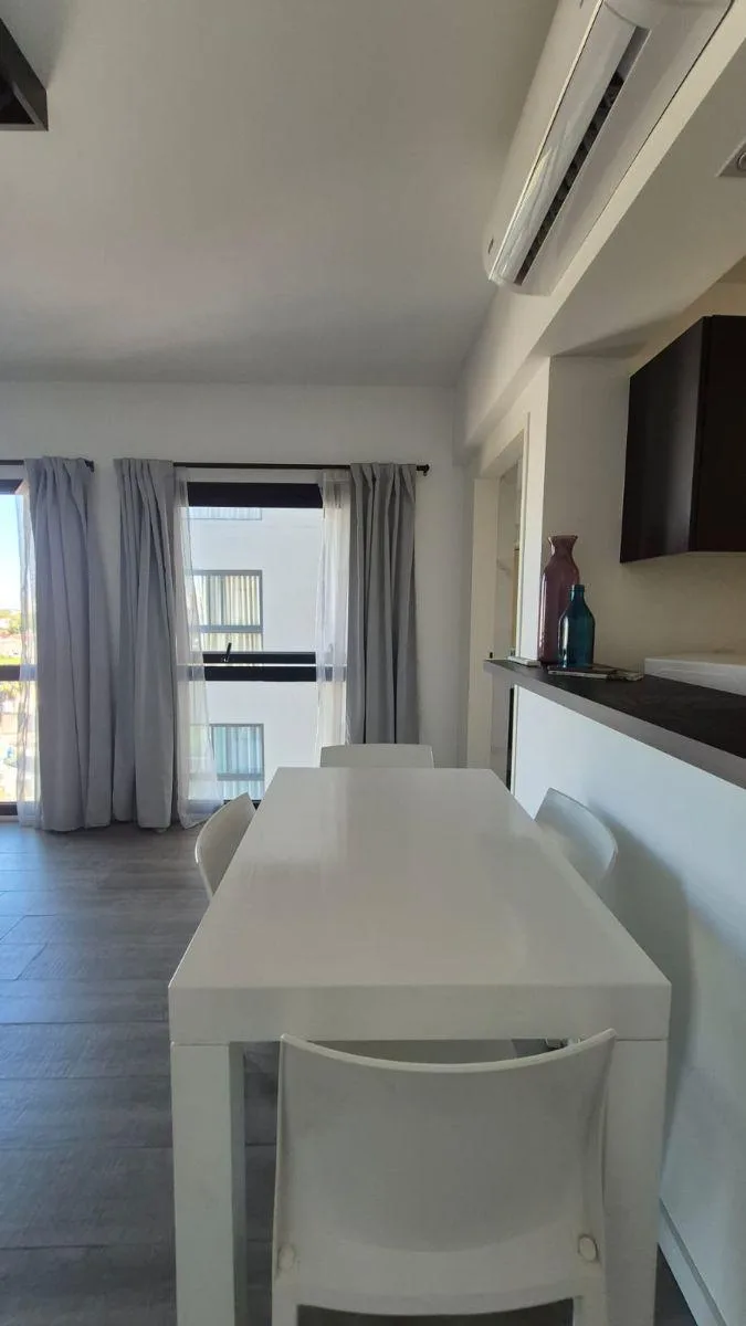 Квартира-студия с мебелью площадью 38 m², с зоной гостиной и столовой. Кухня оборудована; есть отдельная зона умывальника (antebaño) и полноценная ванная комната. В здании предусмотрены зона coworking с подключением к интернету и принтером, бассейн с подогревом и солярий, тренажёрный зал, общая гостиная для жильцов (SUM) и зона гриля, а также джакузи. Также заявлены круглосуточная охрана, прачечная, playroom, инфраструктура для телефонии, кабельного телевидения и интернета. Указаны монопаты для