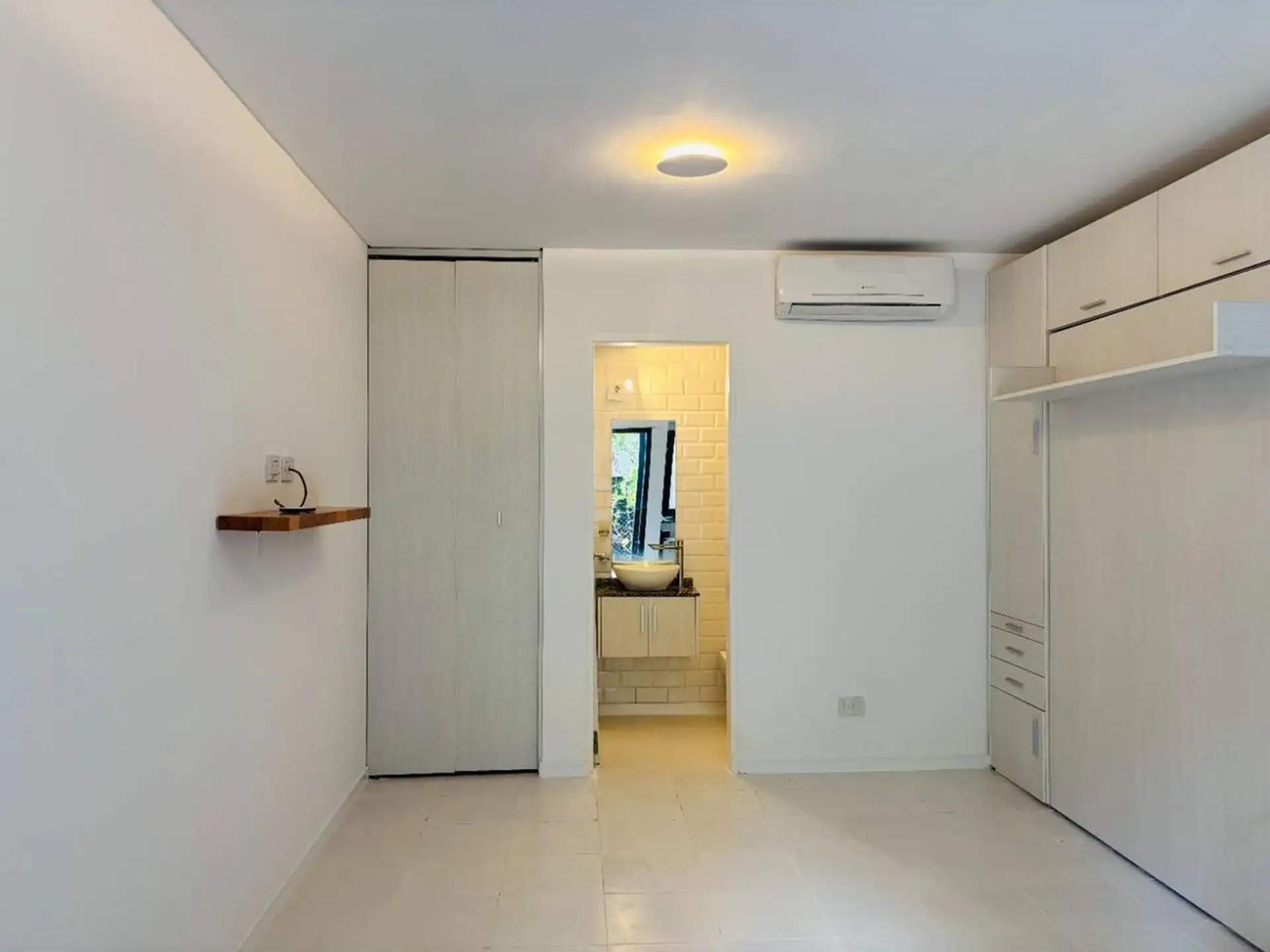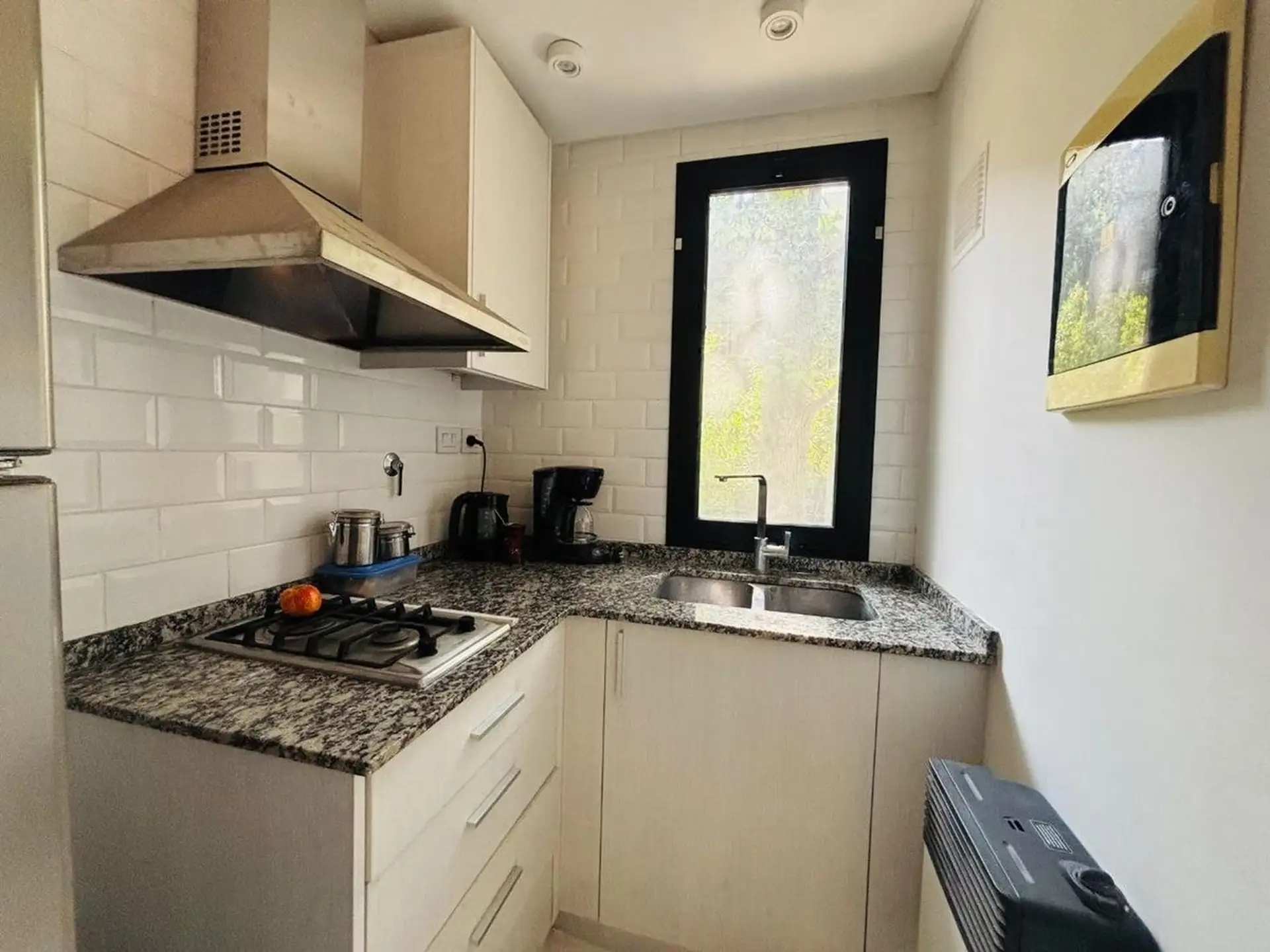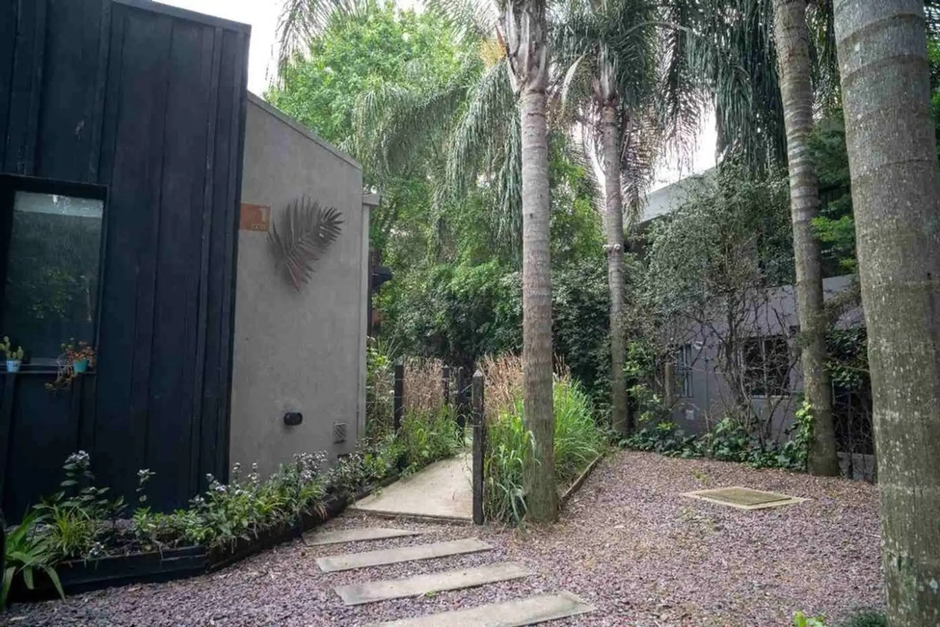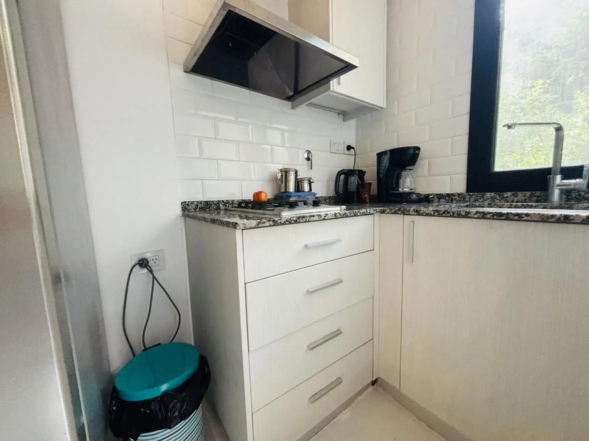Квартира-студия в цокольном/нижнем этаже в Barrio La Esmeralda, Pilar. Окна в передний двор; единое пространство с кухонной зоной, плитой (электрическая), столешницей и навесными шкафами. Полная ванная с душем. В квартире установлены автоматическая стиральная машина Samsung и электрический бойлер (caldera) для горячей воды, кондиционер split (холод/тепло). Планировка включает передний дворик, дорожку с деревянным настилом (deck) и внутреннее пространство с зеленью; в кондоминиуме предусмотрен ба