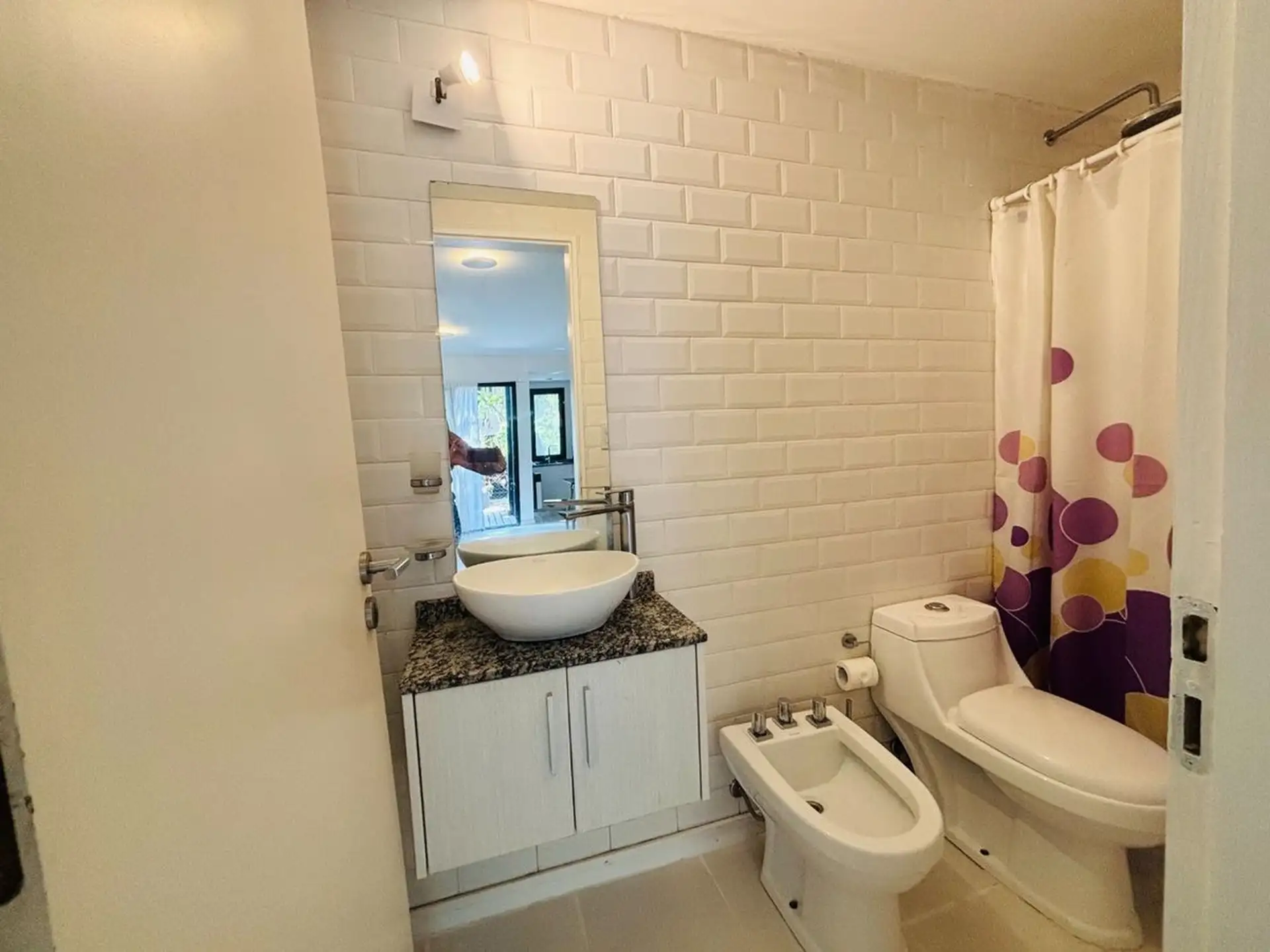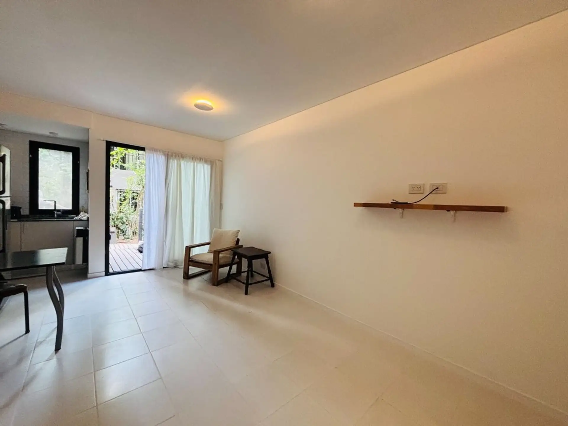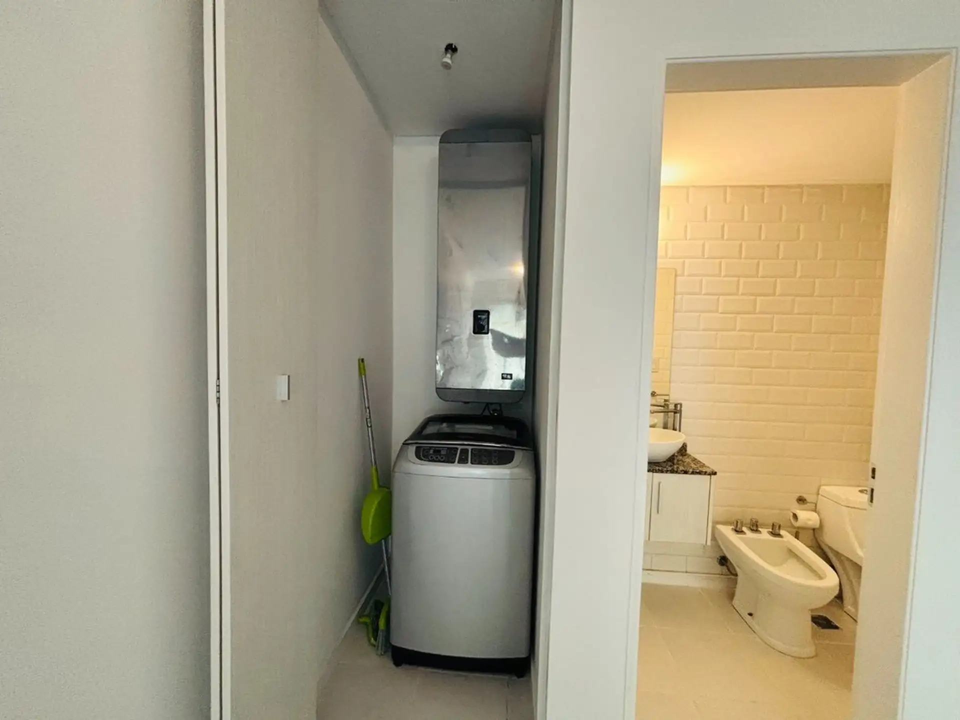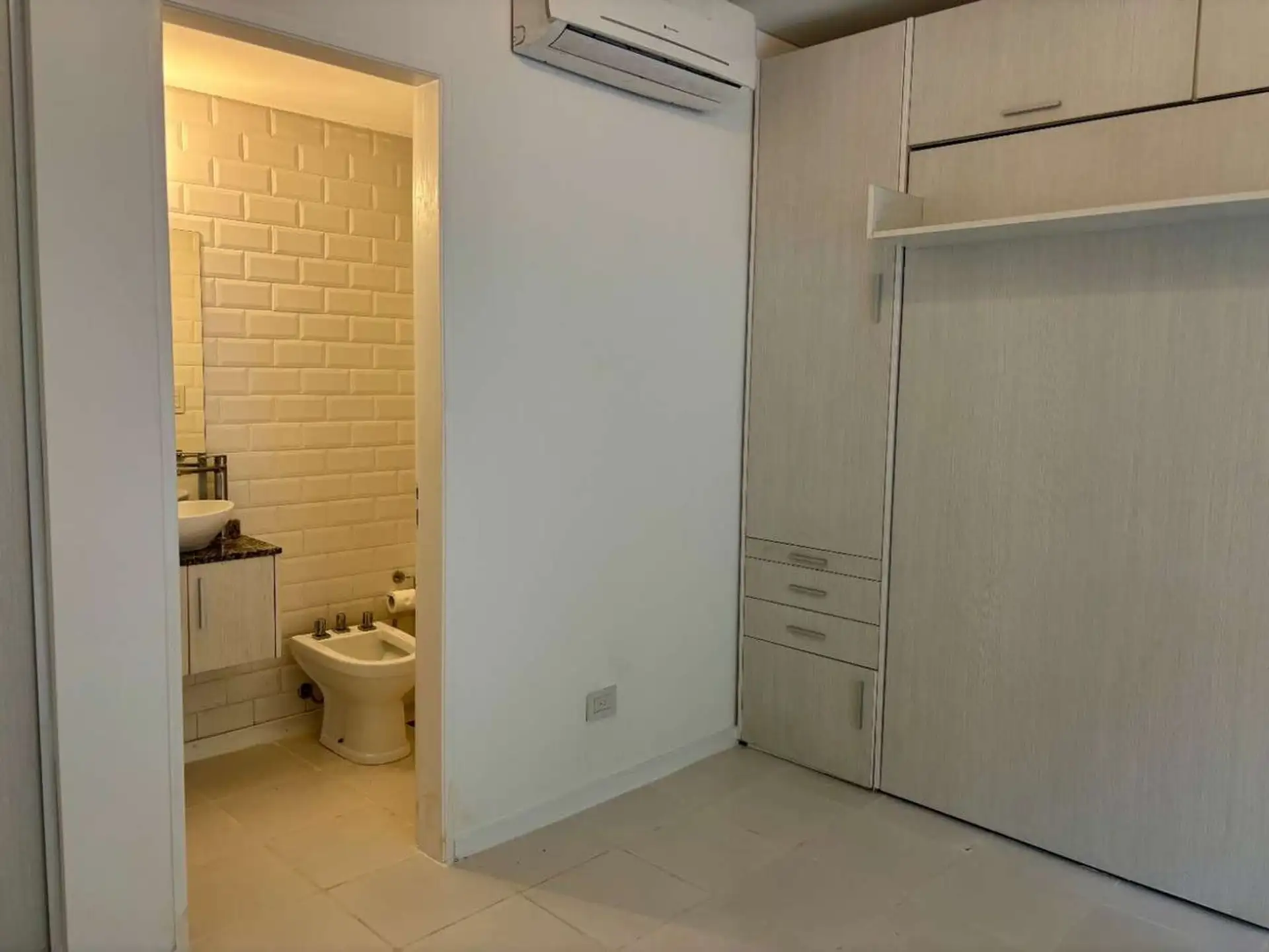 Квартира-студия в цокольном/нижнем этаже в Barrio La Esmeralda, Pilar. Окна в передний двор; единое пространство с кухонной зоной, плитой (электрическая), столешницей и навесными шкафами. Полная ванная с душем. В квартире установлены автоматическая стиральная машина Samsung и электрический бойлер (caldera) для горячей воды, кондиционер split (холод/тепло). Планировка включает передний дворик, дорожку с деревянным настилом (deck) и внутреннее пространство с зеленью; в кондоминиуме предусмотрен ба