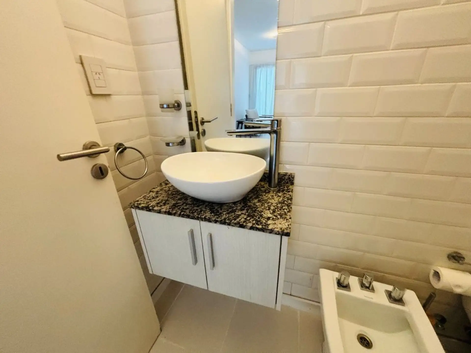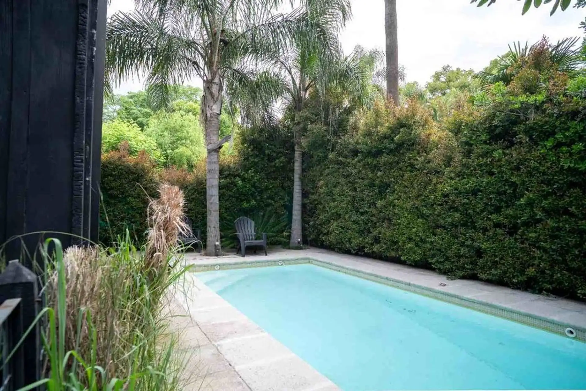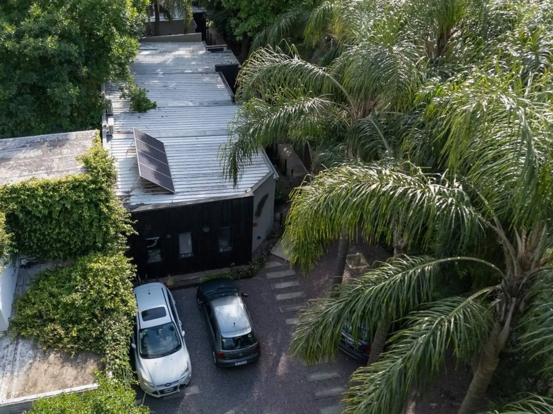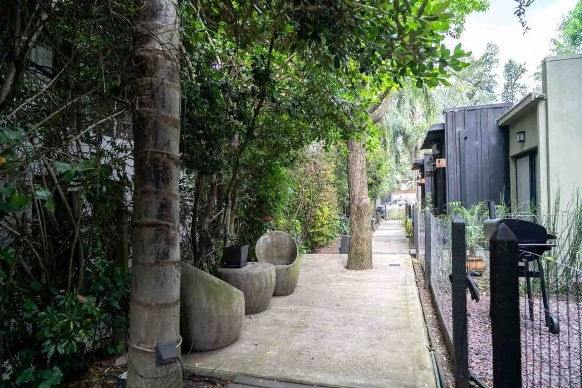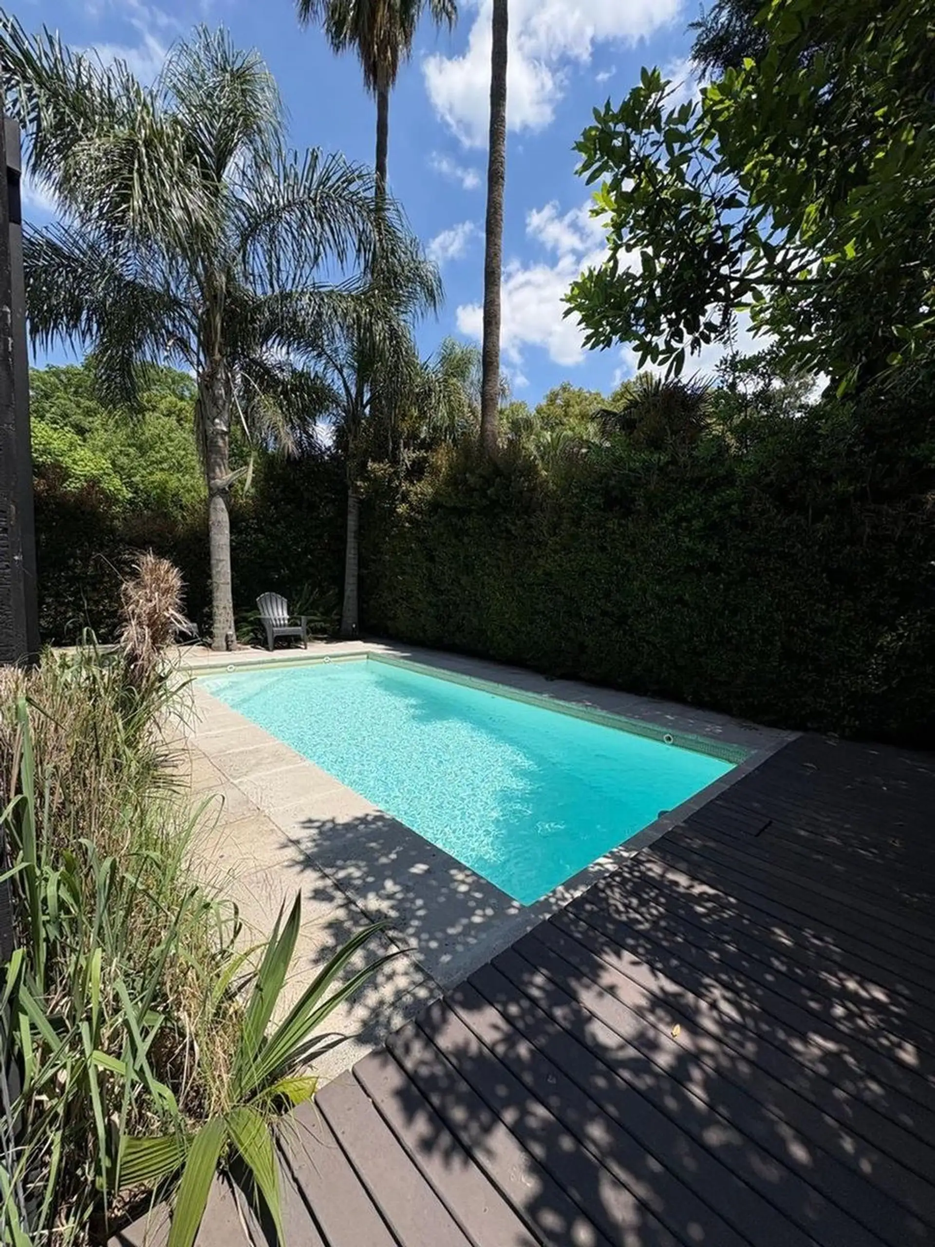 Квартира-студия в цокольном/нижнем этаже в Barrio La Esmeralda, Pilar. Окна в передний двор; единое пространство с кухонной зоной, плитой (электрическая), столешницей и навесными шкафами. Полная ванная с душем. В квартире установлены автоматическая стиральная машина Samsung и электрический бойлер (caldera) для горячей воды, кондиционер split (холод/тепло). Планировка включает передний дворик, дорожку с деревянным настилом (deck) и внутреннее пространство с зеленью; в кондоминиуме предусмотрен ба