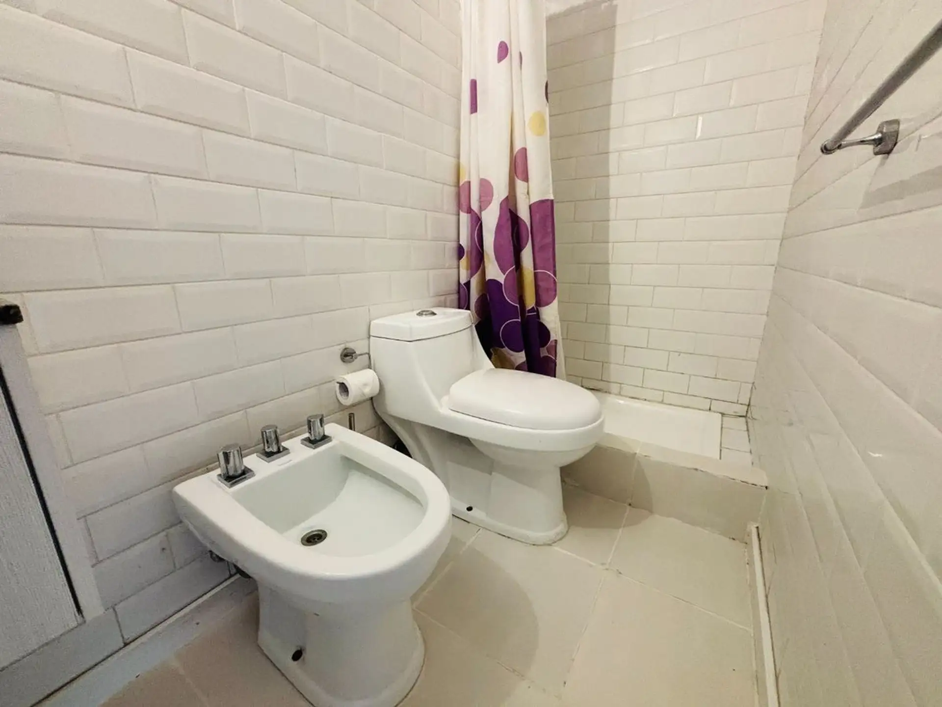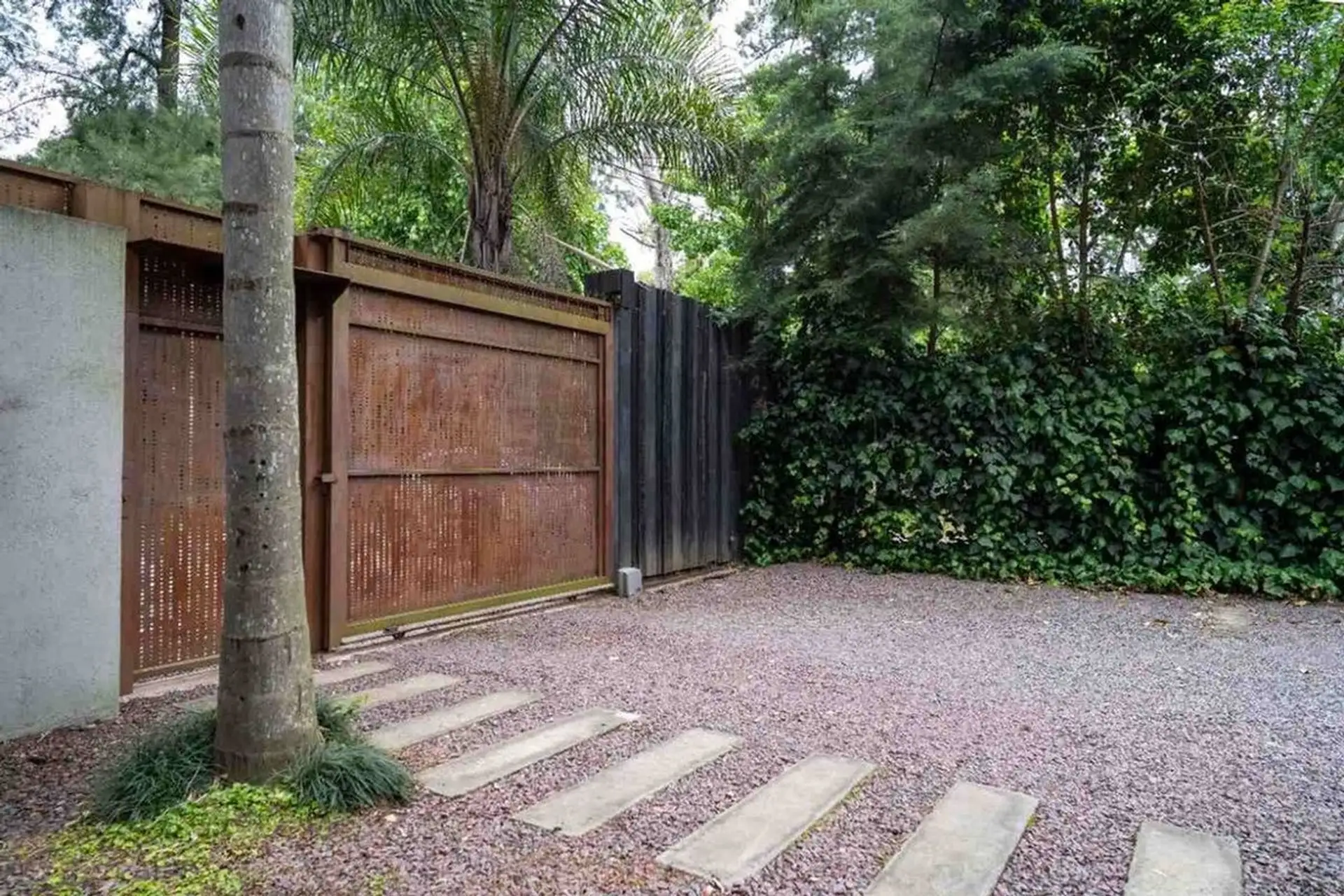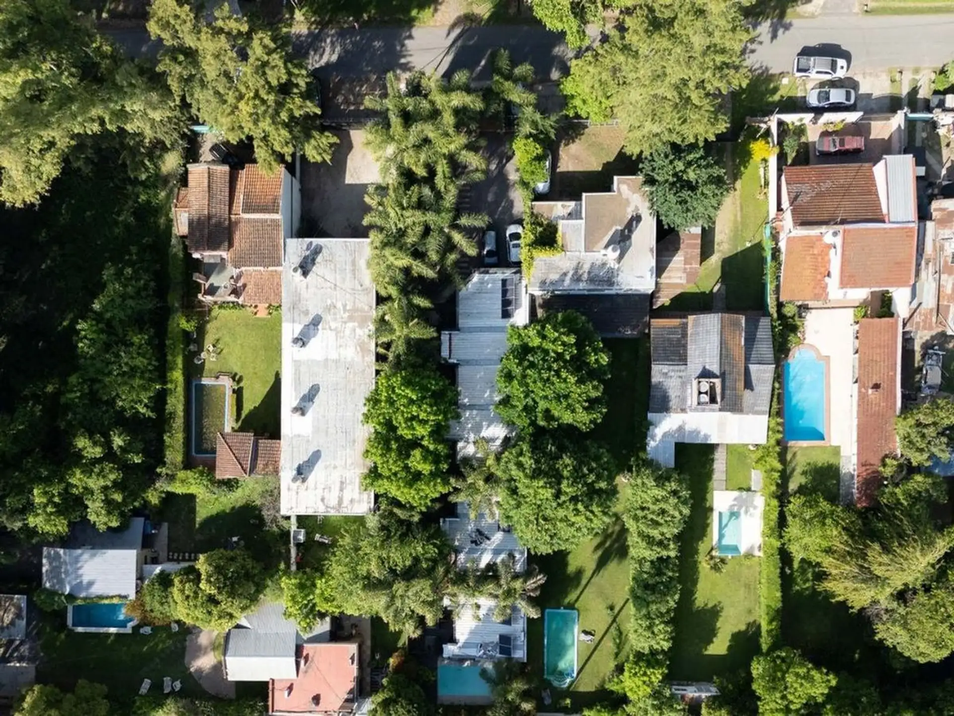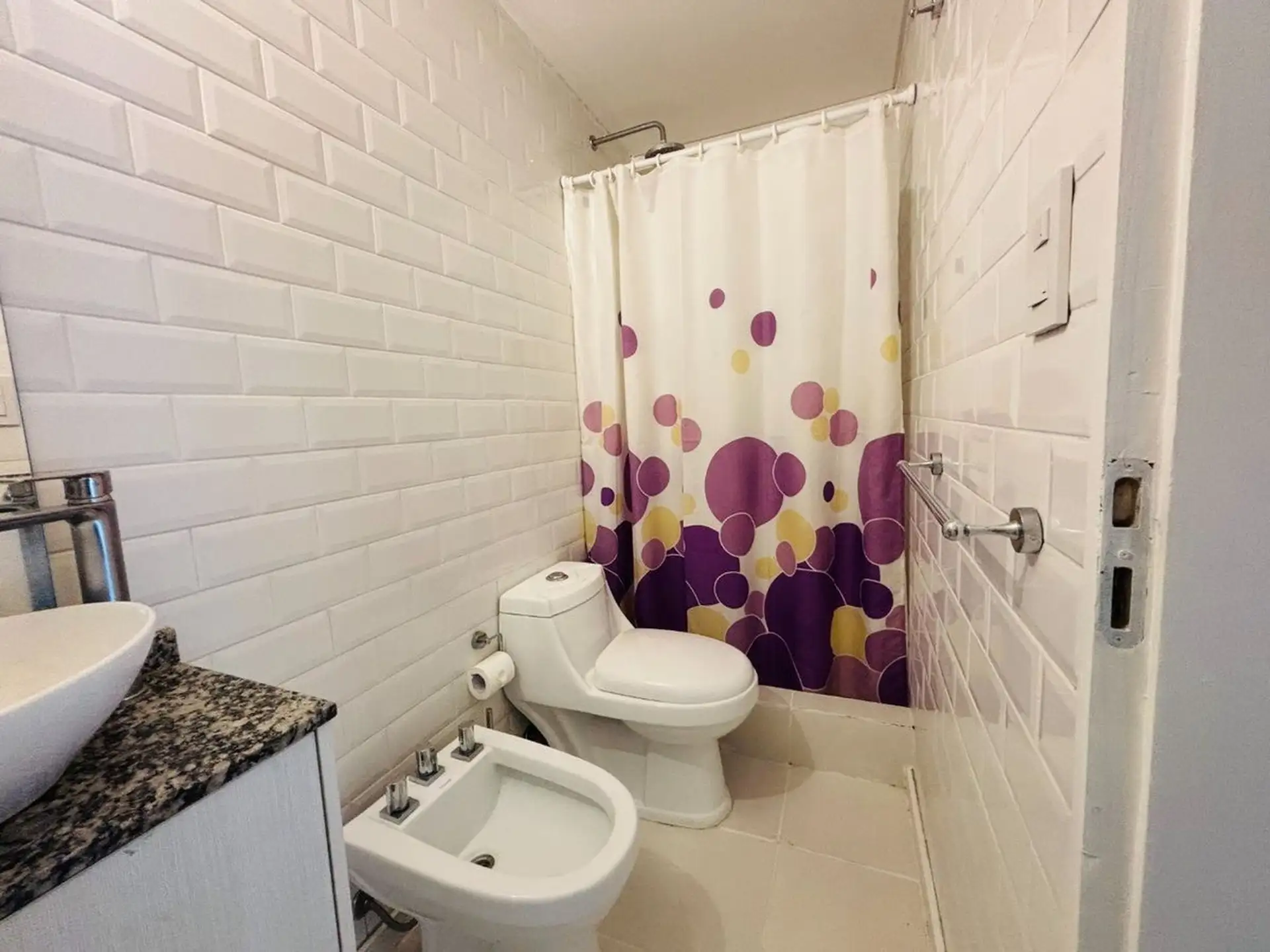 Квартира-студия в цокольном/нижнем этаже в Barrio La Esmeralda, Pilar. Окна в передний двор; единое пространство с кухонной зоной, плитой (электрическая), столешницей и навесными шкафами. Полная ванная с душем. В квартире установлены автоматическая стиральная машина Samsung и электрический бойлер (caldera) для горячей воды, кондиционер split (холод/тепло). Планировка включает передний дворик, дорожку с деревянным настилом (deck) и внутреннее пространство с зеленью; в кондоминиуме предусмотрен ба