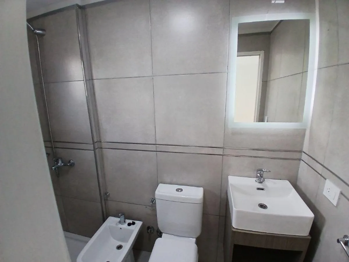 Квартира-студия в Quilmes Centro, новая (никто не жил). Окна выходят на улицу; входная дверь с защитой. В отделке: керамогранит, алюминиевые профили с DVH. Кухонная мебель включает нижние шкафы и навесные элементы, варочную поверхность, электрическую духовку и вытяжку; полностью оборудованная ванная комната. Установлен кондиционер. На общей террасе предусмотрены дополнительный санузел и душ в зоне солярия. Указан адрес: Videla 81, между H. Yrigoyen и San Martín.