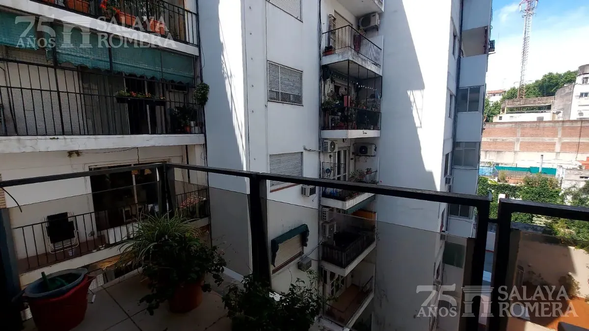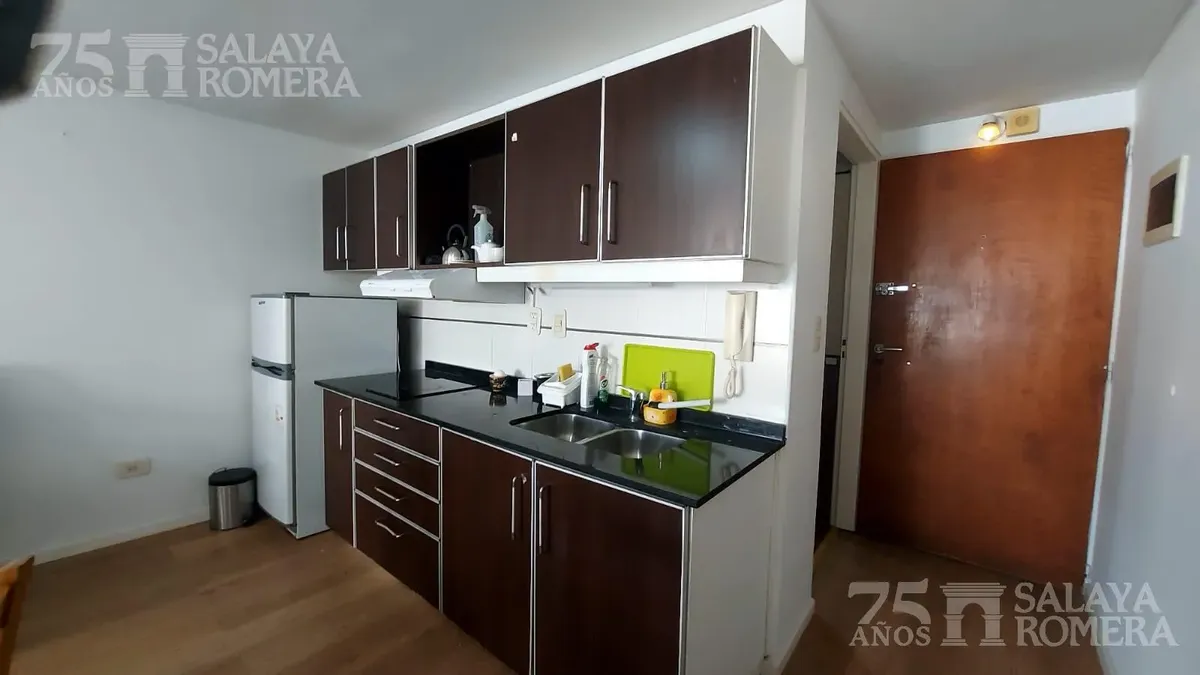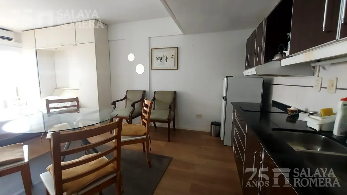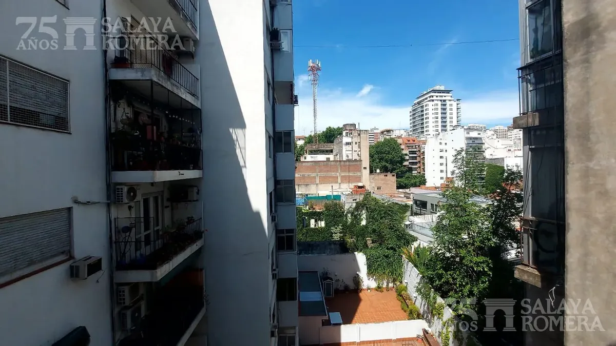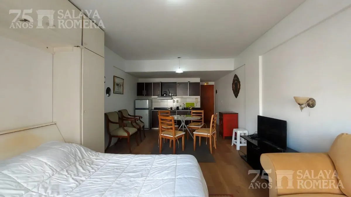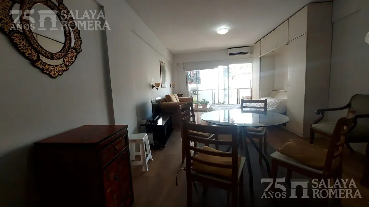 Квартира-студия площадью не указана в Recoleta, с балконом во внутренний двор квартала (pulmón de manzana). Окна выходят на зелёную зону, указано, что в помещении тихо. Кухня американского типа с комплектом верхних и нижних шкафов, холодильник входит в оснащение. Ванная комната с ванной. Пространство зонировано: двуспальная кровать с откидным механизмом и зона гостиной с диваном, столом и стульями; в здании предусмотрена общая прачечная (laundry). Сдаётся с мебелью; в аренде не разрешены домашни