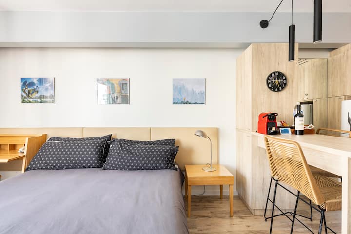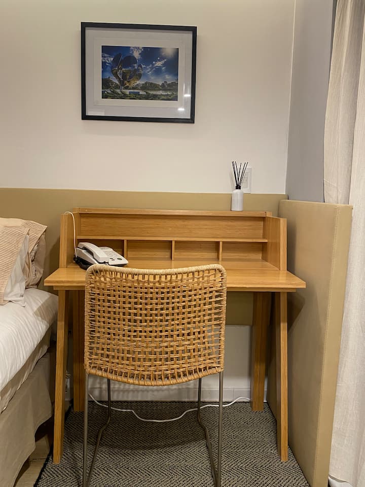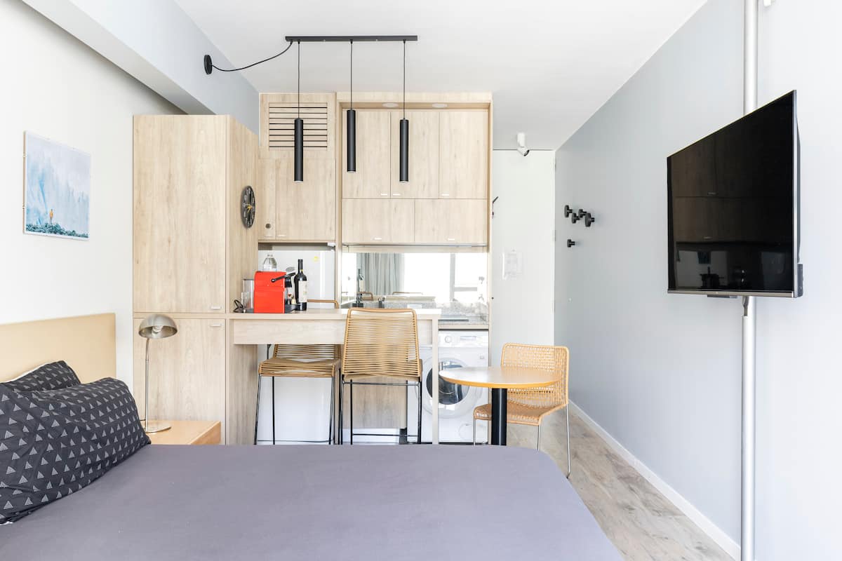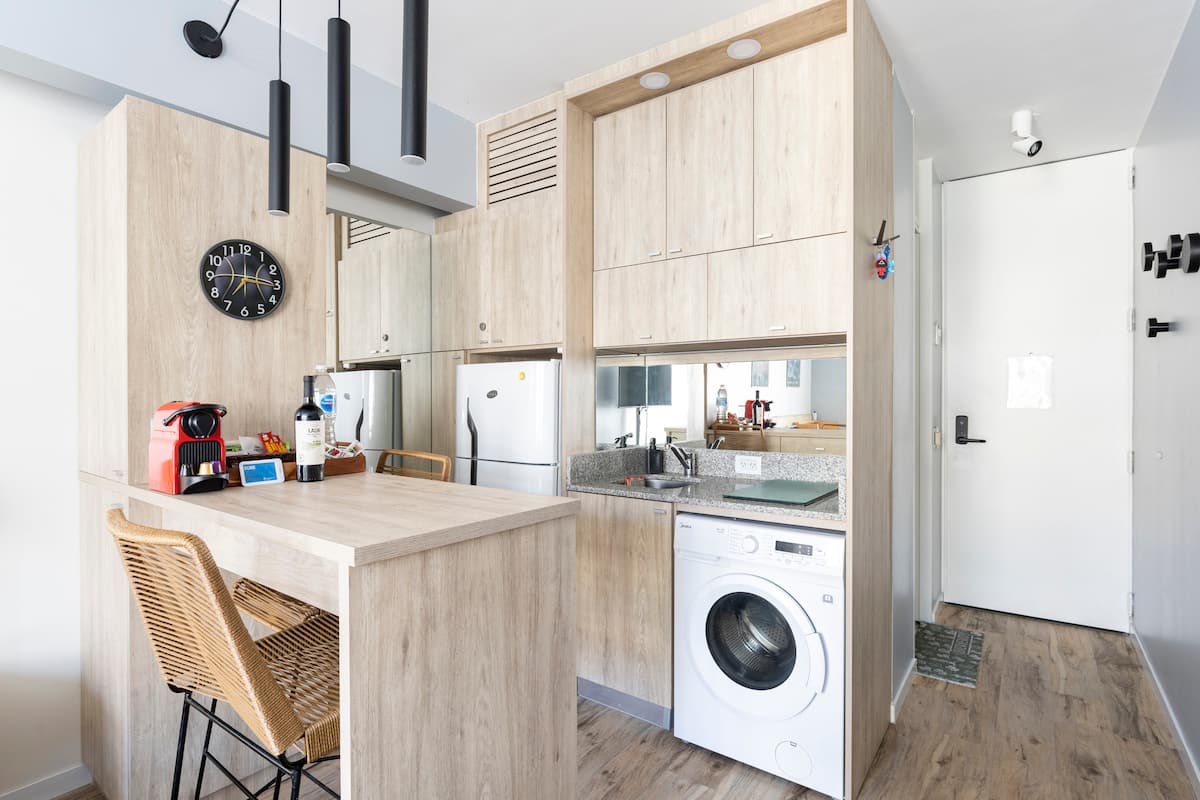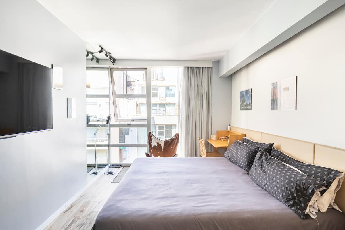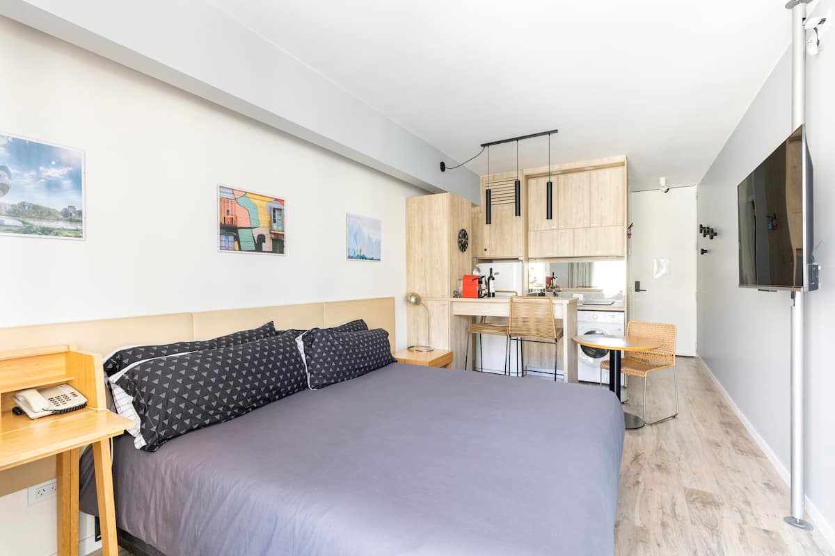 Квартира-студия площадью 24 m² в Recoleta. Предусмотрено место для работы, окна на улицу. Студия с мебелью и полностью оборудованной кухней, холодильником и телевизором Full HD с Android, есть фен и набор для душа. В стоимость включена круглосуточная рецепция; в здании предусмотрен просторный вестибюль на первом этаже. Упоминается расположение: 1 квартал от Av. Santa Fe.