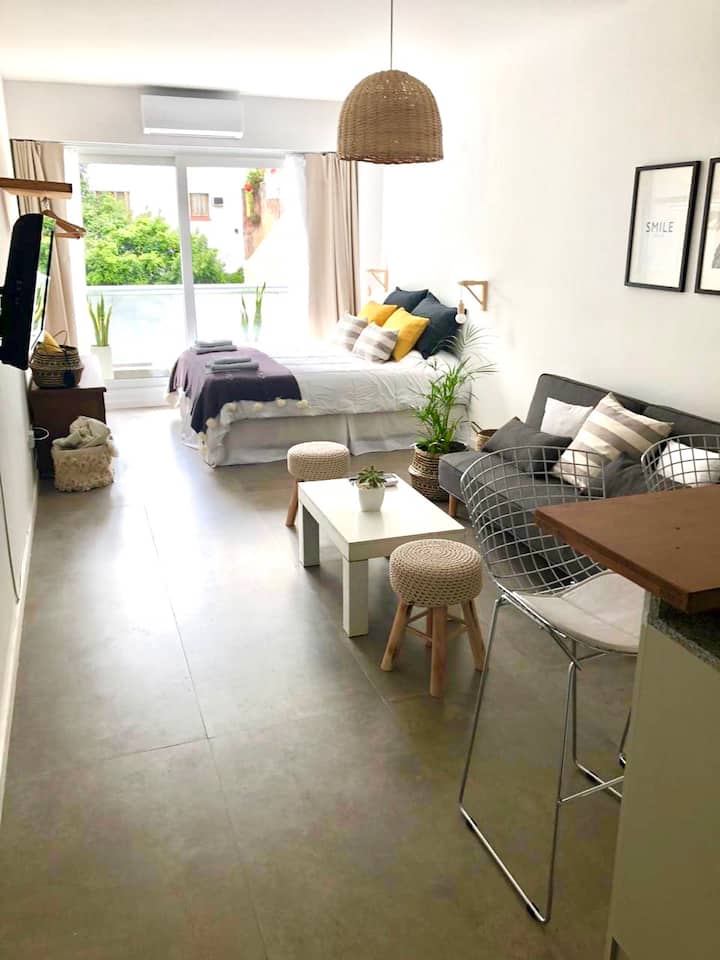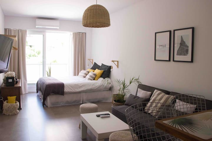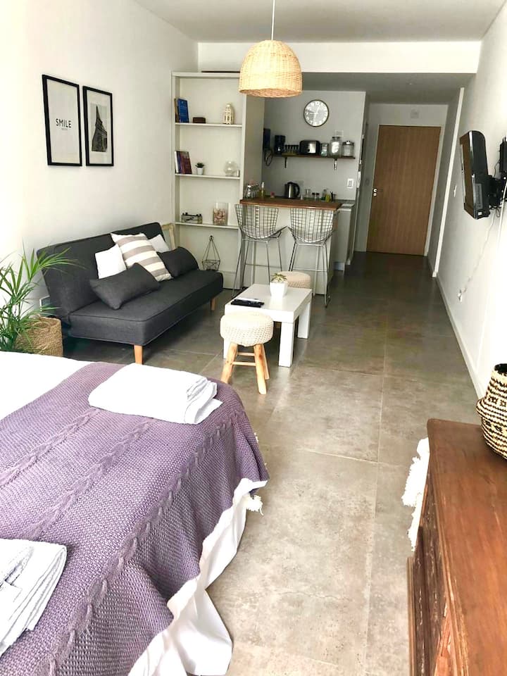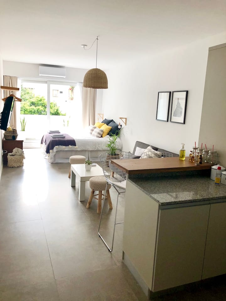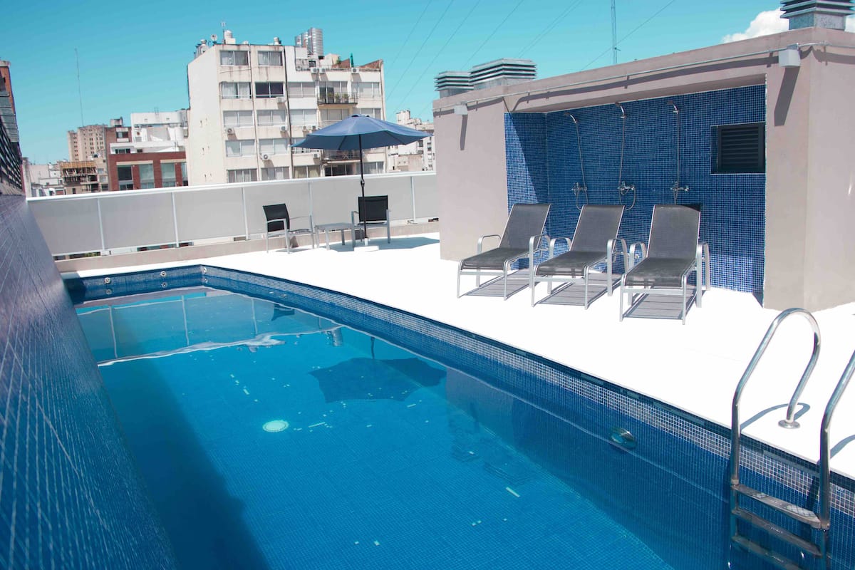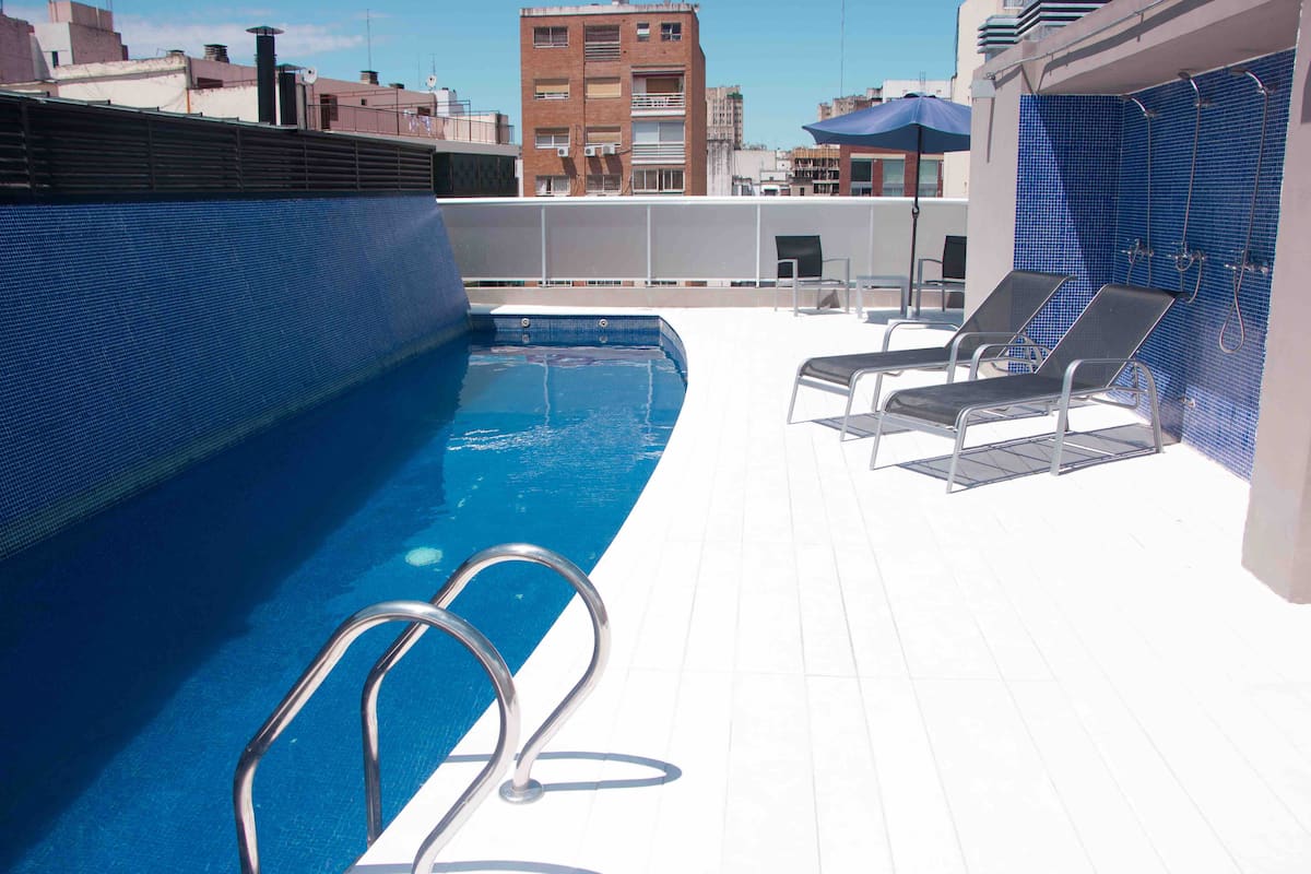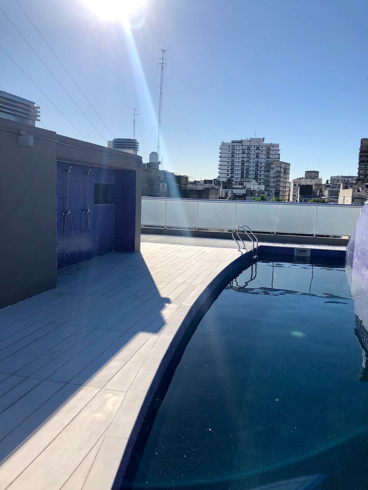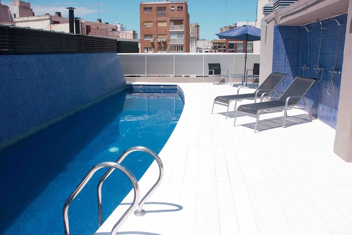Квартира-студия в Recoleta с балконом, с мебелью и оборудованием. В студии установлен диван-кровать и кровать размера queen, отдельная зона кухни с барной стойкой и полноценная ванная комната. В общих помещениях есть бассейн; на террасе нет шезлонгов, солнцезащитных лежаков и зонта, предоставляются 2 отдельных шезлонга. В описании указаны бесплатный Wi-Fi и телевизор, а также центральное водоснабжение и электрическое отопление; адресные ориентиры: один квартал от Av. Santa Fe и Av. Pueyrredon, с