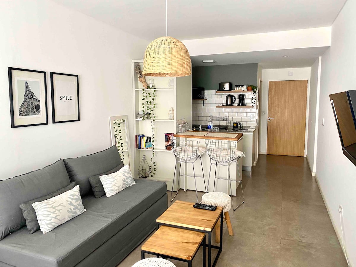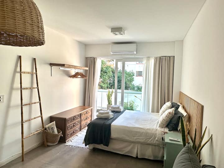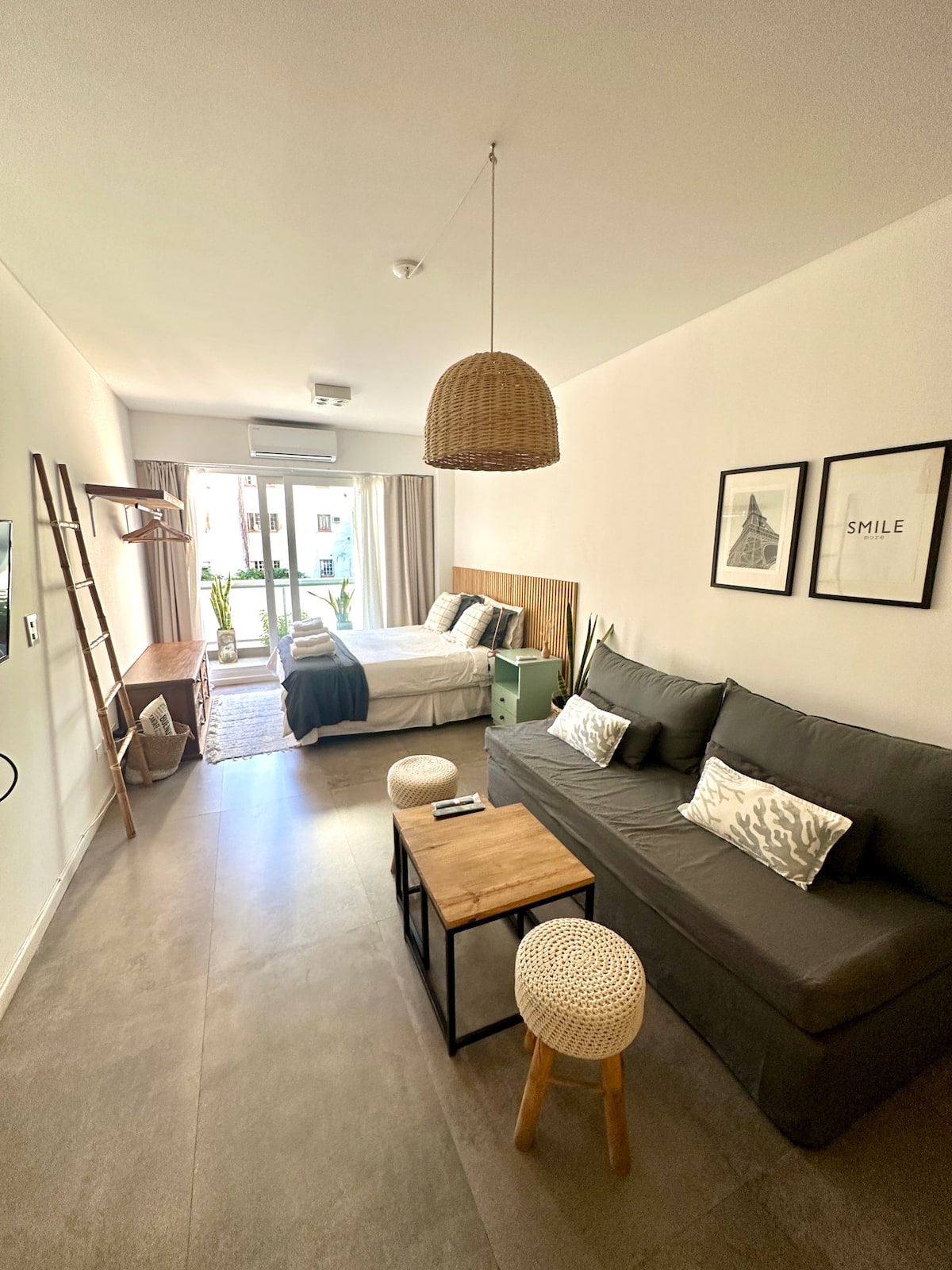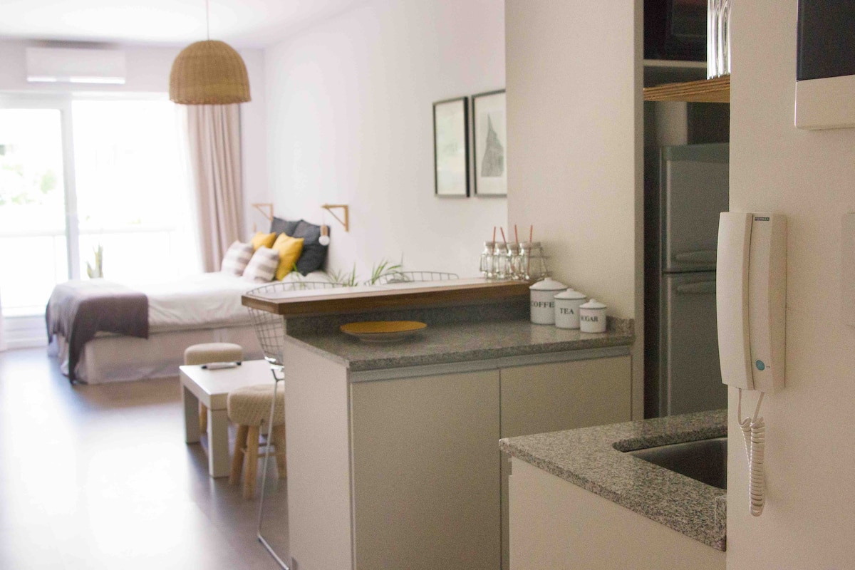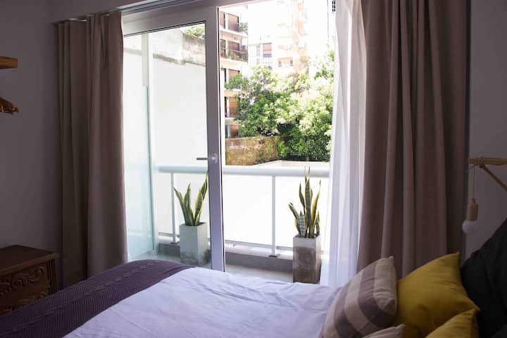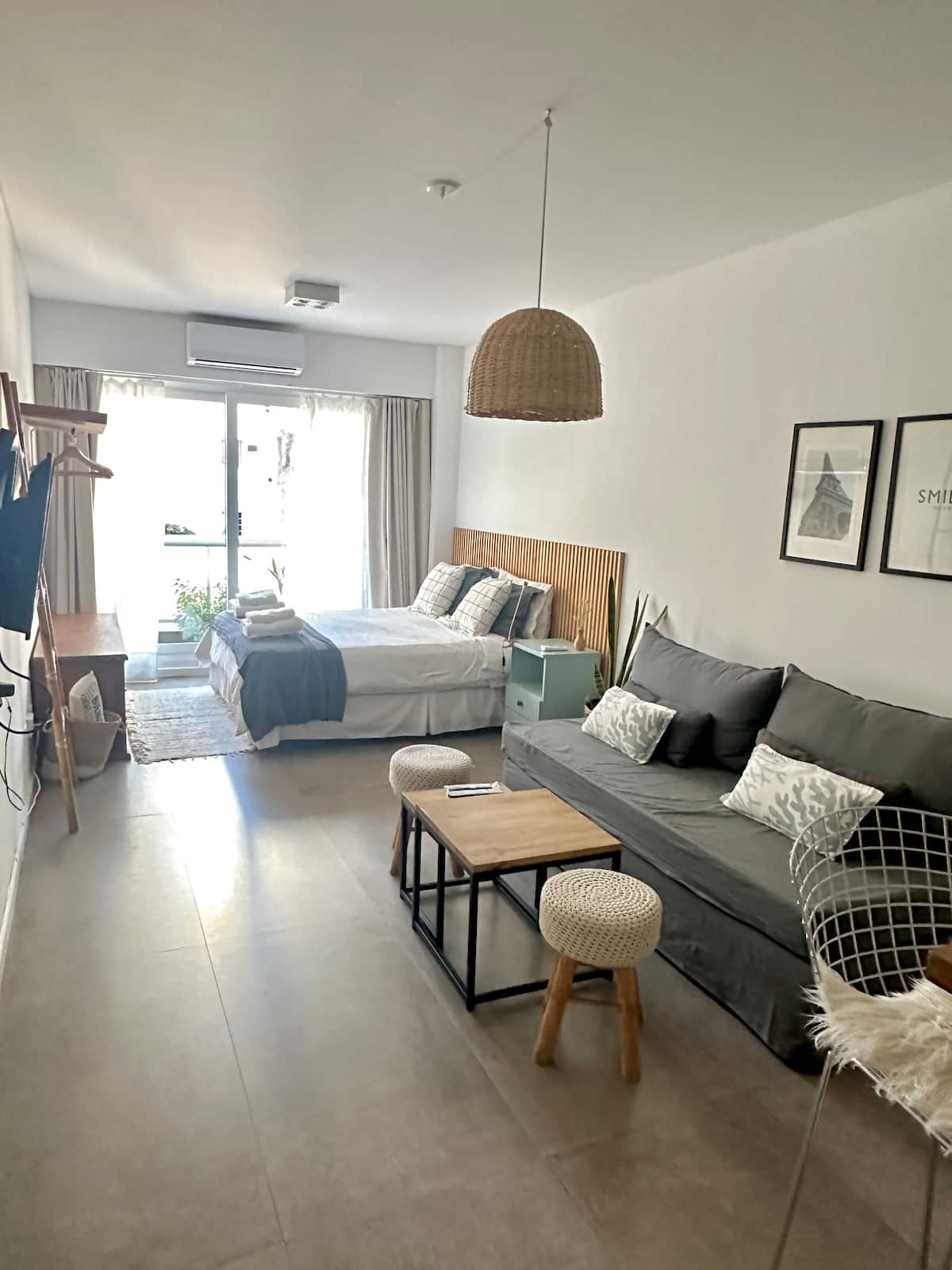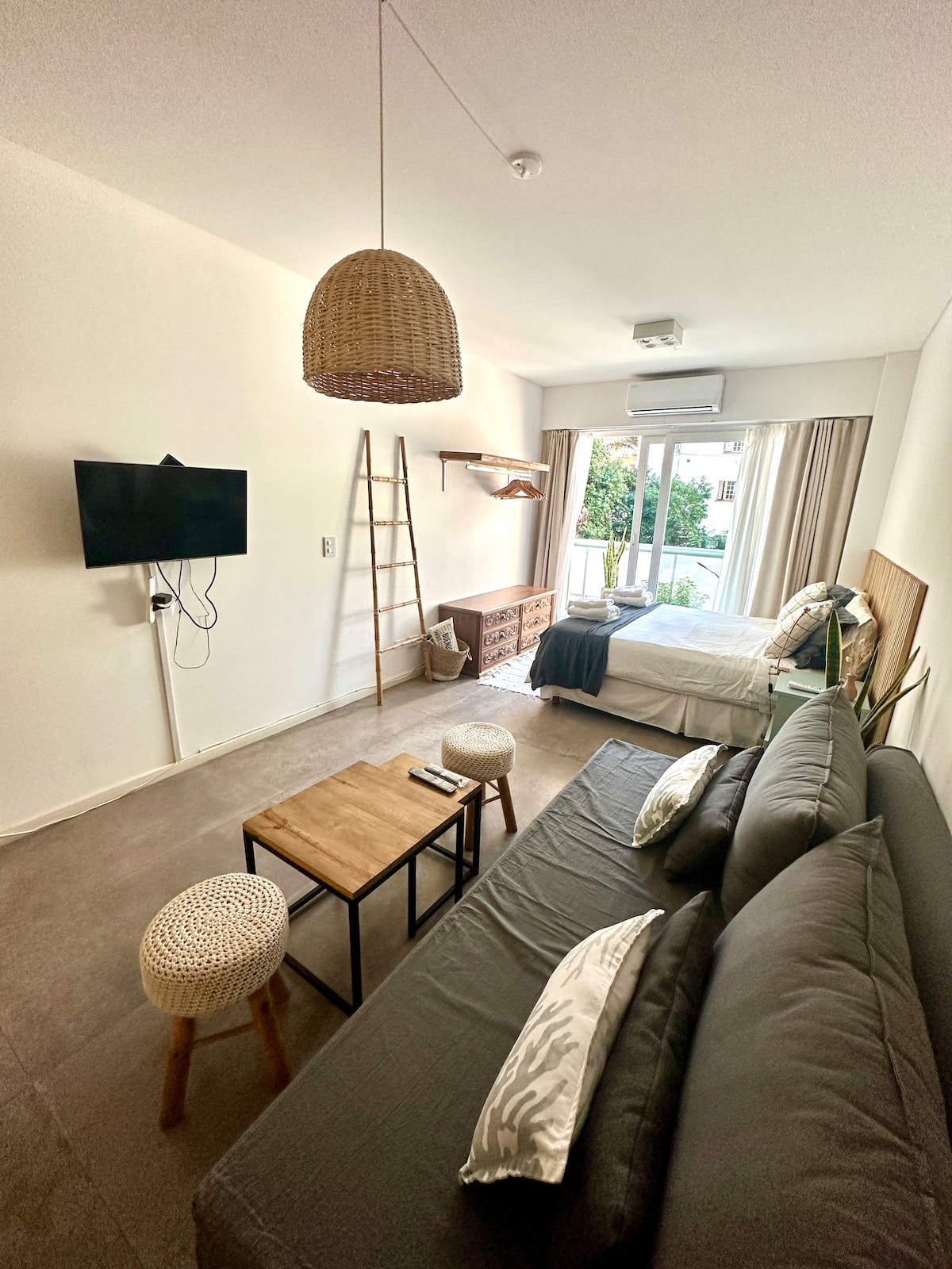 Квартира-студия в Recoleta с балконом, с мебелью и оборудованием. В студии установлен диван-кровать и кровать размера queen, отдельная зона кухни с барной стойкой и полноценная ванная комната. В общих помещениях есть бассейн; на террасе нет шезлонгов, солнцезащитных лежаков и зонта, предоставляются 2 отдельных шезлонга. В описании указаны бесплатный Wi-Fi и телевизор, а также центральное водоснабжение и электрическое отопление; адресные ориентиры: один квартал от Av. Santa Fe и Av. Pueyrredon, с