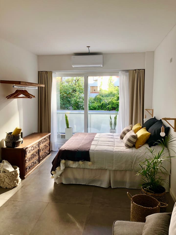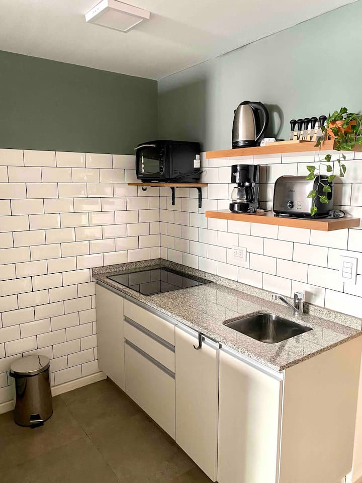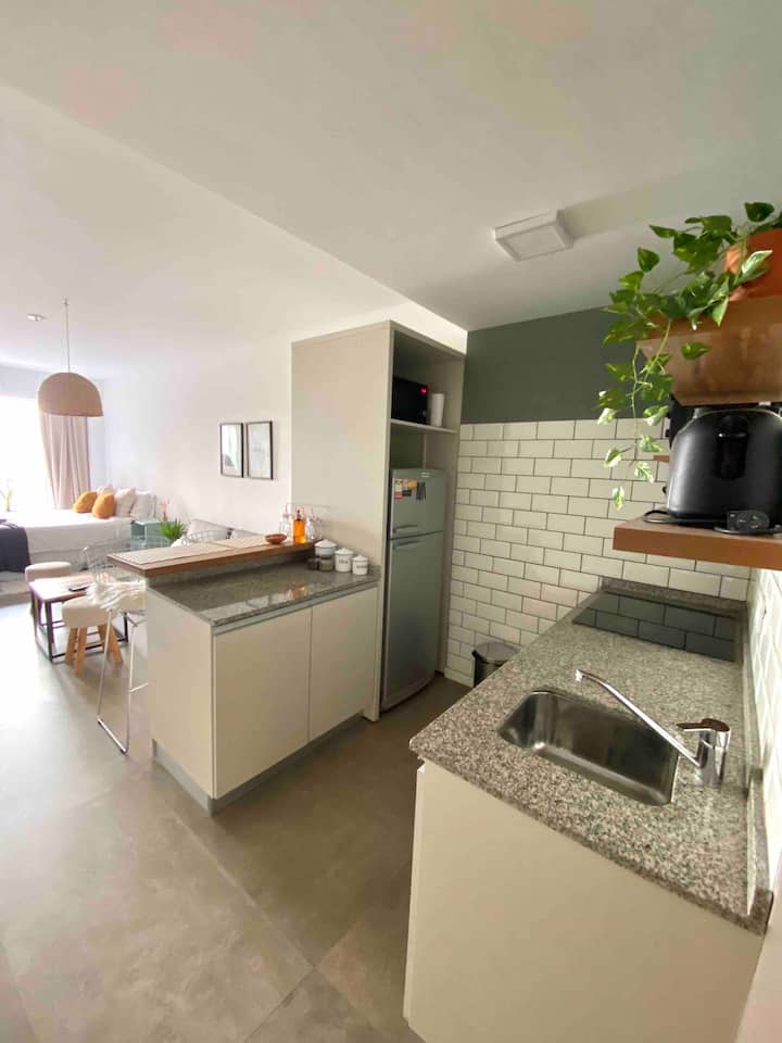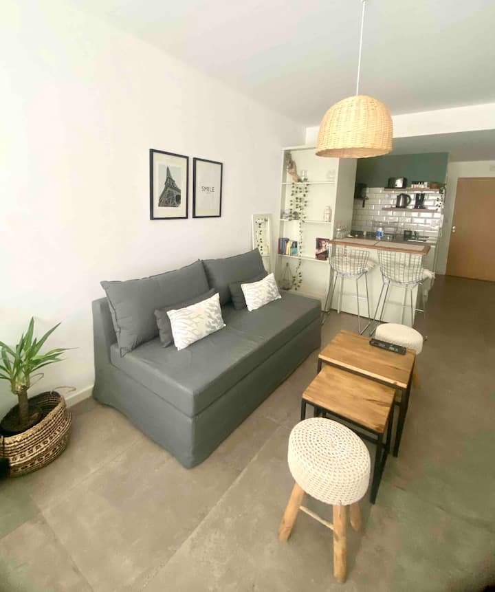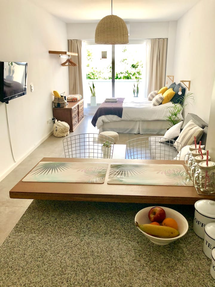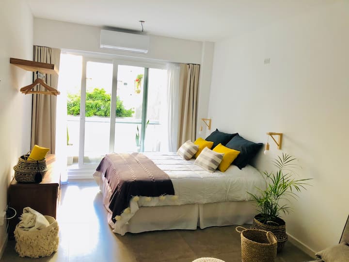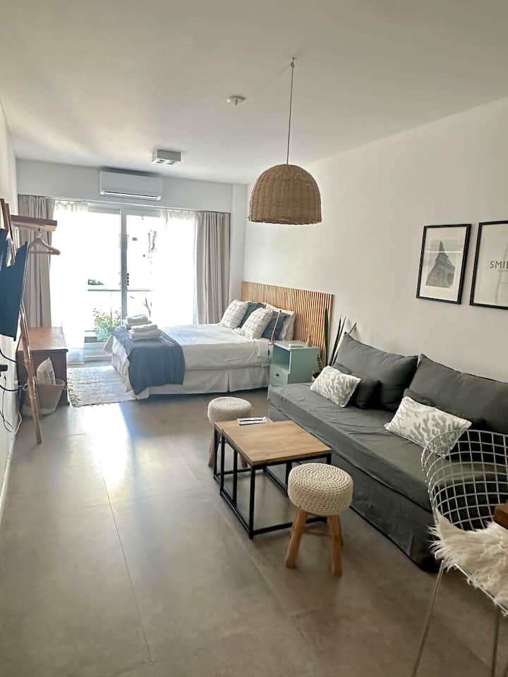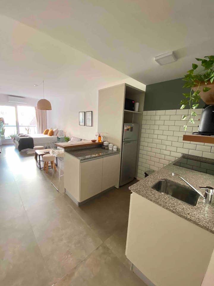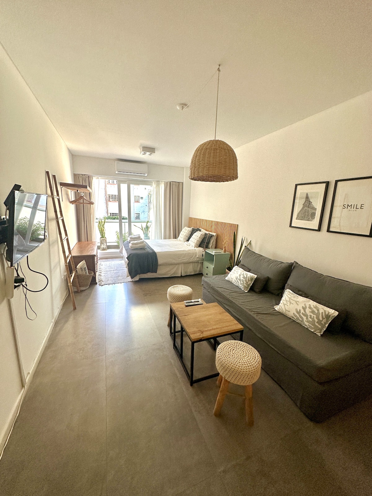 Квартира-студия в Recoleta с балконом, с мебелью и оборудованием. В студии установлен диван-кровать и кровать размера queen, отдельная зона кухни с барной стойкой и полноценная ванная комната. В общих помещениях есть бассейн; на террасе нет шезлонгов, солнцезащитных лежаков и зонта, предоставляются 2 отдельных шезлонга. В описании указаны бесплатный Wi-Fi и телевизор, а также центральное водоснабжение и электрическое отопление; адресные ориентиры: один квартал от Av. Santa Fe и Av. Pueyrredon, с