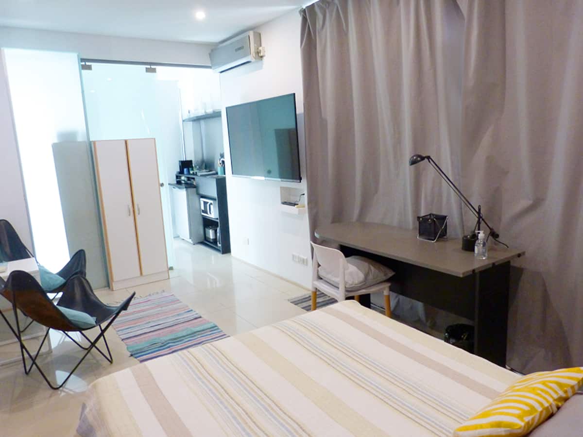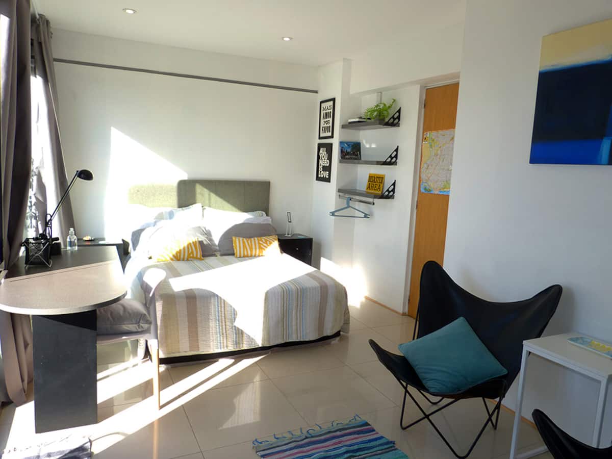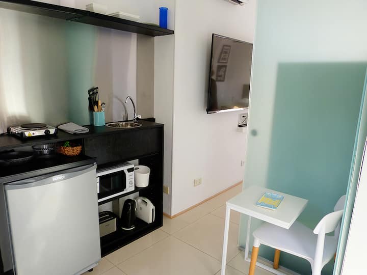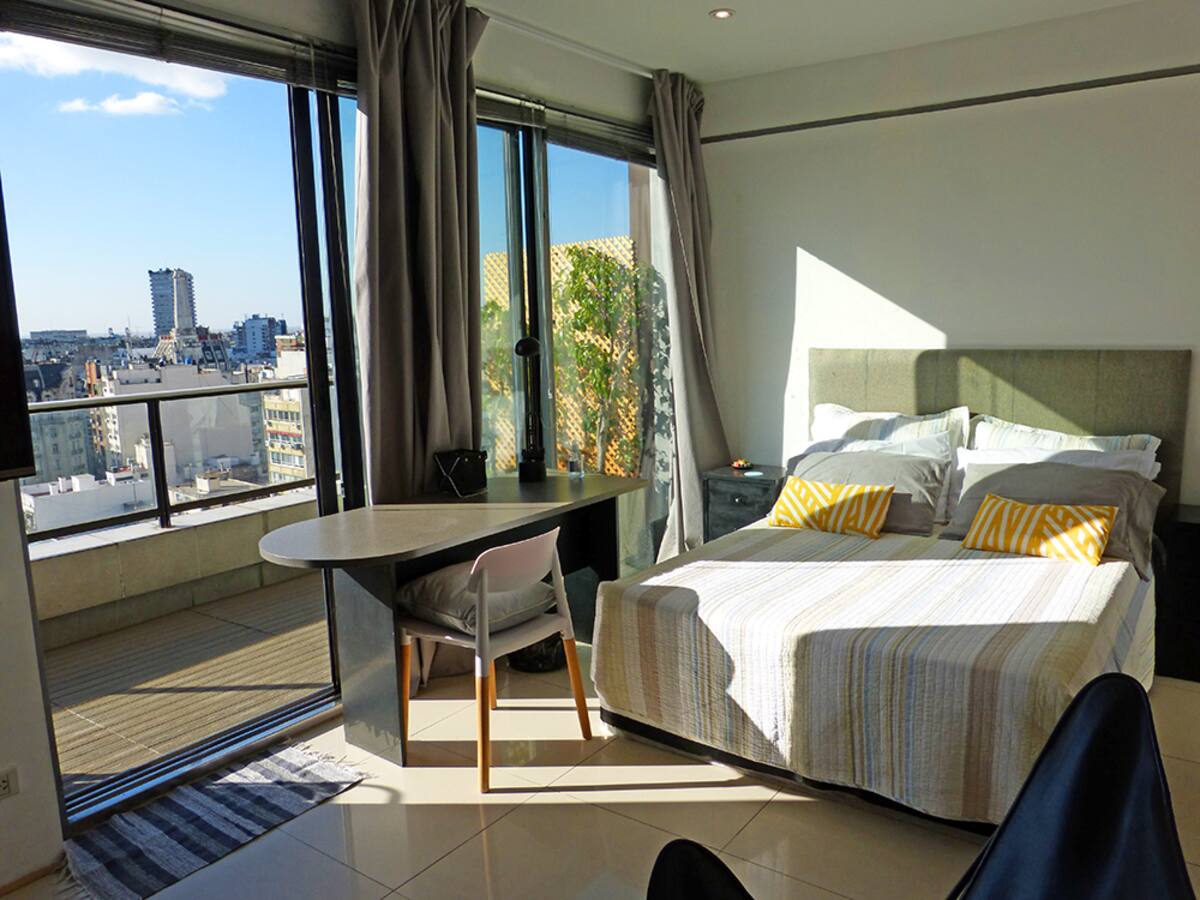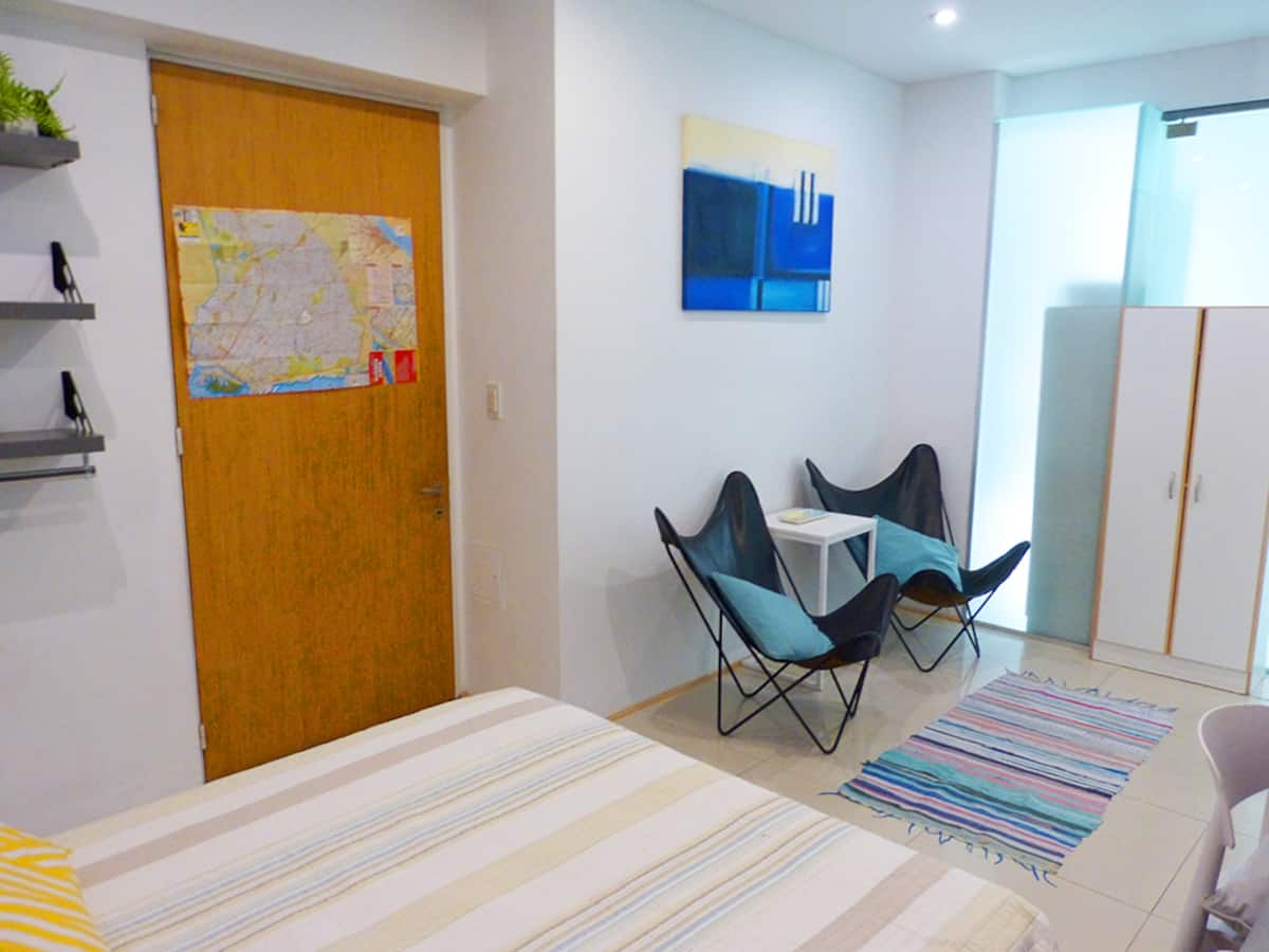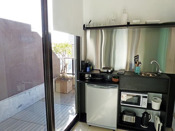 Квартира-студия в Recoleta с кроватью double bed, кондиционером и отоплением. Встроены центральное водоснабжение, Wi‑Fi и телевизор 60", кухня с anafe, кофемашиной Nespresso, морозильной камерой и тостером, ванная с душем. На террасе предусмотрен балкон с видом на город. В здании работают круглосуточная охрана, бассейн, сады, сауна и прачечная.