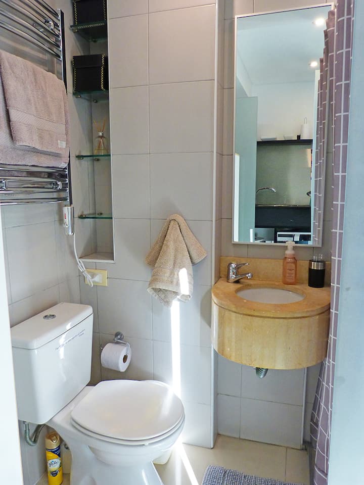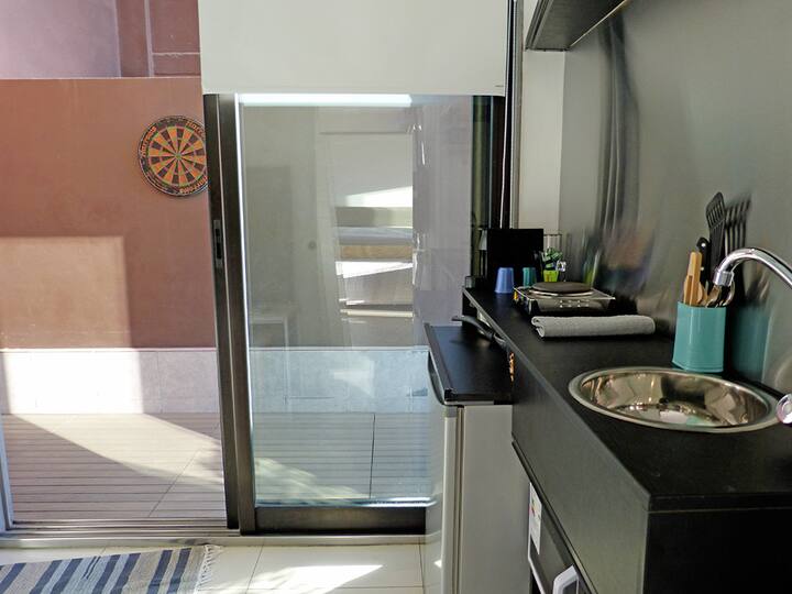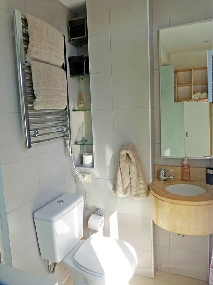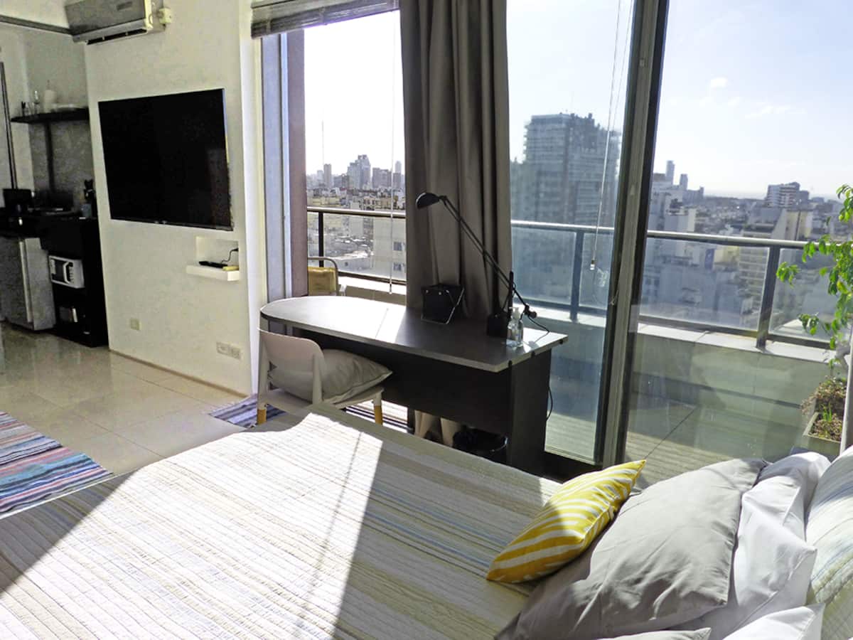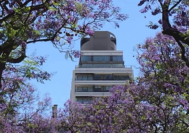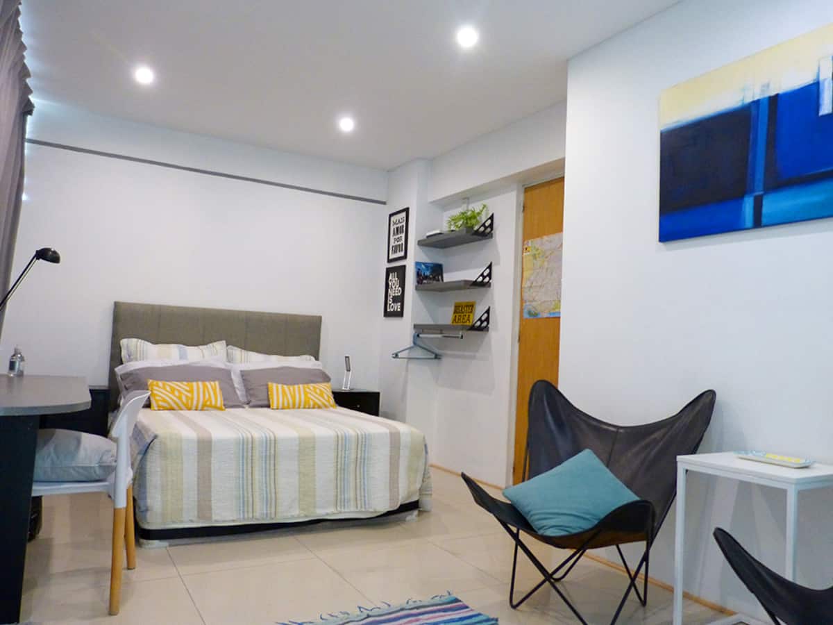 Квартира-студия в Recoleta с кроватью double bed, кондиционером и отоплением. Встроены центральное водоснабжение, Wi‑Fi и телевизор 60", кухня с anafe, кофемашиной Nespresso, морозильной камерой и тостером, ванная с душем. На террасе предусмотрен балкон с видом на город. В здании работают круглосуточная охрана, бассейн, сады, сауна и прачечная.