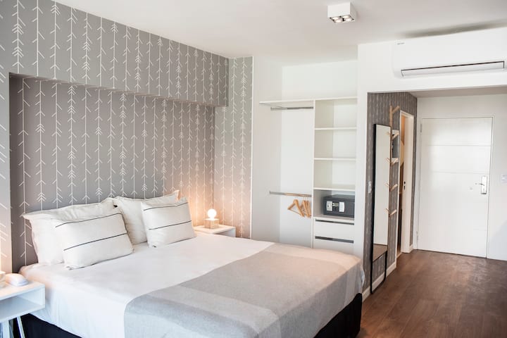 Квартира-студия в Retiro, категория здания, окна на улицу с видом с низкого этажа. Кухня объединена с жилым пространством, есть отдельная ванная комната. В здании предусмотрены бассейн, сауна и высокоскоростной Wi‑Fi в общих зонах, также работает охрана и контролируемый доступ 24 часа в сутки. Уборка квартиры включена начиная с 5-й ночи проживания; при более длительном сроке уборка проводится еженедельно.