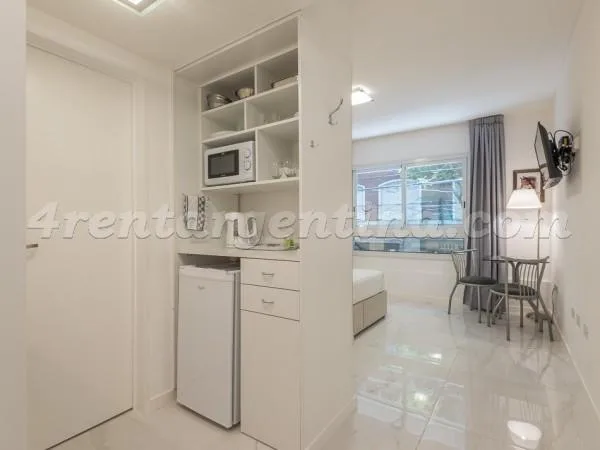 Квартира-студия площадью для временного проживания в Recoleta рассчитана на 2 человека. В апартаментах двуспальная кровать, окна на улицу с двойными стеклопакетами, kitchenette и ванная с душем. Есть кондиционер (холод/тепло), Smart TV и кабельное HD, Wi‑Fi, электрический чайник, кофеварка, тостер, микроволновая печь, электрическая духовка и конфорка, утюг, фен, постельные принадлежности и полотенца. В здании предусмотрены камеры видеонаблюдения, подъёмник, терраса и solárium. В стоимость включе