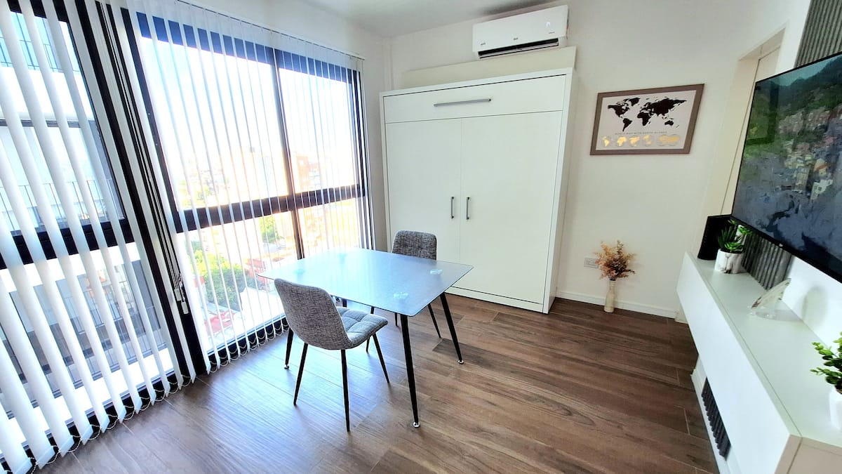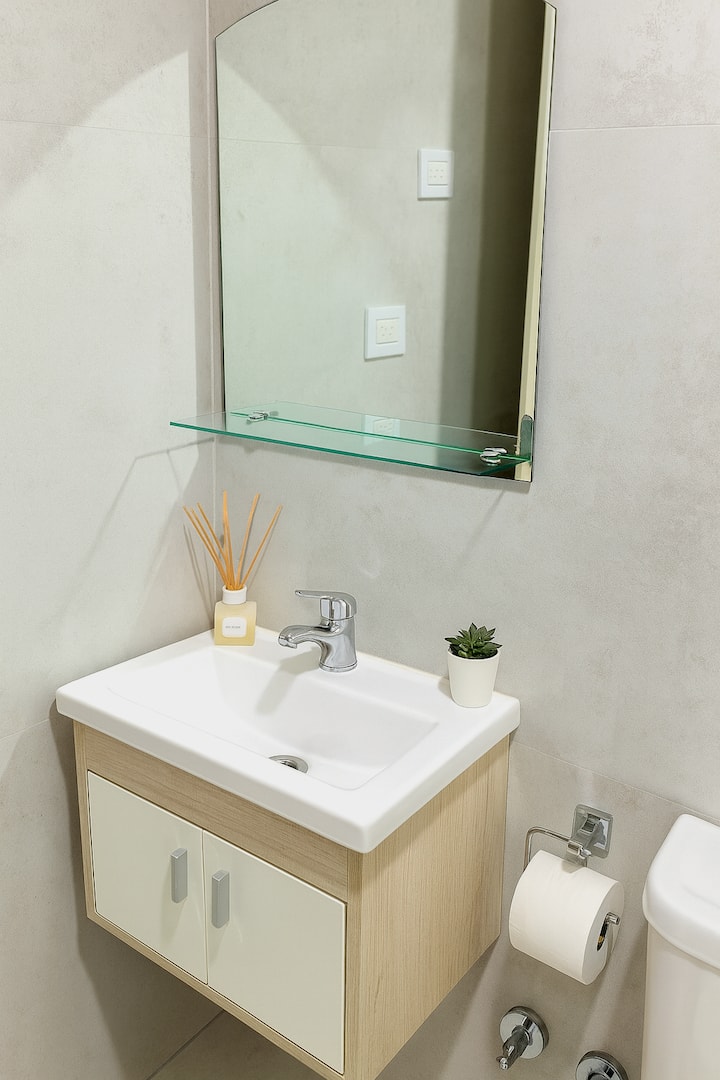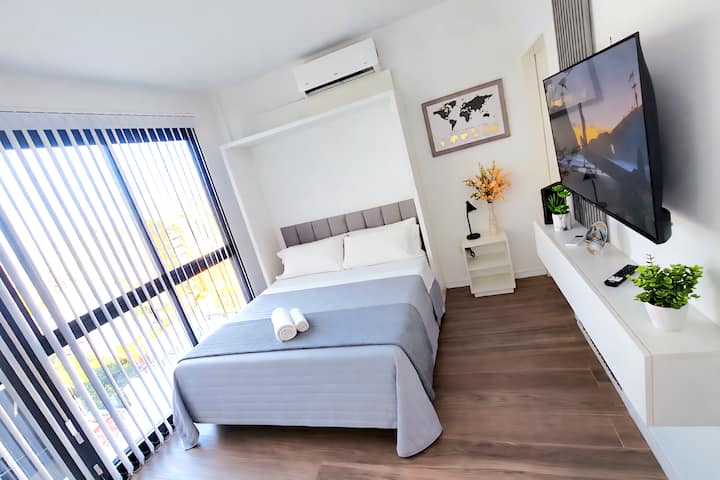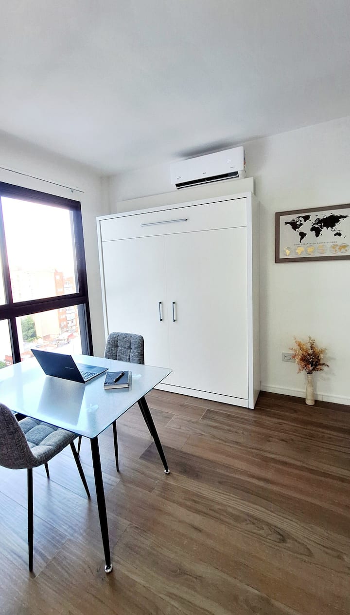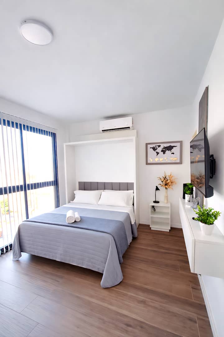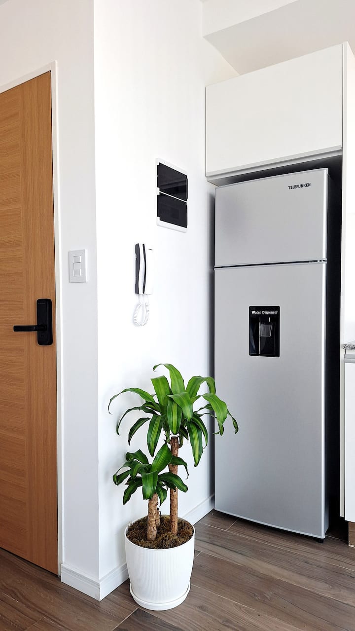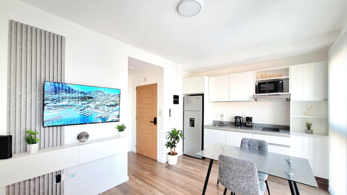 Квартира-студия (одна комната) в новом доме на Av. San Juan в San Cristóbal. Помещение полностью меблировано и оборудовано для проживания 1 или 2 человек. Есть цифровой доступ в здание и квартиру, центральное горячее водоснабжение, высокоскоростной Wi‑Fi и сплит-кондиционер (охлаждение и обогрев). Установлен телевизор Smart TV 43 дюйма; предусмотрены Netflix и YouTube, доступ к остальным сервисам осуществляется с личными учётными данными. В комнате раскладная кровать с комплектом постельного бел
