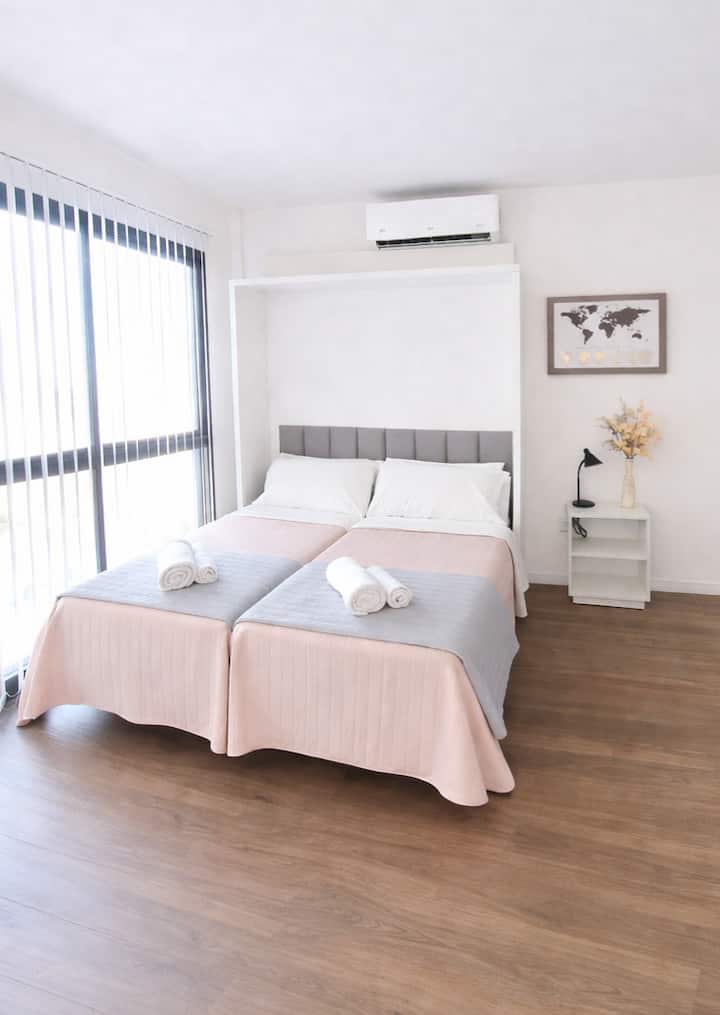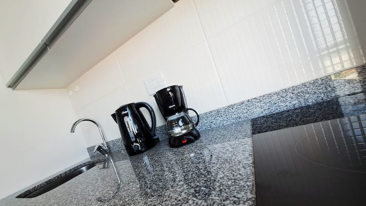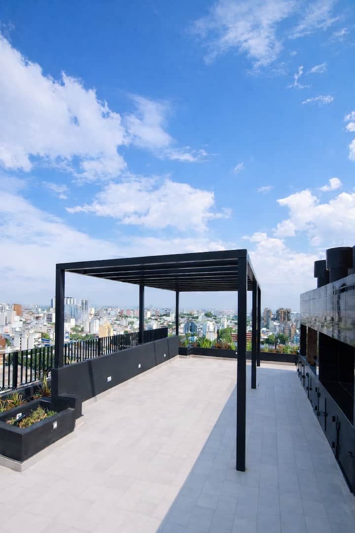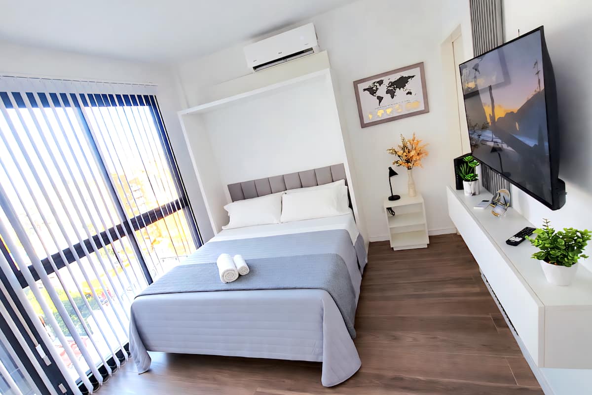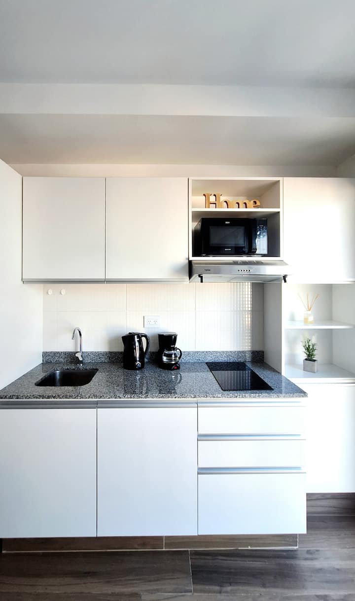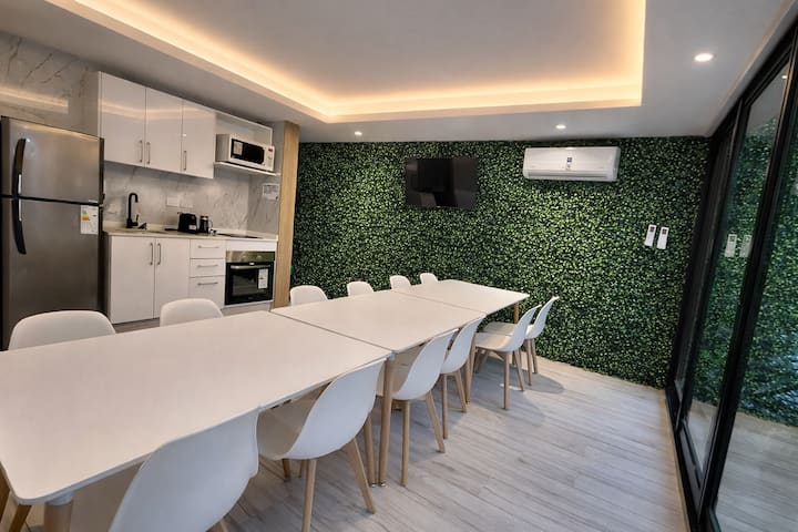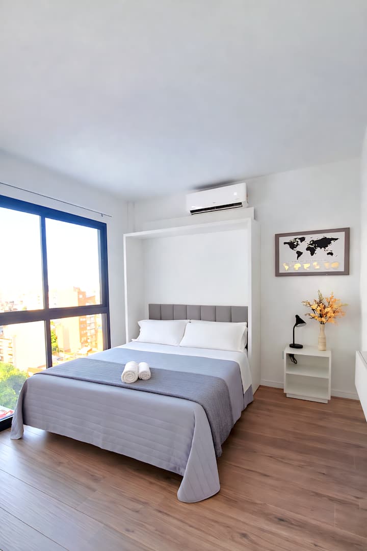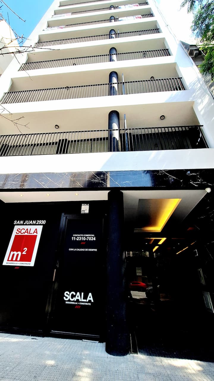 Квартира-студия (одна комната) в новом доме на Av. San Juan в San Cristóbal. Помещение полностью меблировано и оборудовано для проживания 1 или 2 человек. Есть цифровой доступ в здание и квартиру, центральное горячее водоснабжение, высокоскоростной Wi‑Fi и сплит-кондиционер (охлаждение и обогрев). Установлен телевизор Smart TV 43 дюйма; предусмотрены Netflix и YouTube, доступ к остальным сервисам осуществляется с личными учётными данными. В комнате раскладная кровать с комплектом постельного бел