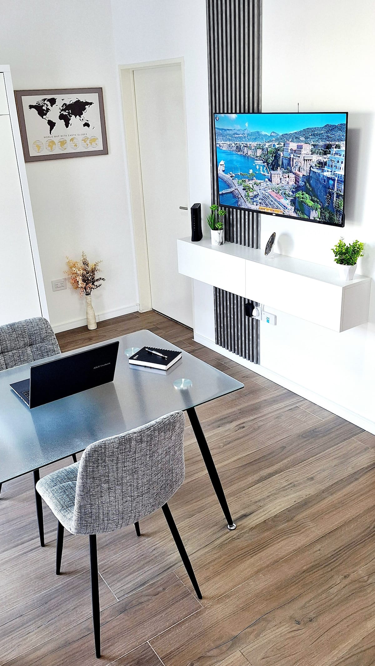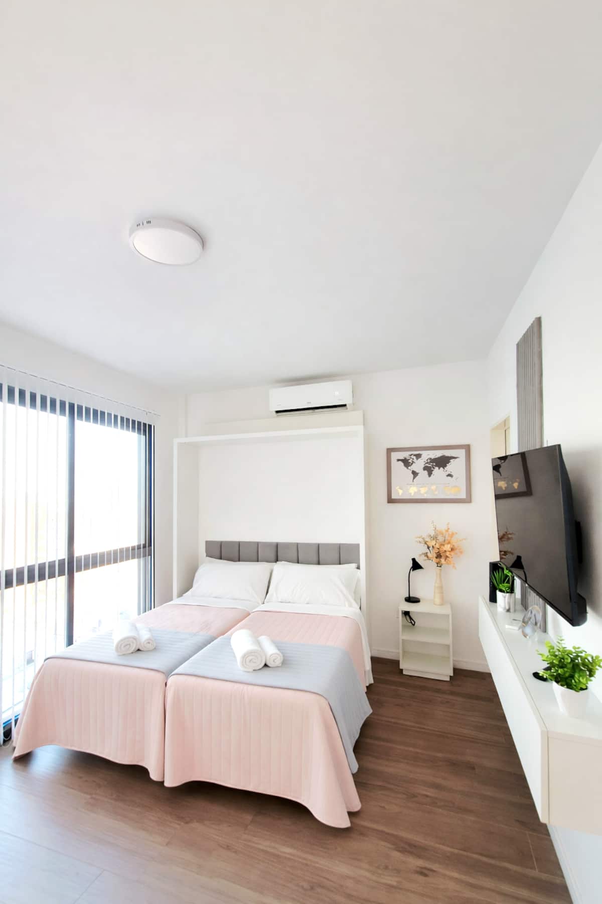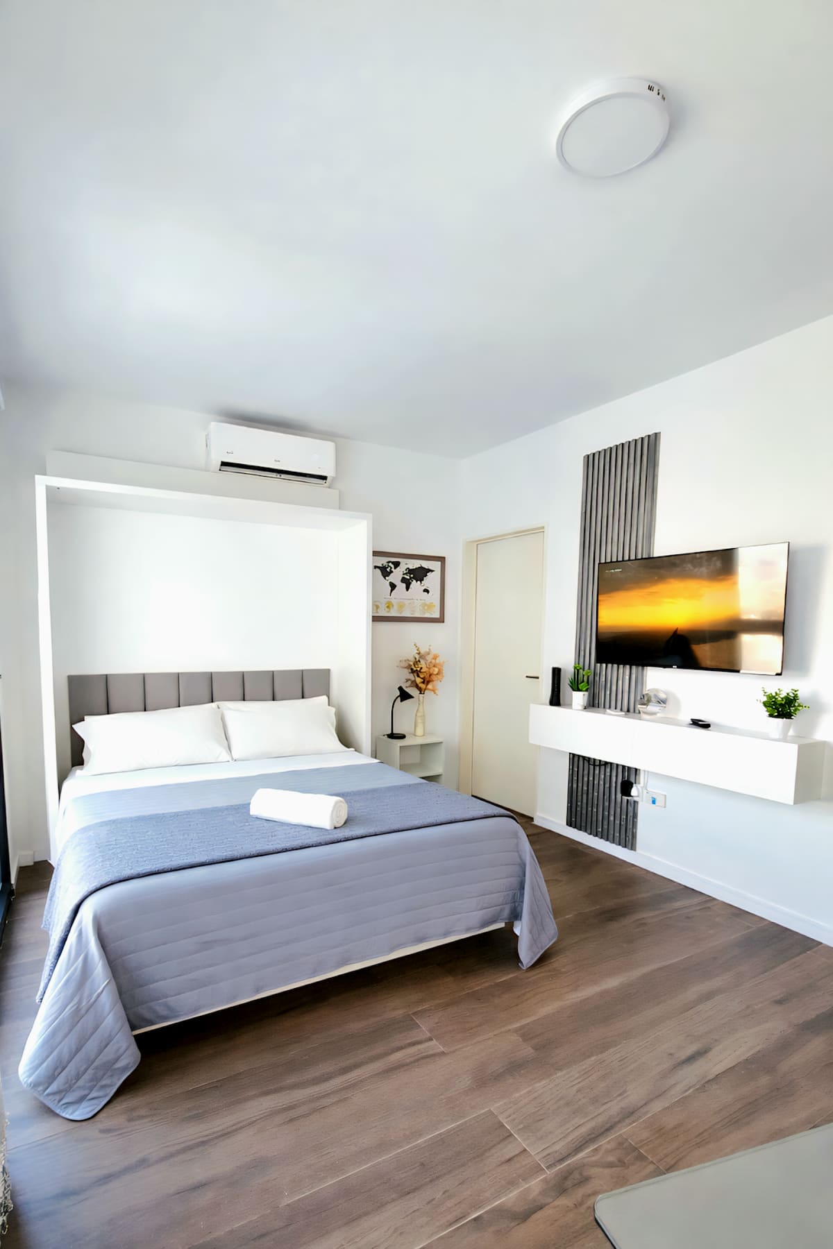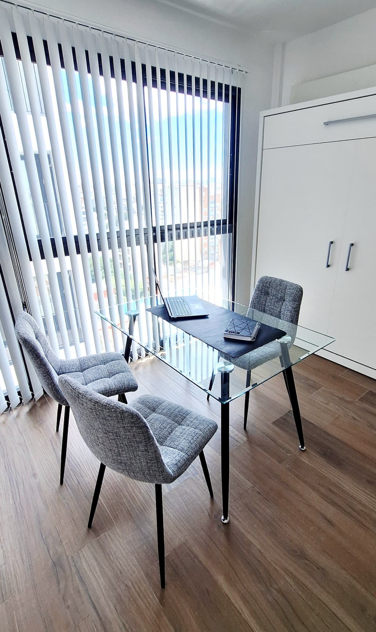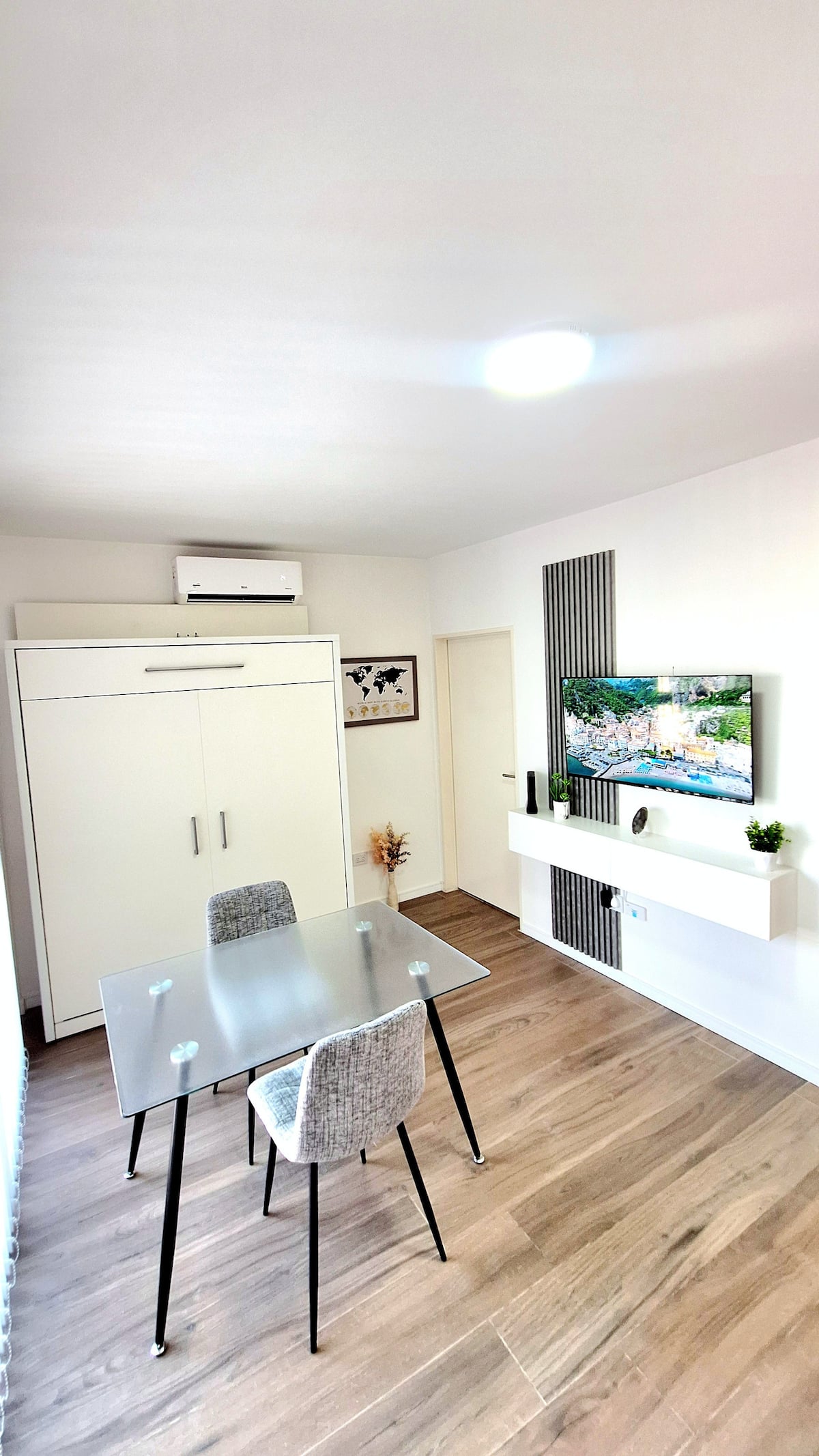 Квартира-студия (одна комната) в новом доме на Av. San Juan в San Cristóbal. Помещение полностью меблировано и оборудовано для проживания 1 или 2 человек. Есть цифровой доступ в здание и квартиру, центральное горячее водоснабжение, высокоскоростной Wi‑Fi и сплит-кондиционер (охлаждение и обогрев). Установлен телевизор Smart TV 43 дюйма; предусмотрены Netflix и YouTube, доступ к остальным сервисам осуществляется с личными учётными данными. В комнате раскладная кровать с комплектом постельного бел