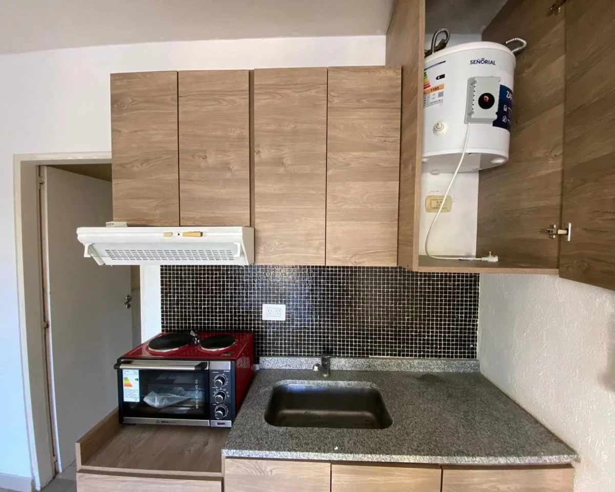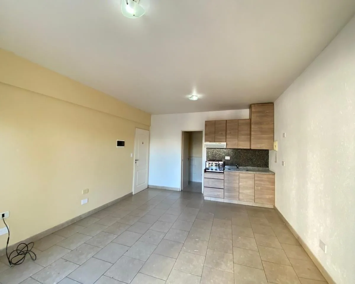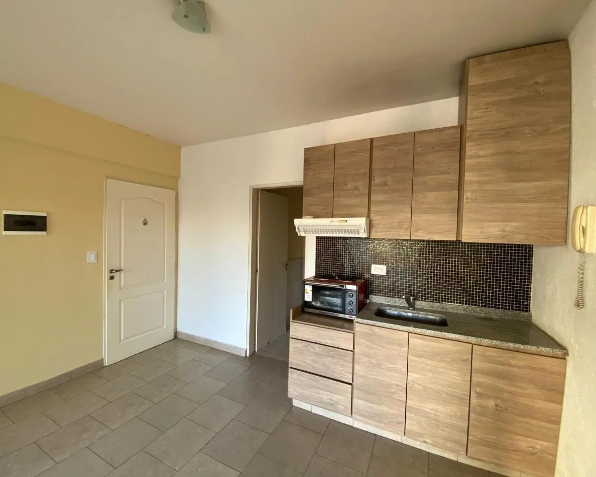 Квартира-студия в San Miguel. В помещении кухня-гостиная с тумбой под раковину, навесными шкафами и электрической плитой, совмещённый санузел с ванной. Есть широкий балкон. Газ природный отсутствует, отопление и приготовление пищи на электричестве. Аренда 430.000 ARS в месяц, коммунальные платежи здания около 90.000 ARS. Договор на 2 года, индексация раз в полгода по IPC.