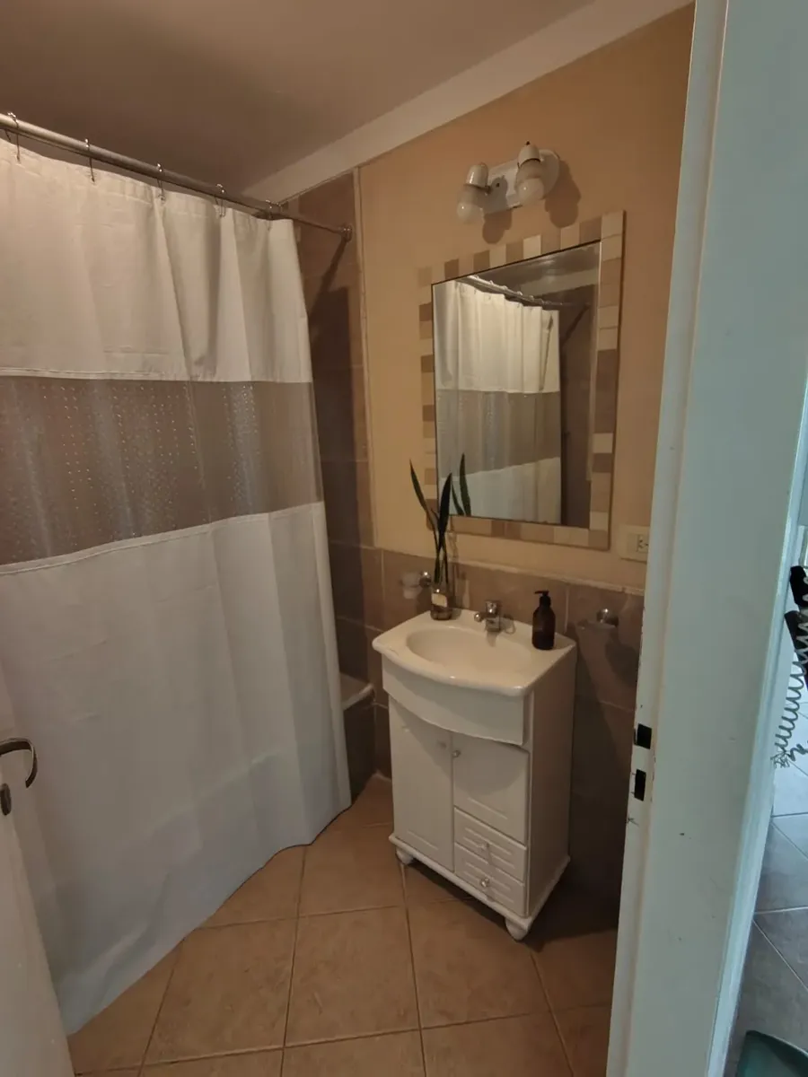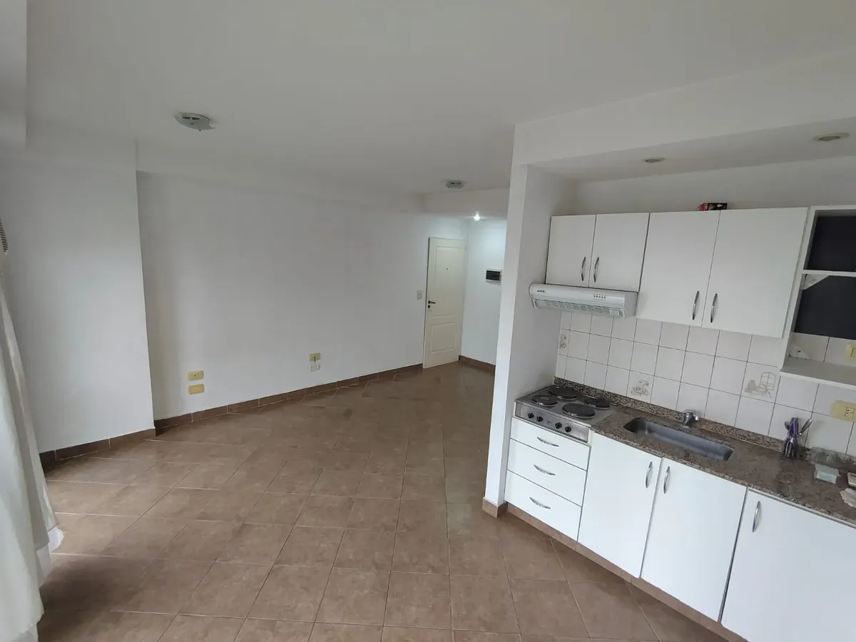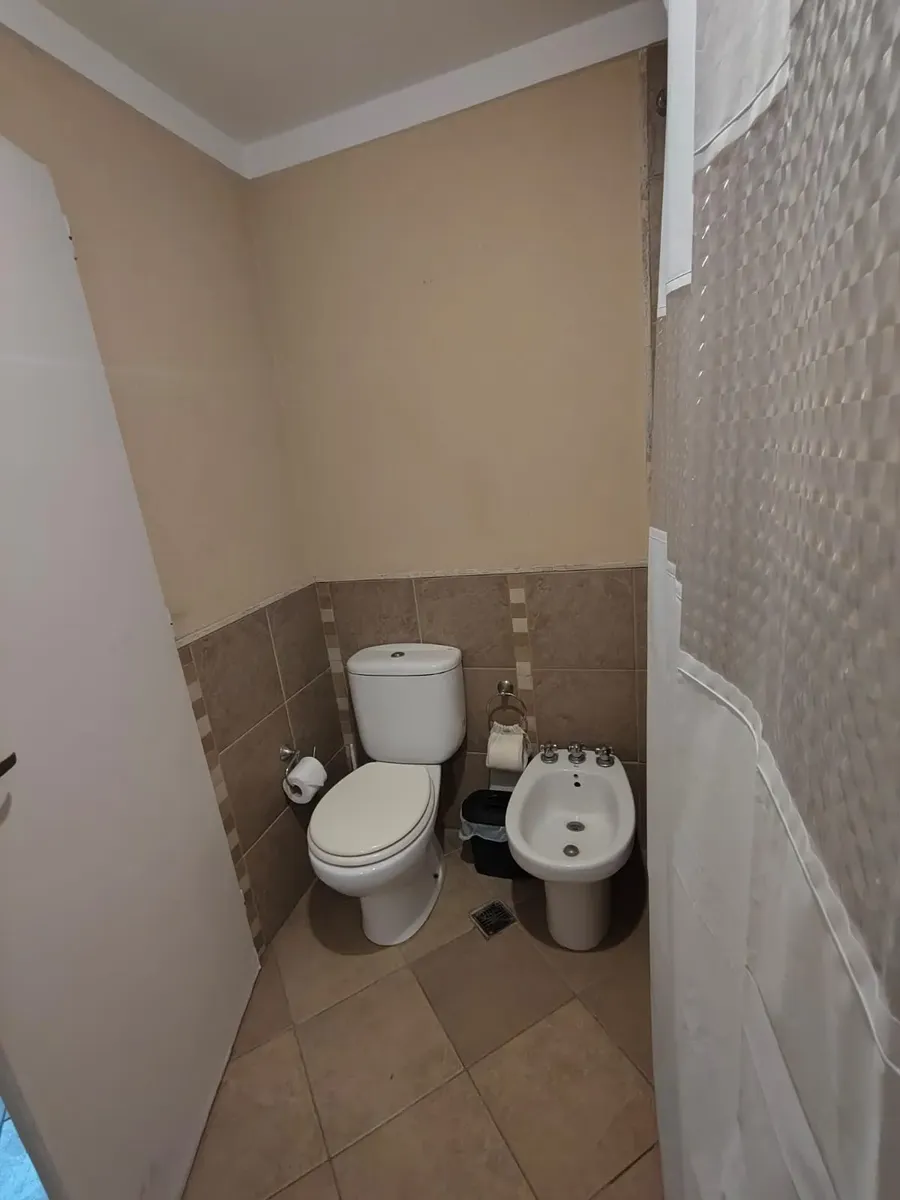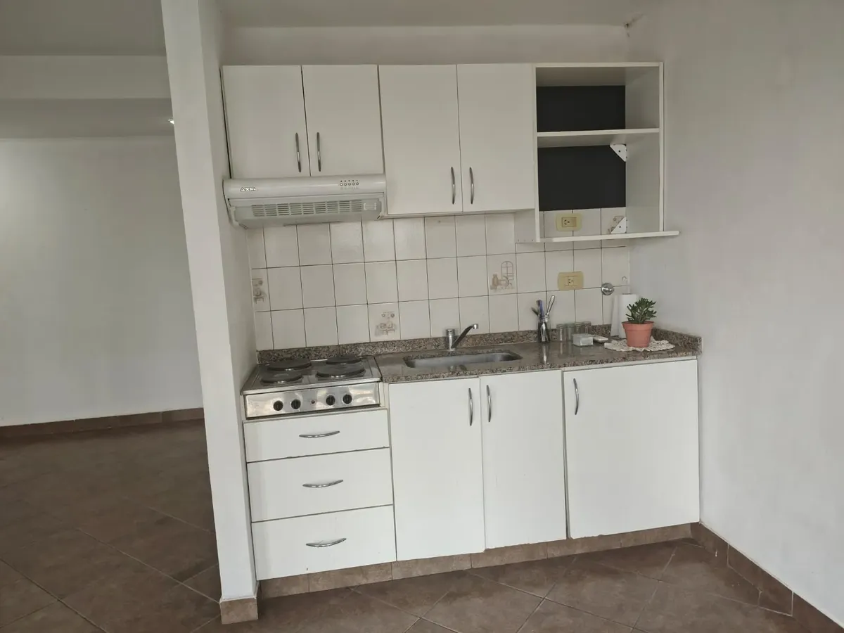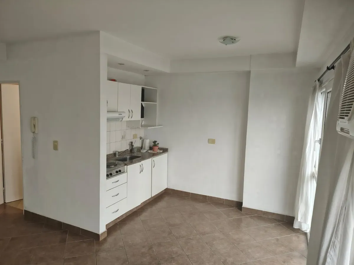 Квартира-студия в здании Itatí на Calle Urquiza в San Miguel. Кухня с мебелью: нижний модуль и навесные шкафы, установлен термонагреватель и электрическая варочная панель с 4 конфорками. Кондиционер холод/тепло; санузел полный с ванной, биде, унитазом, тумбой и зеркалом, установлены шторы на окнах и в ванной. В здании есть общая гостиная для жильцов (SUM), место для хранения велосипедов, прачечные автоматы с оплатой и общий крытый дворик с террасой, солярием, бассейном и небольшим тренажёрным за