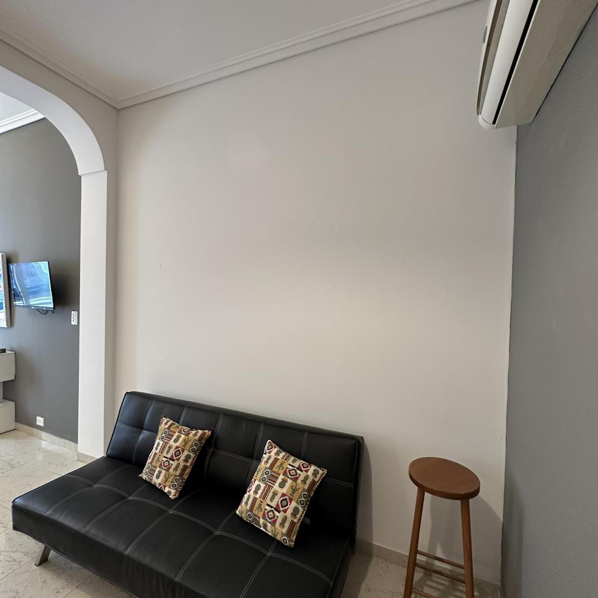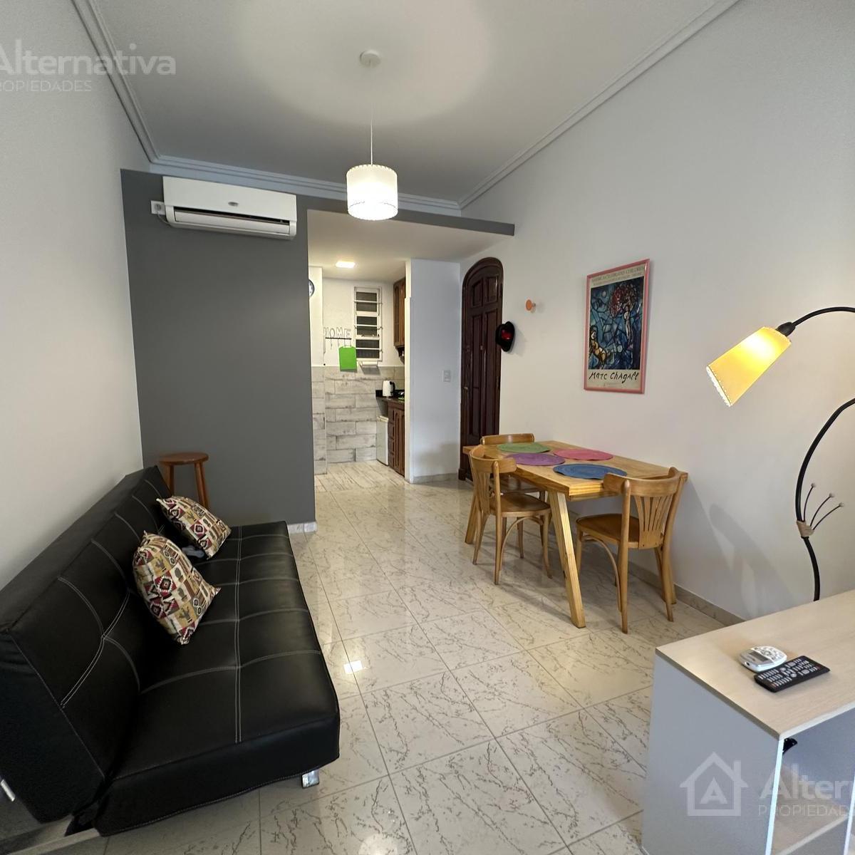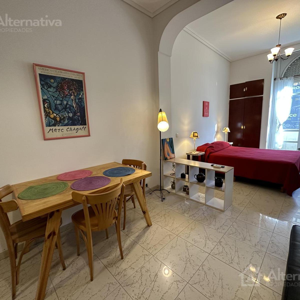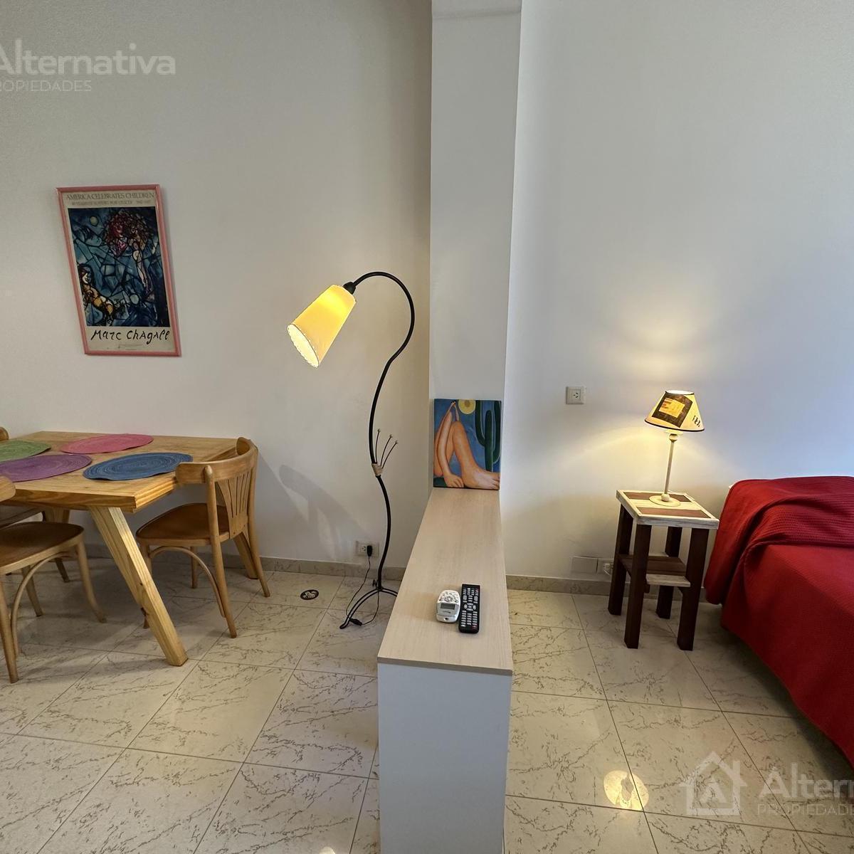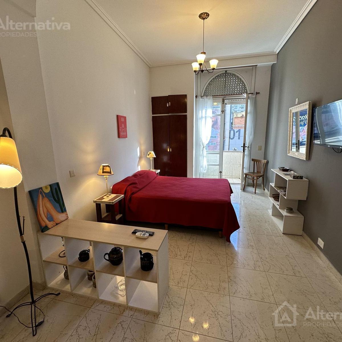 Квартира-студия в San Nicolás, с балконом с видом на улицу. В комнате есть футон (3 секции), обеденный стол на 4 стула, мебель-разделитель, торшер, двуспальная кровать, прикроватные тумбы и встроенный шкаф, сейф, кондиционер и Smart TV. Кухня интегрирована и оснащена индукционной плитой (anafe), электрочайником, микроволновой печью, холодильником с морозильной камерой; в ванной с душем установлена сантехника с горячей и холодной водой. В стоимость включены коммунальные платежи здания и услуги с