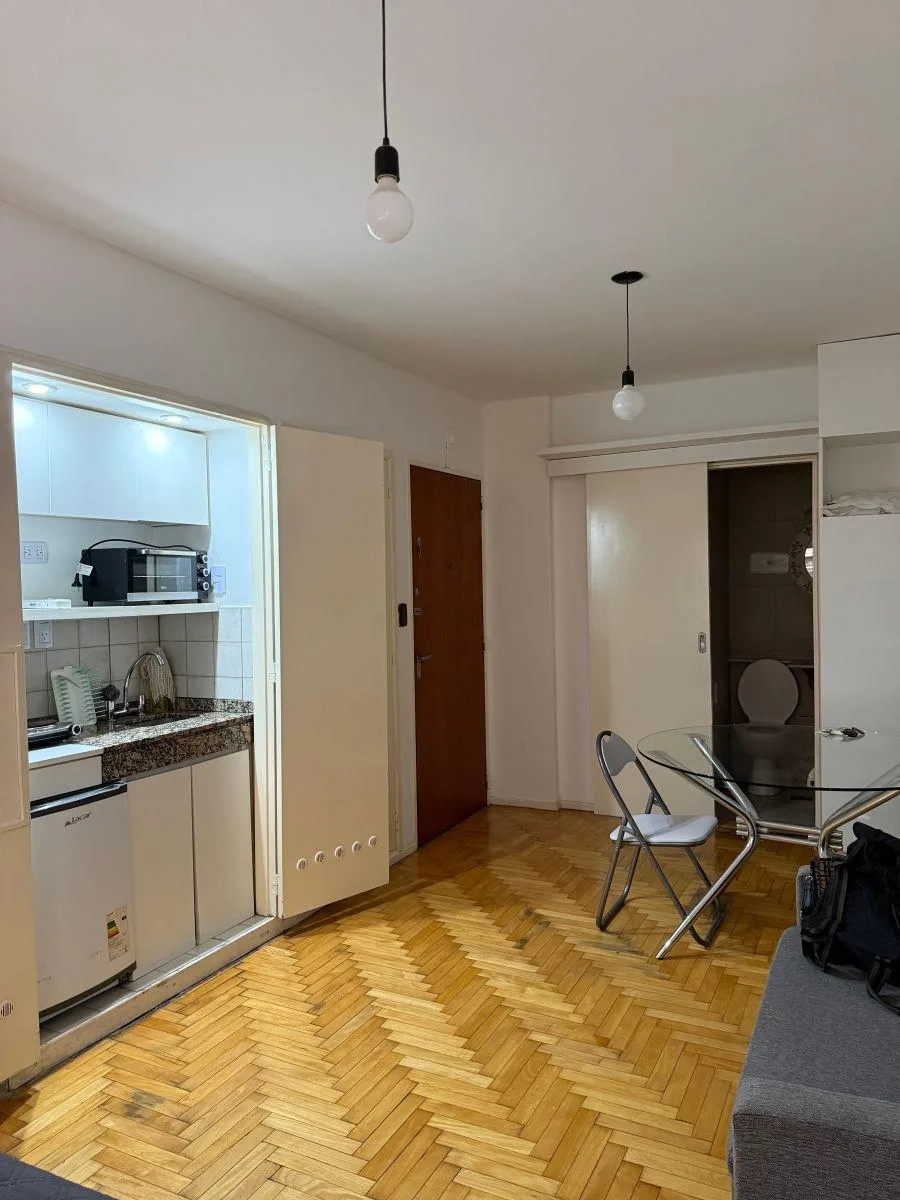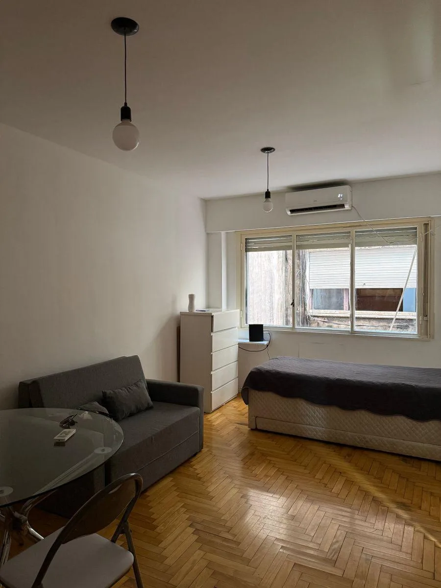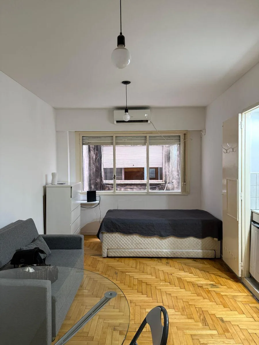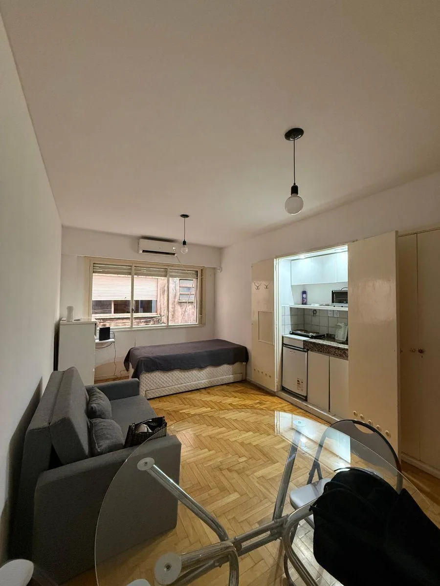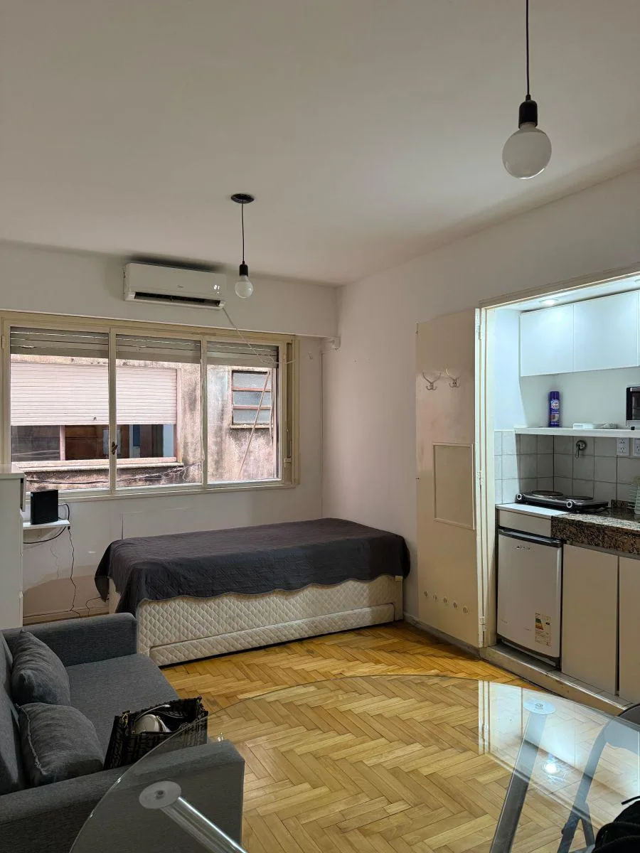 Квартира-студия в San Nicolás, 5-й этаж, после свежей покраски. Окна выходят на улицу; рядом Av. Callao и Av. Corrientes, с транспортным сообщением и инфраструктурой для учёбы и досуга. Аренда с ежеквартальной индексацией плюс коммунальные платежи здания и услуги; требуется подтверждение доходов и залог-страховка аренды Finaer или гарантия собственника. Размер коммунальных платежей, возраст здания и площадь указаны как ориентировочные.