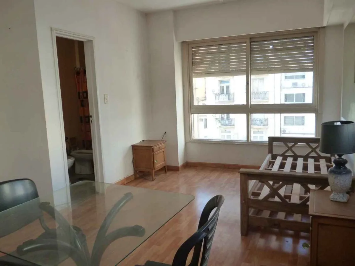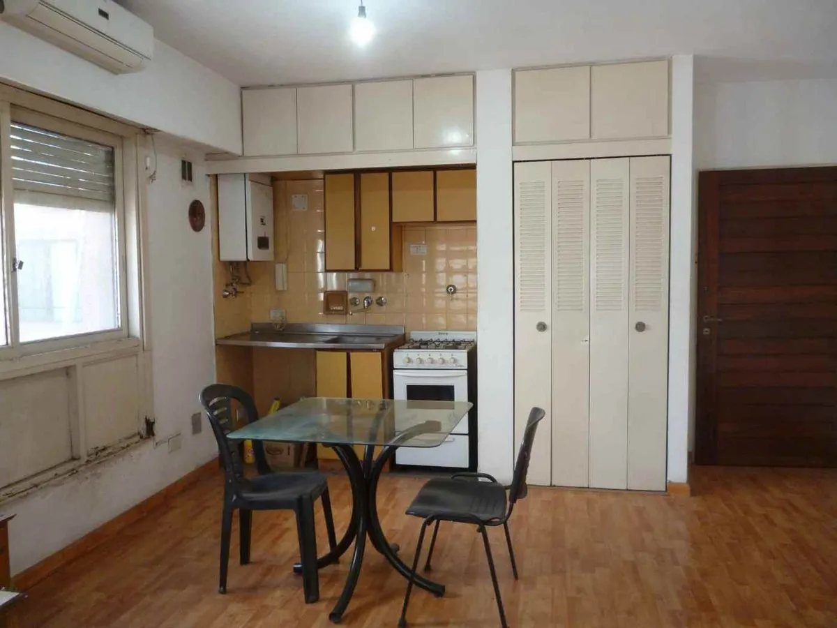 Квартира-студия, пригодная для профессионального использования, в San Nicolás. Площадь помещения: 4,40 x 3 / 2,50 x 3; высота и ориентация по описанию не указаны. Кухня-кинетт с мебелью под и над столешницей, газовая плита на 4 конфорки с духовкой. Есть гардероб (placar), ванная с душевым поддоном, окна с широким остеклением и жалюзи, установлен сплит для холодного режима. В здании круглосуточная охрана (24 часа), фитнес-зал и прачечная (laundry). Дом состоит из двух корпусов, в каждом по два ли