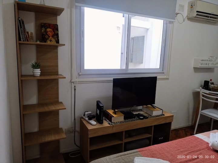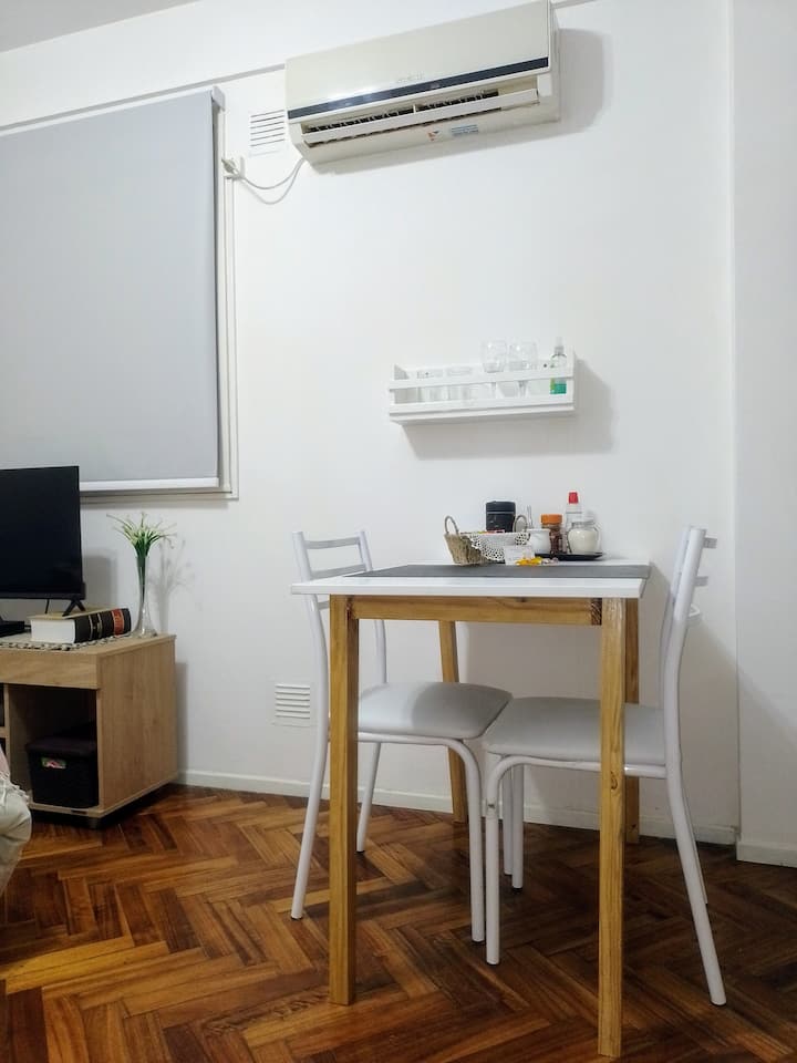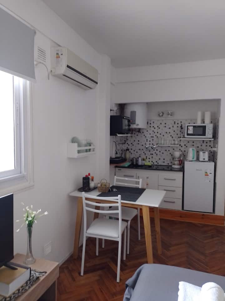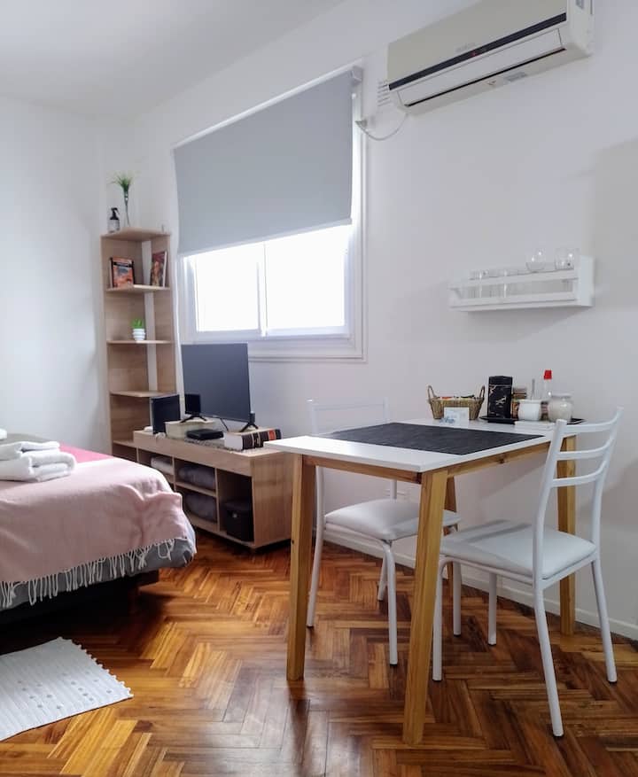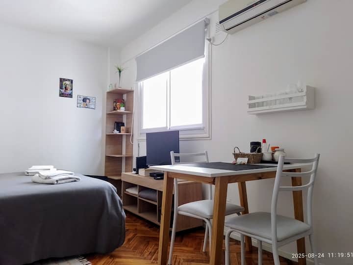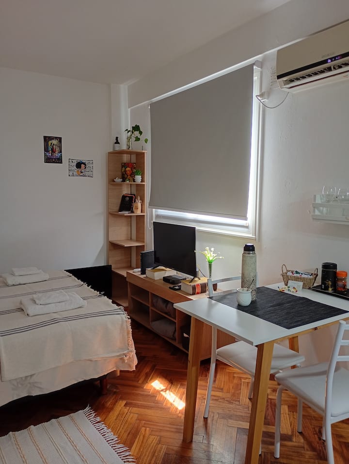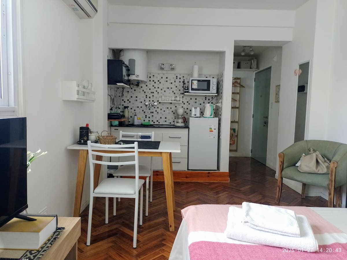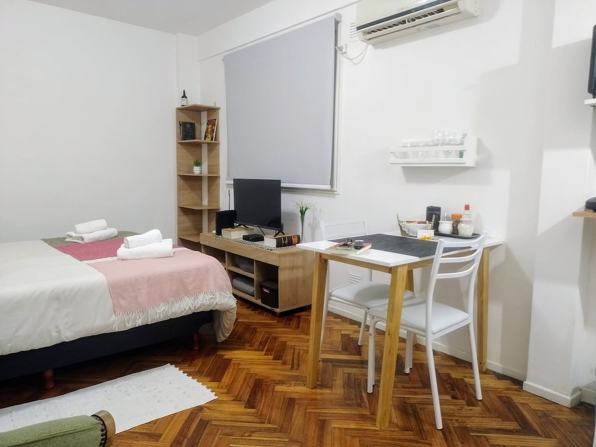 Квартира-студия в San Nicolás. Есть кондиционер. Wi‑Fi и Smart TV с цифровым телевидением. Кухня оборудована, предусмотрено отопление. Расстояние указано как около 30 м до Calle Corrientes, несколько кварталов до Obelisk, Av. 9 de Julio и пешеходной Florida.
