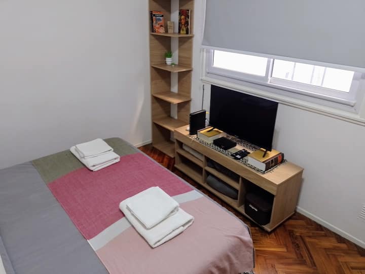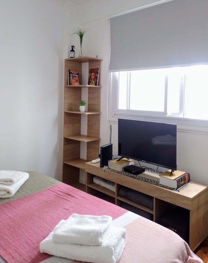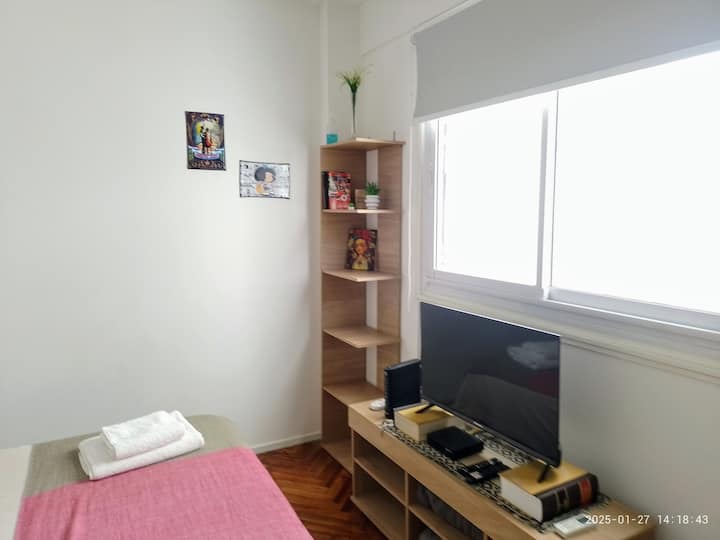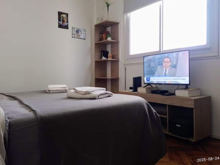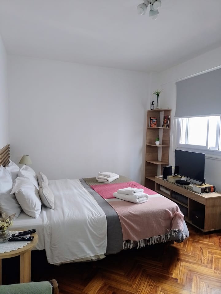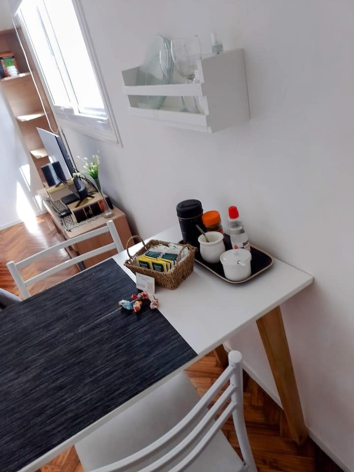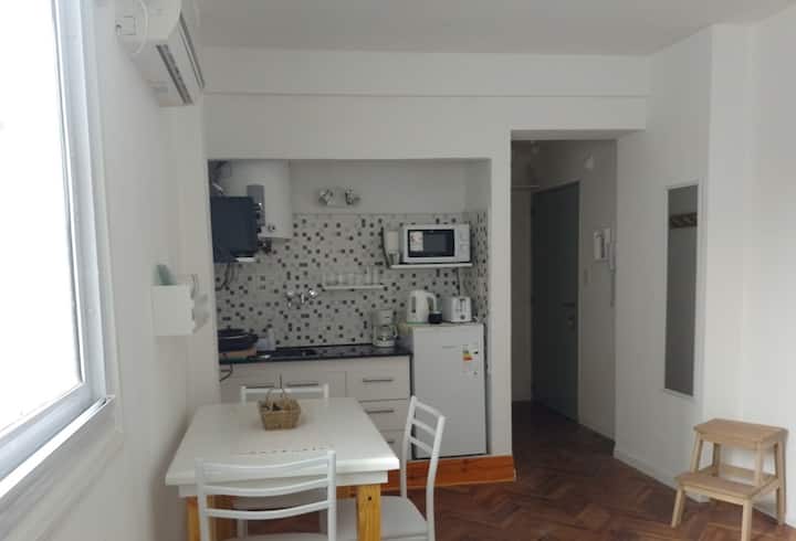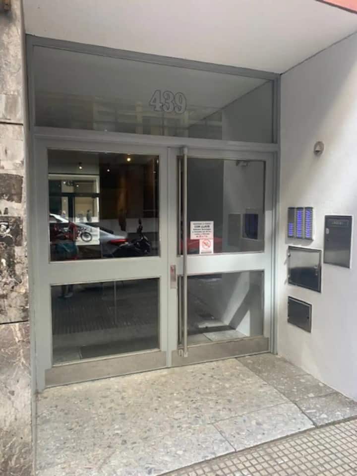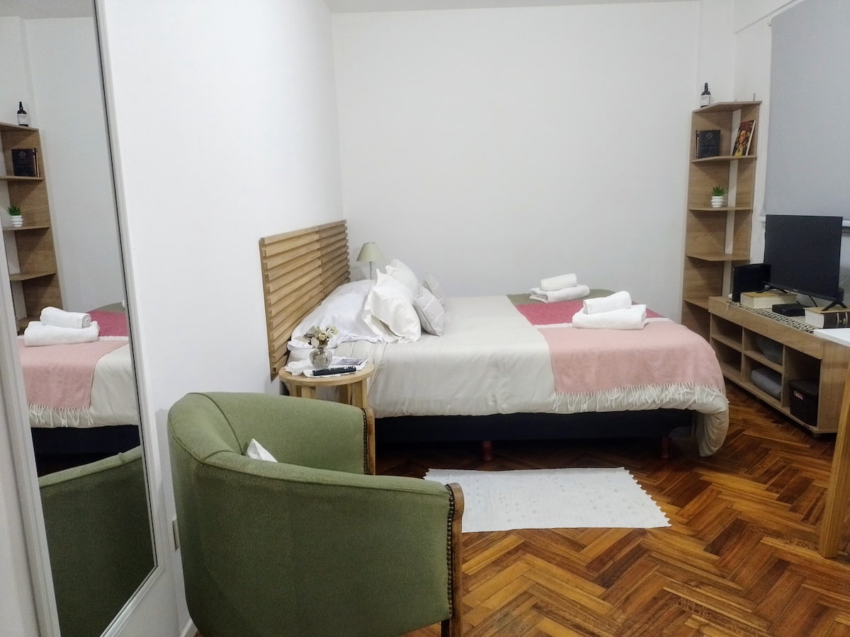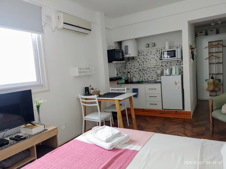 Квартира-студия в San Nicolás. Есть кондиционер. Wi‑Fi и Smart TV с цифровым телевидением. Кухня оборудована, предусмотрено отопление. Расстояние указано как около 30 м до Calle Corrientes, несколько кварталов до Obelisk, Av. 9 de Julio и пешеходной Florida.