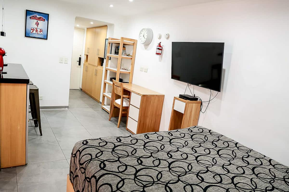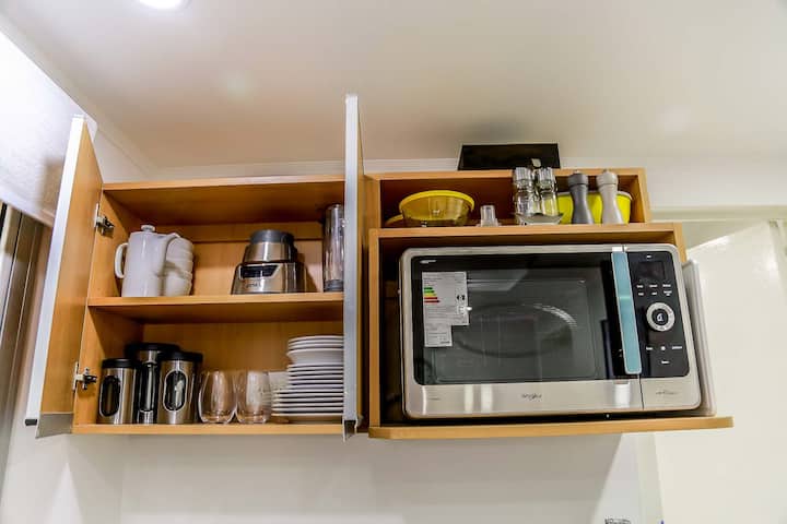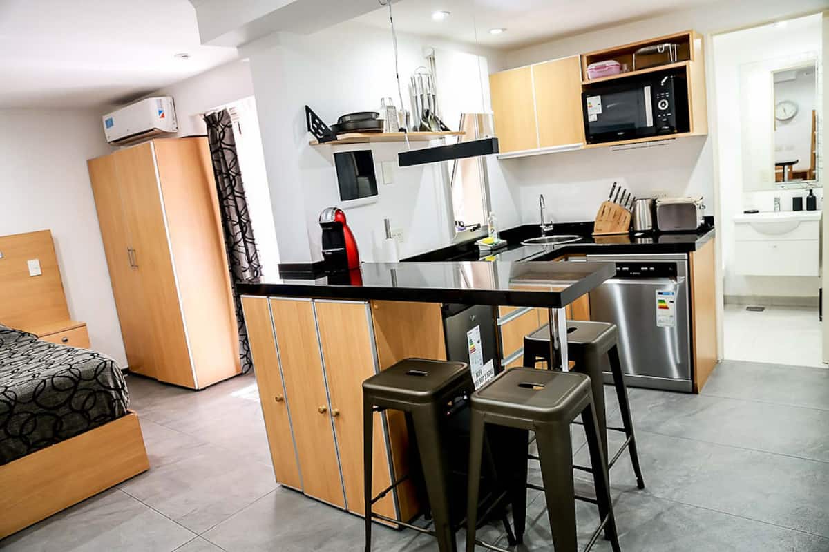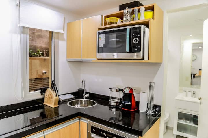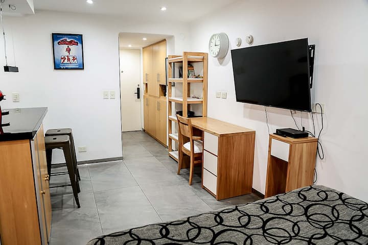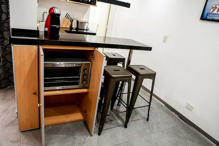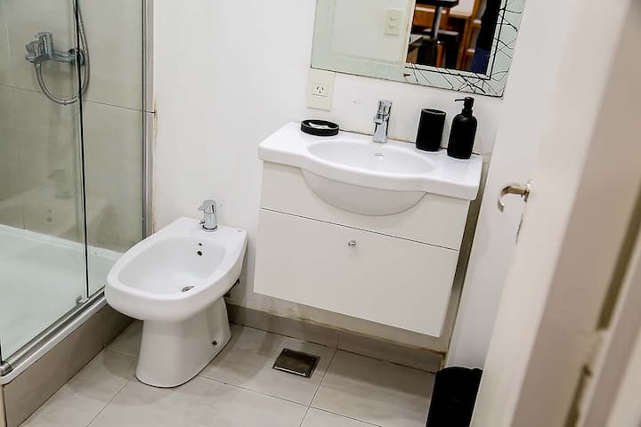 Квартира-студия в центре Buenos Aires, в 2 кварталах от Obelisco, окна выходят во внутренний двор. Студия полностью укомплектована: двуспальная кровать (queen) с постельным бельём, ванная с биде, косметическими средствами, феном и кондиционером, а также кухня с мини-холодильником, посудомоечной машиной, микроволновой печью, кофеваркой, электрочайником, духовкой, плитой, тостером и обеденным столом. В распоряжении 4k Smart TV, кабельное телевидение, Wi‑Fi, кондиционер, рабочий стол, утюг, аптечка