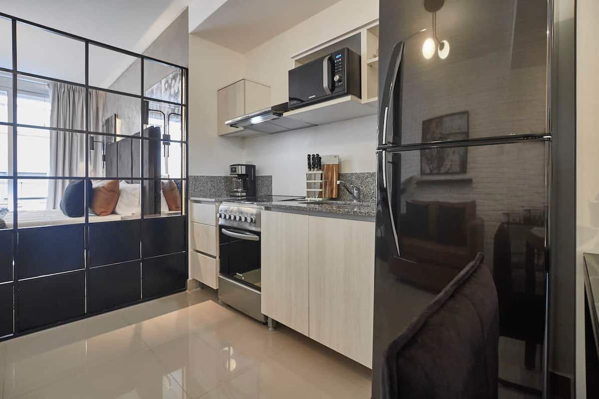 Квартира-студия. Предусмотрен бесконтактный заезд, доступ на территорию по коду и QR-коду. В здании есть высокоскоростной Wi‑Fi, кофе и чай Nespresso, круглосуточная бесплатная прачечная, камера хранения багажа, бассейн и солярий. В описании также указаны общие площади для хранения багажа и два кода доступа: QR-код для входа в помещение и персональный код для доступа к квартире.