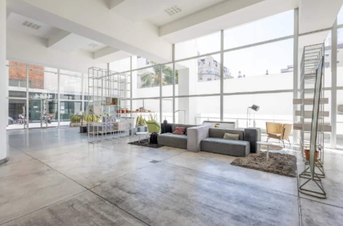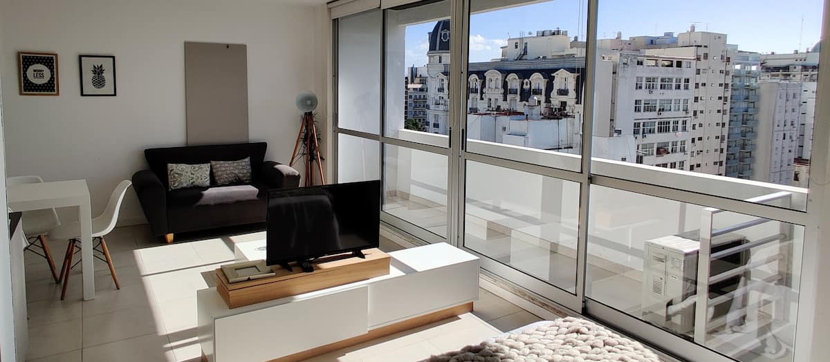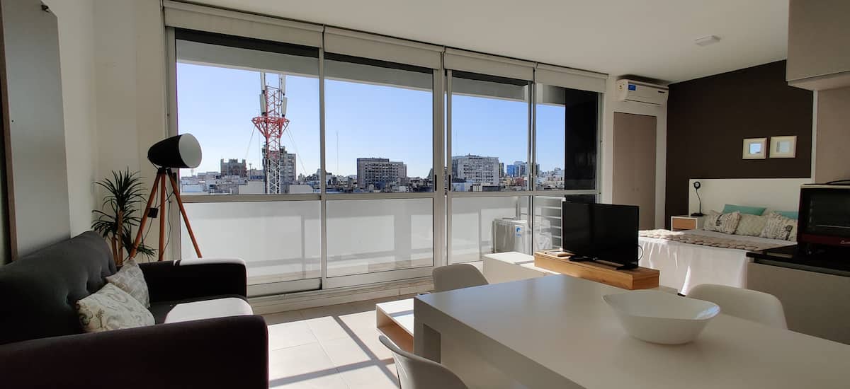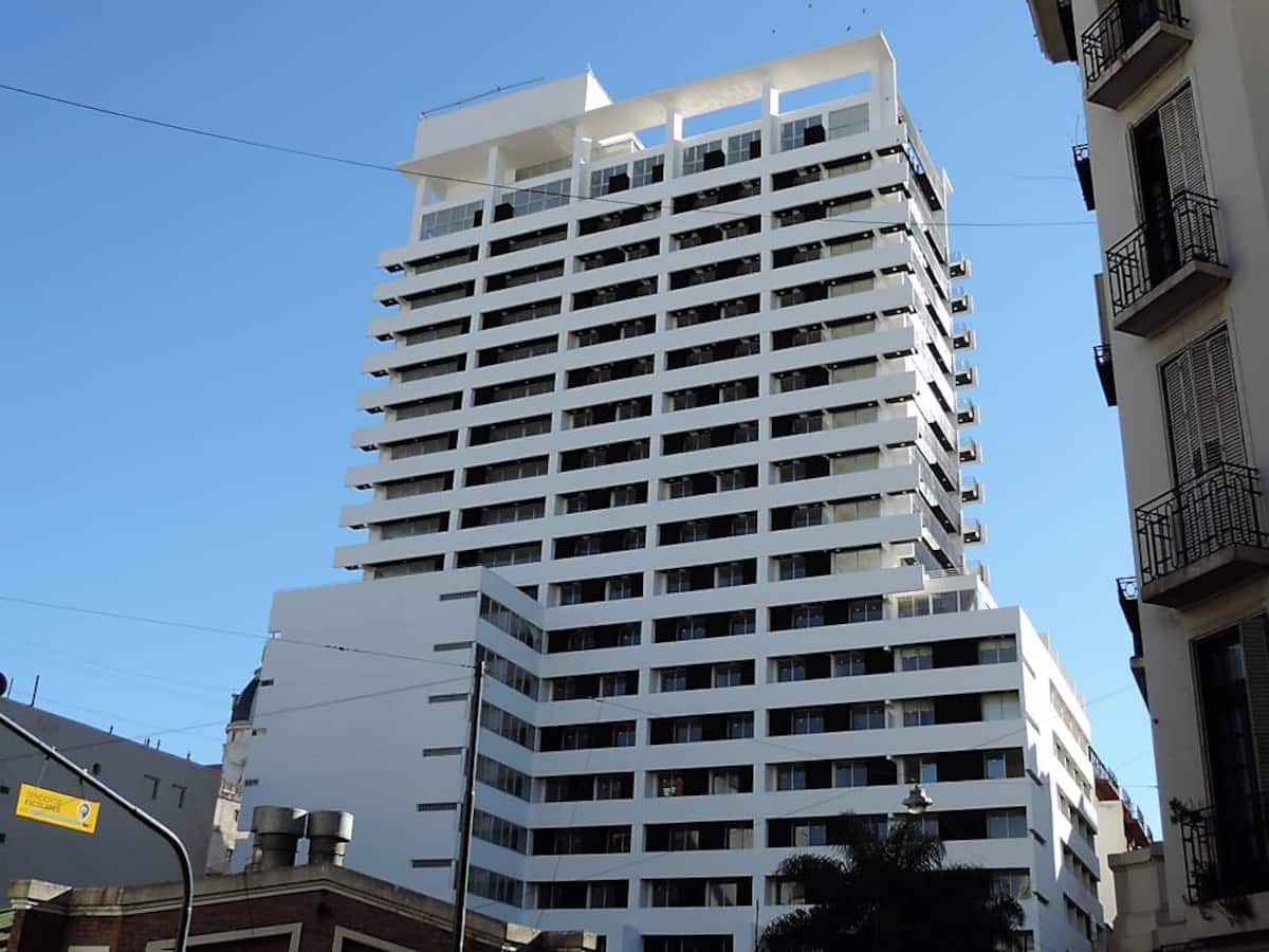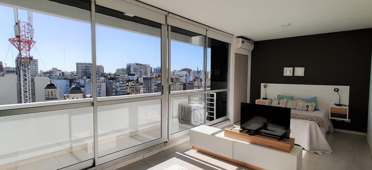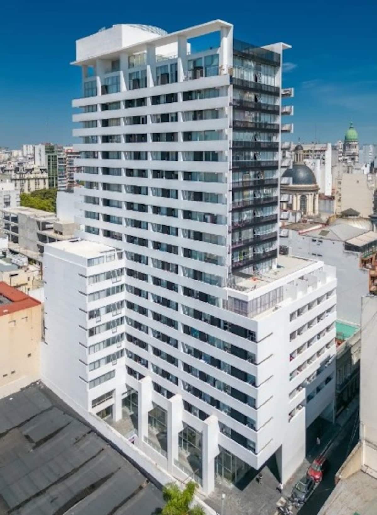 Квартира-студия площадью одним помещением в современном доме в San Nicolás. Полностью меблирована, с кухонной зоной, двуспальной кроватью и телевизором, оборудована кондиционером. Ванная комната в помещении с ванной. На 19-м этаже предусмотрен бассейн на террасе. Имеются круглосуточный консьерж и охрана; окна выходят наружу. Указаны ближайшие станции метро и Metrobus, а также две остановки от станции линии A. Florida Street находится примерно в 7 кварталах к западу.