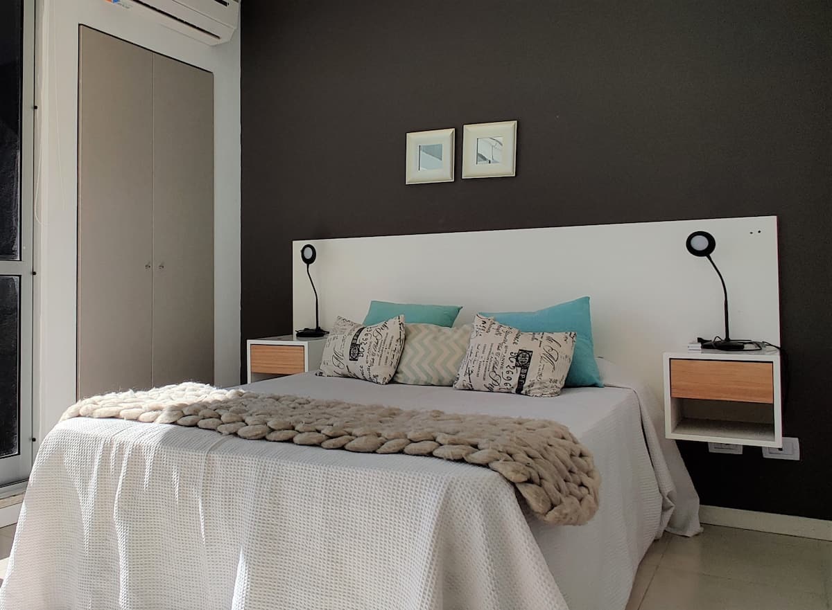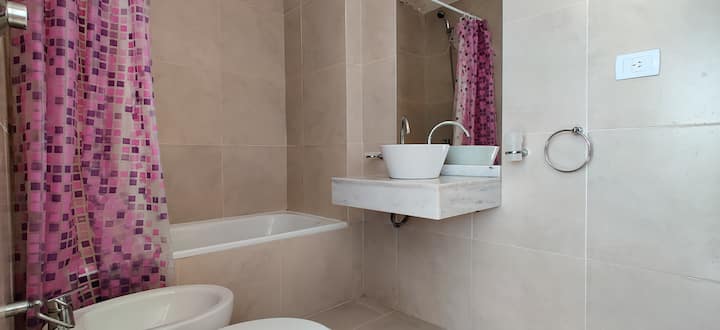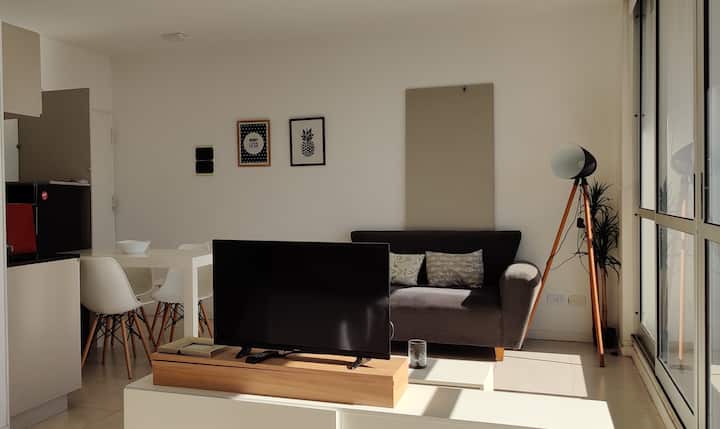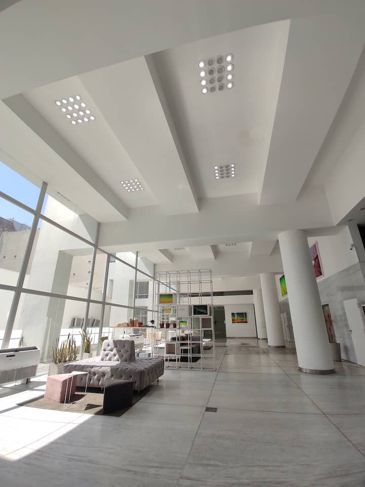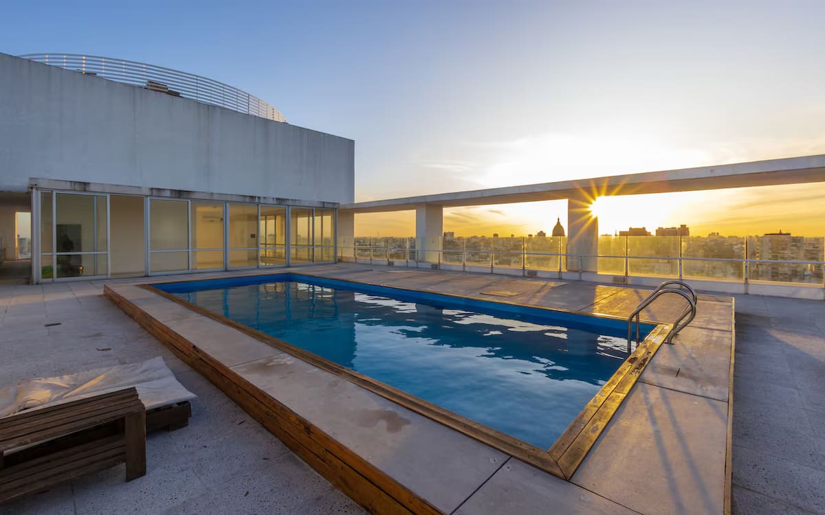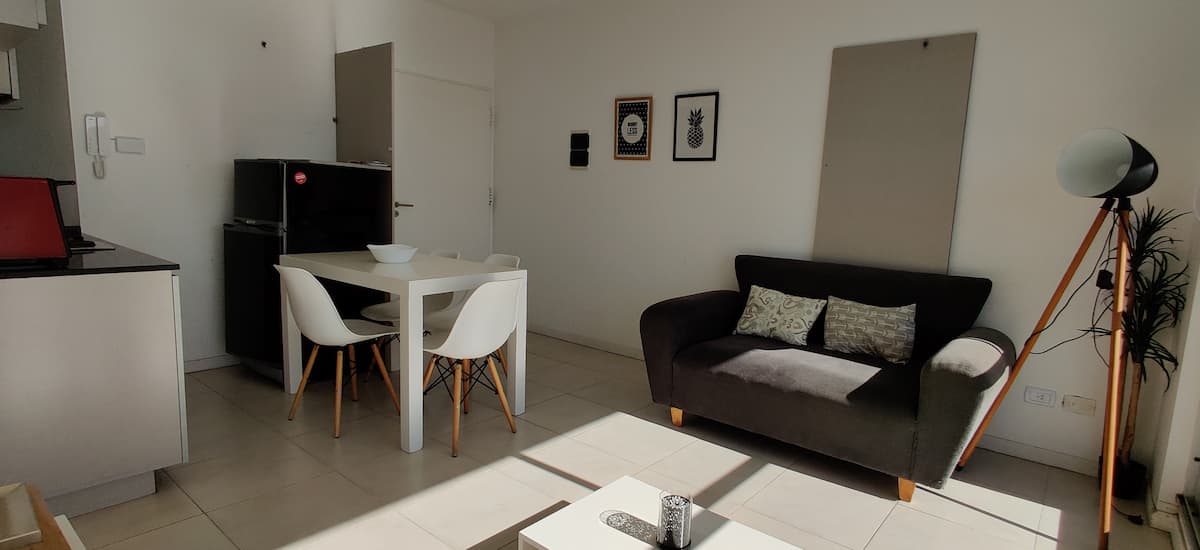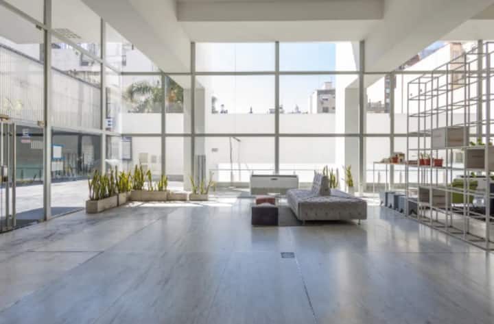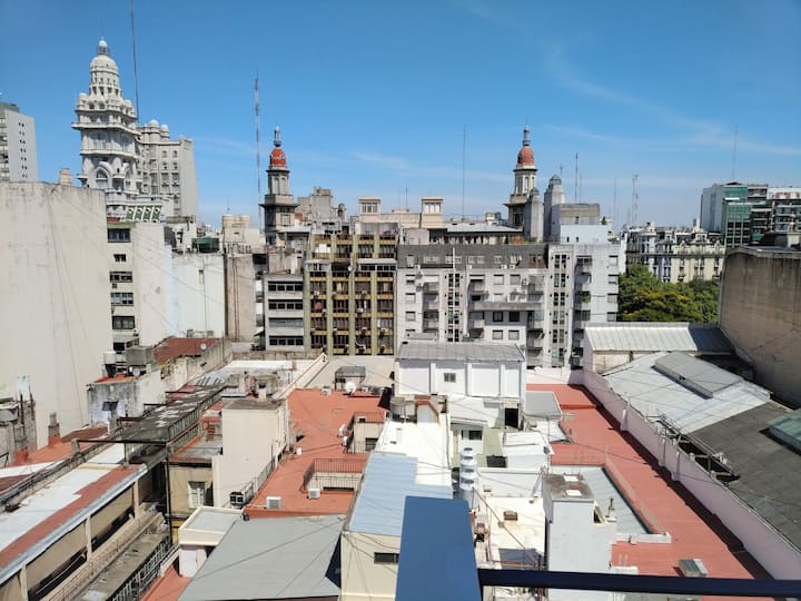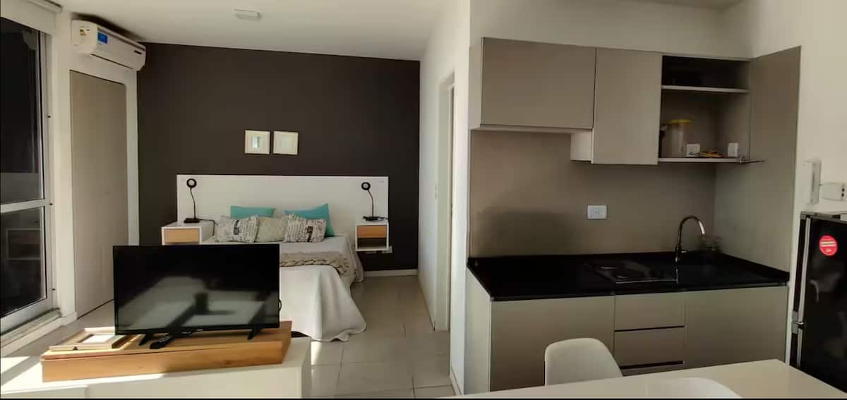 Квартира-студия площадью одним помещением в современном доме в San Nicolás. Полностью меблирована, с кухонной зоной, двуспальной кроватью и телевизором, оборудована кондиционером. Ванная комната в помещении с ванной. На 19-м этаже предусмотрен бассейн на террасе. Имеются круглосуточный консьерж и охрана; окна выходят наружу. Указаны ближайшие станции метро и Metrobus, а также две остановки от станции линии A. Florida Street находится примерно в 7 кварталах к западу.