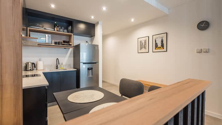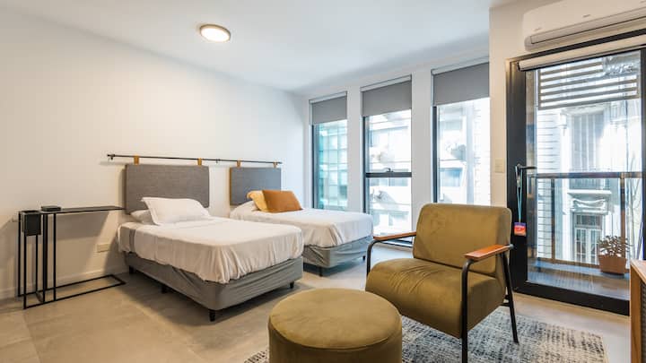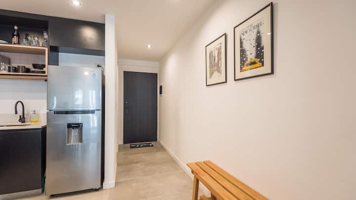 Квартира-студия в San Nicolás с балконом. В распоряжении: кондиционер (холод/тепло), холодильник с морозильной камерой, микроволновая печь, электрическая духовка, электрическая плита, кофеварка, тостер, электрический чайник, прибор для тостов, смарт-ТВ, Wi‑Fi. В ванной есть душ и фен. Здание оборудовано бассейном, террасой и солярием, зоной гриля (по отдельной оплате), есть лифт, система безопасности с виртуальным тотемом и камеры, прачечная с оплатой жетонами (стиральная и сушильная машины). Ук