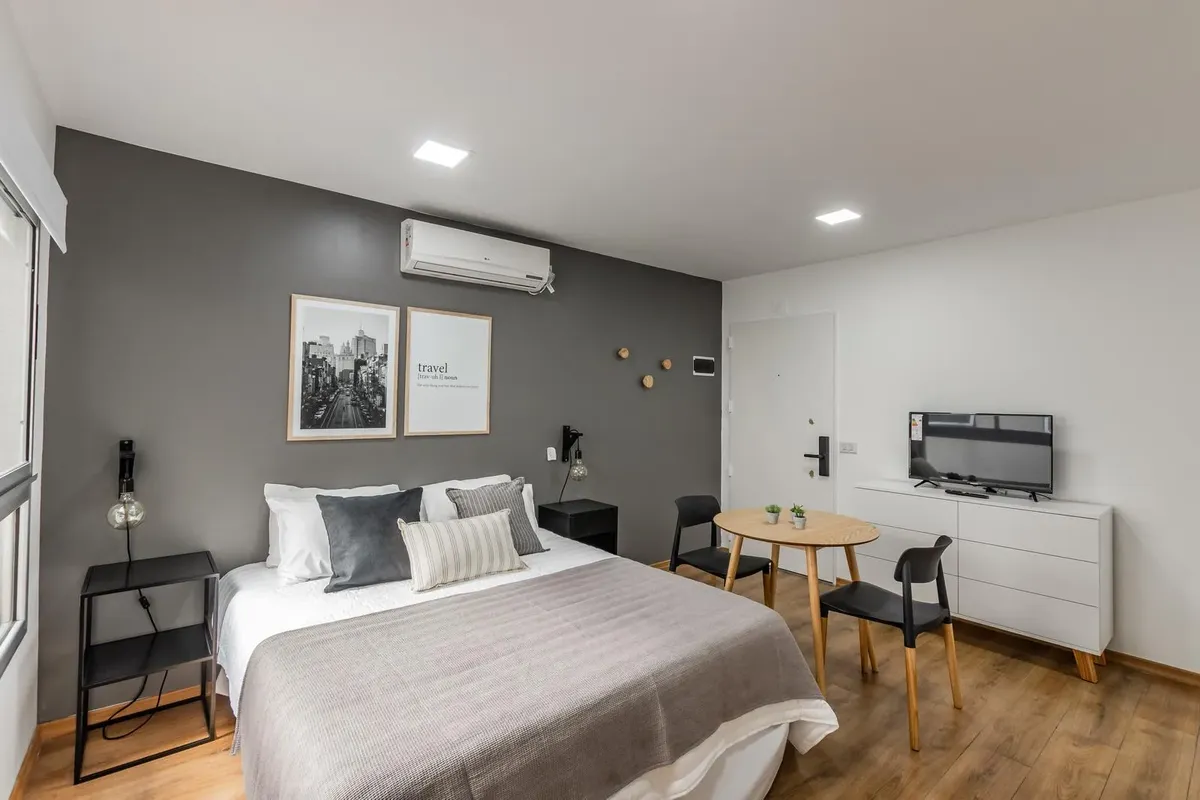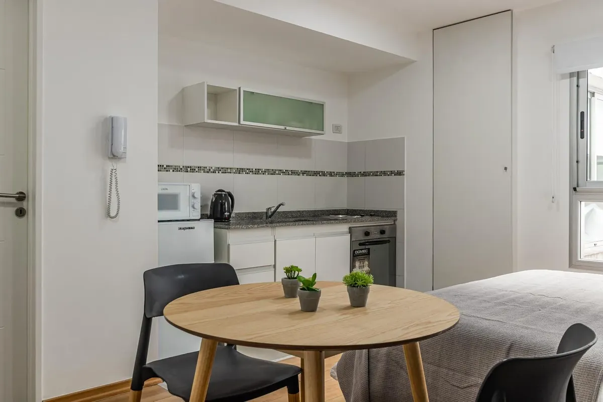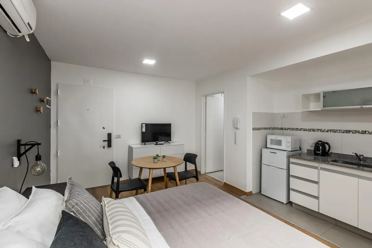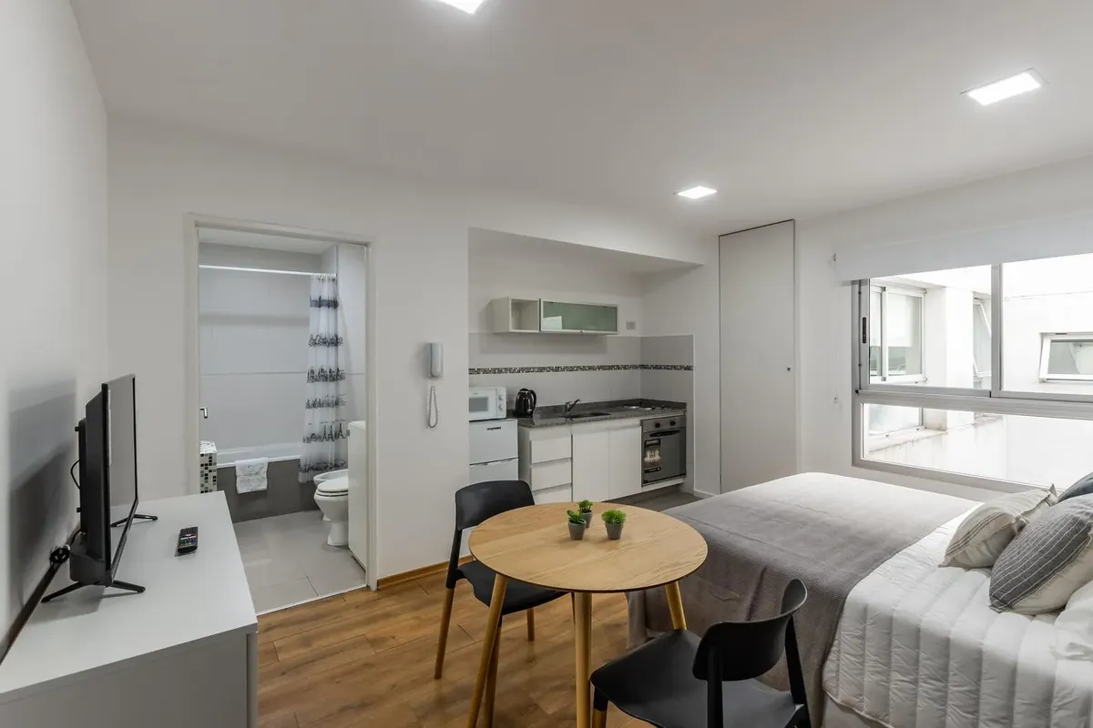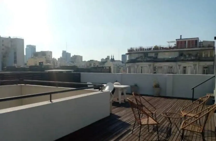 Квартира-студия площадью не указана, с мебелью и оборудованием. Окна выходят не уточняется; указано расположение в San Telmo рядом с UADE, Plaza Defensa и Puerto Madero. Арендная стоимость включает пакет с коммунальными платежами здания и налогами. В здании есть терраса, общая гостиная для жильцов (SUM) и прачечная. Минимальный срок аренды 3 месяца, максимальный 6 месяцев с возможностью продления.