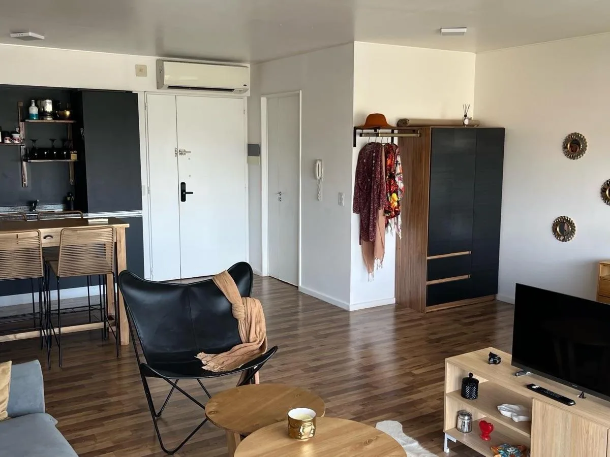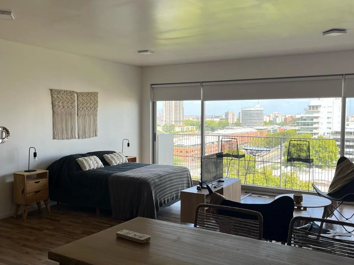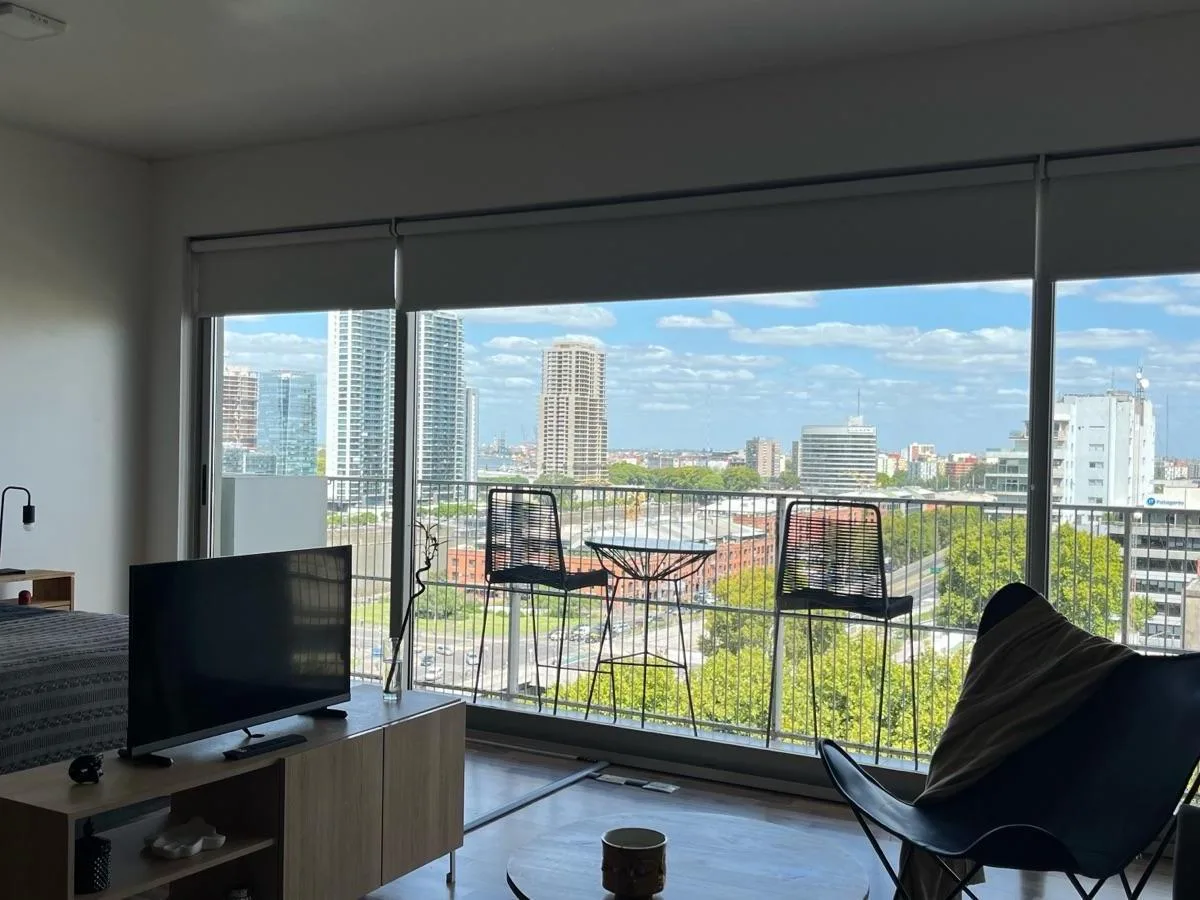 Квартира-студия с мебелью в Quartier, 8-й этаж. Балкон, окна с видом в сторону Puerto Madero. Полностью меблирована и оснащена, включая кухню, Wi‑Fi. В комплексе Quartier: бассейн под открытым небом, spa, сухая и влажная сауна, оборудованный тренажёрный зал, массажные кабинеты, общая гостиная для жильцов (SUM), озеленённые сады, охрана 24 часа, парковка без навеса и услуга valet parking. В сообщении указаны все услуги включёнными; адрес Azopardo 700.