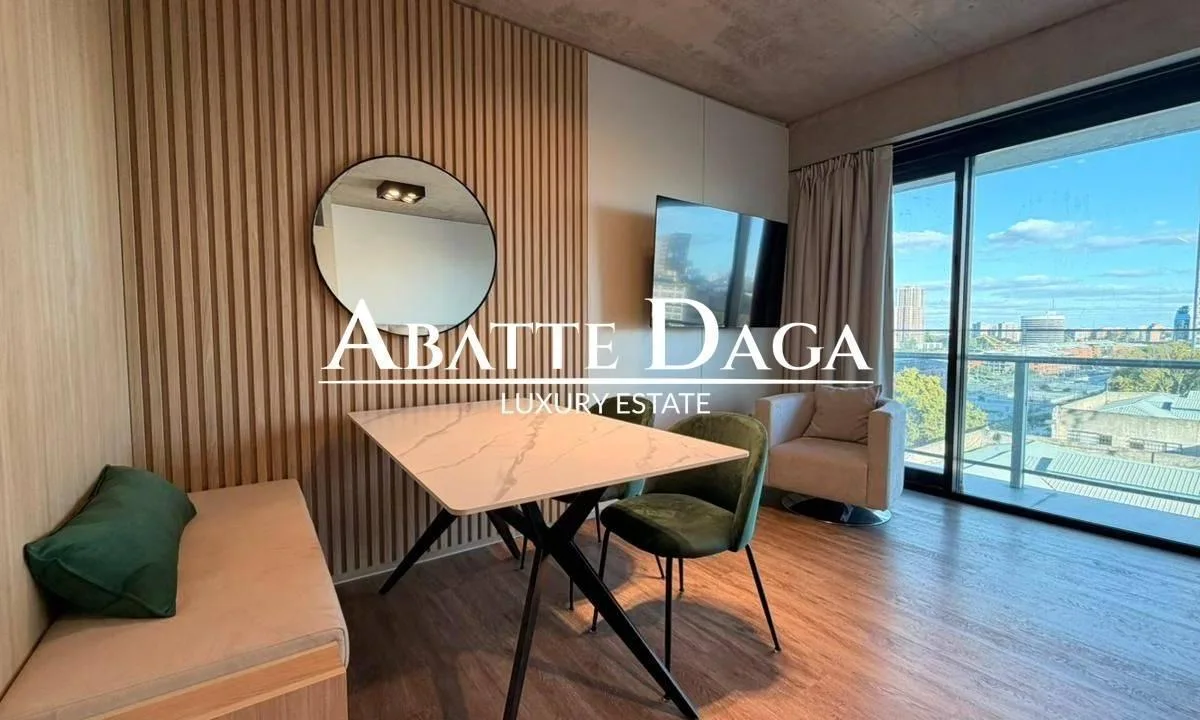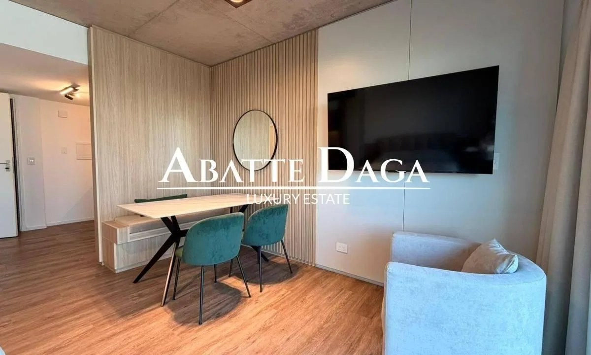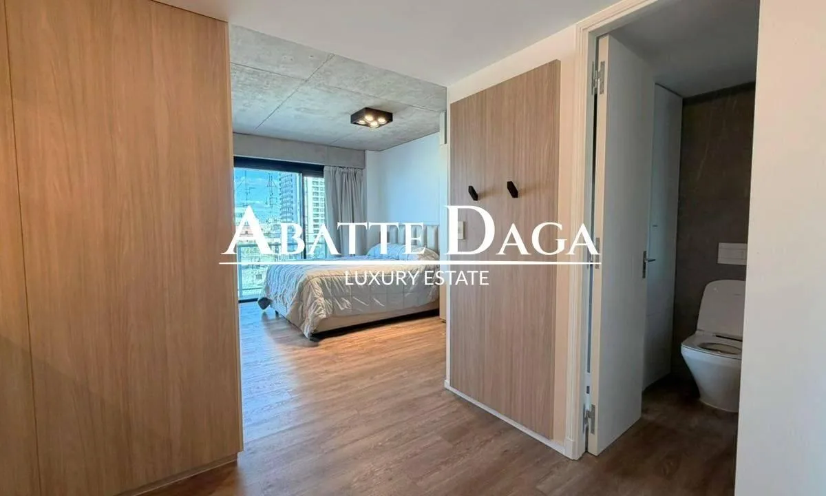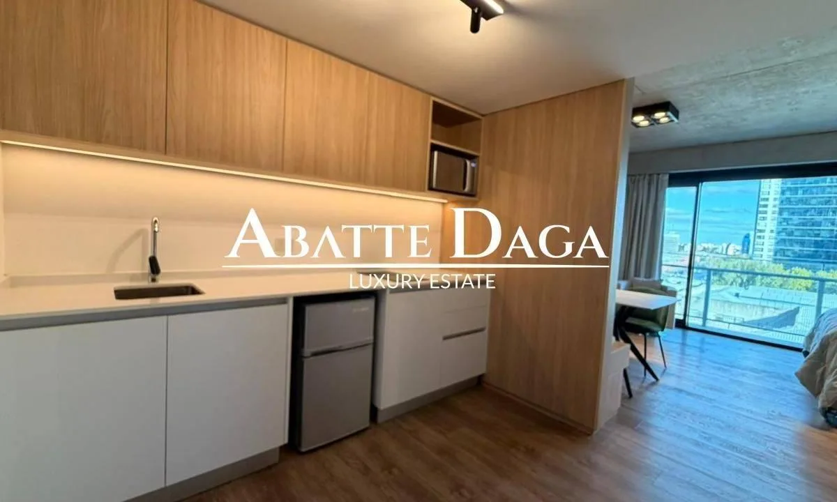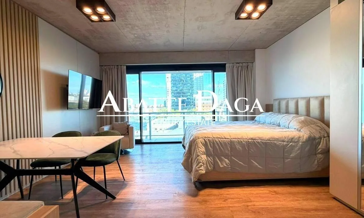 Квартира-студия площадью не указана, с мебелью, в Quartier del Bajo, Puerto Madero, окна на балкон с панорамным видом на город и Puerto Madero. Кухня оборудована мебелью верхнего и нижнего яруса, электрической варочной поверхностью, фригобаром с морозильной камерой и микроволновой печью; есть стол на 4 персоны. В ванной душевая, предусмотрено место для хранения; в зоне спальни шкаф для одежды, кровать Queen Size и Smart TV. Установлены кондиционер (охлаждение/обогрев) и шторы black out, доступ п