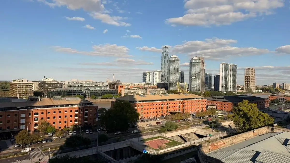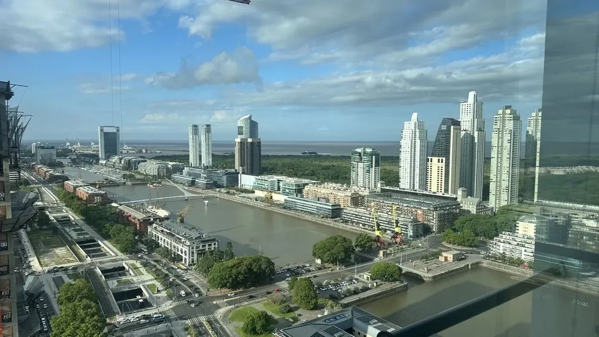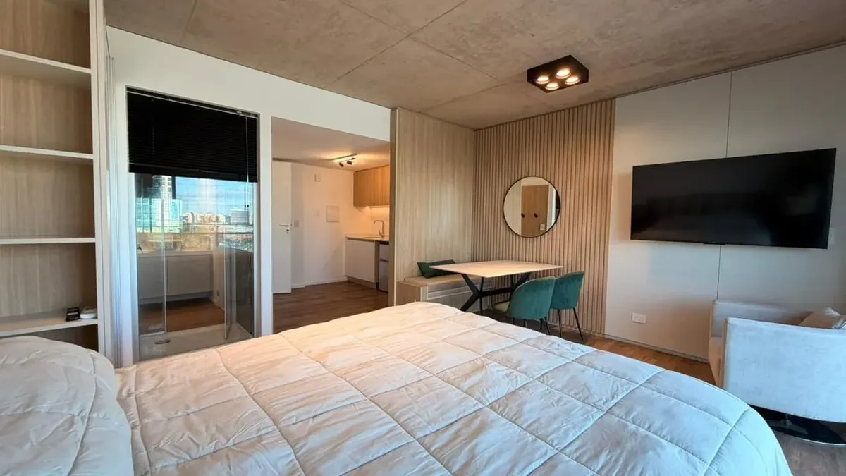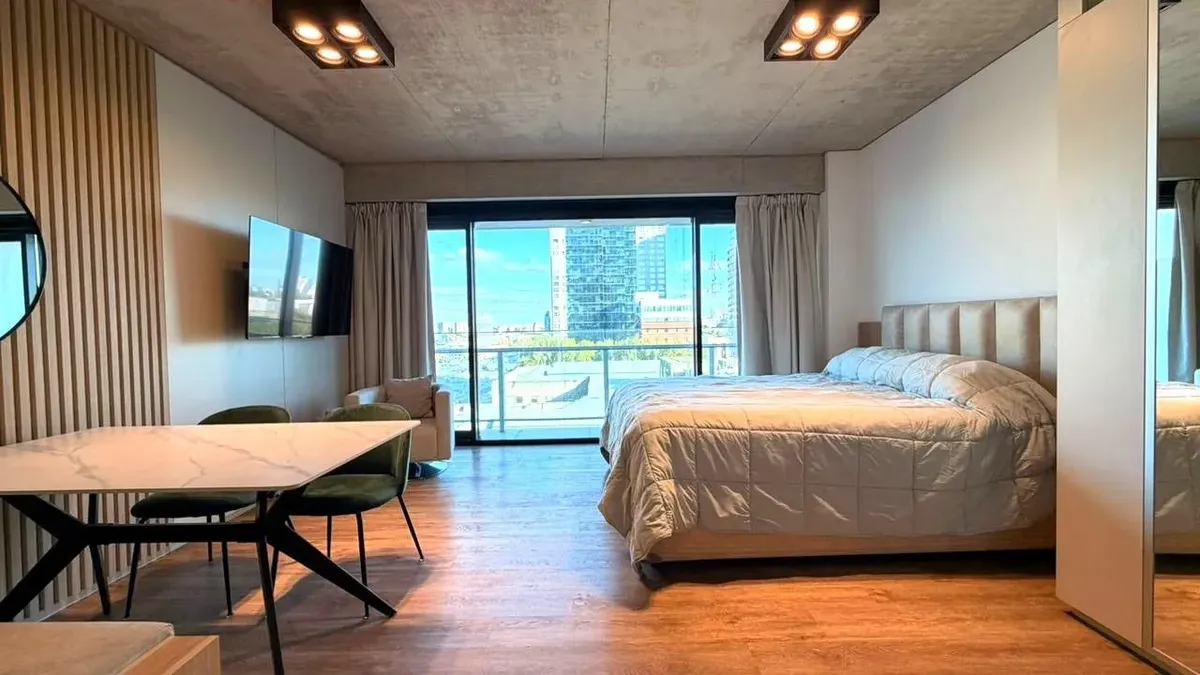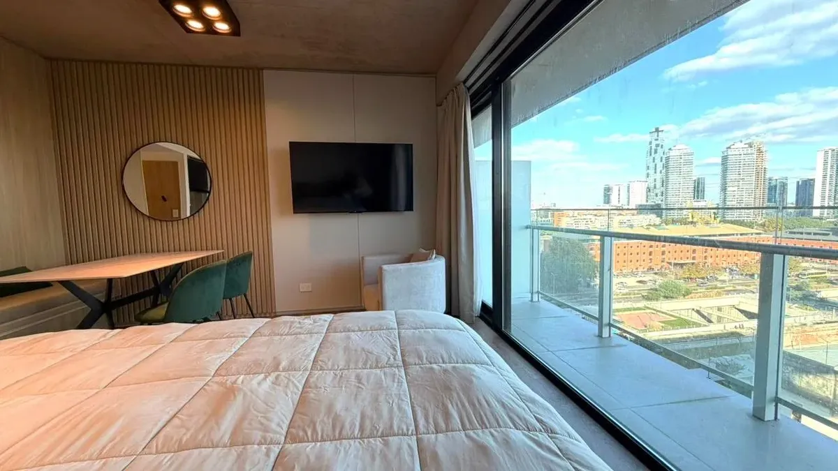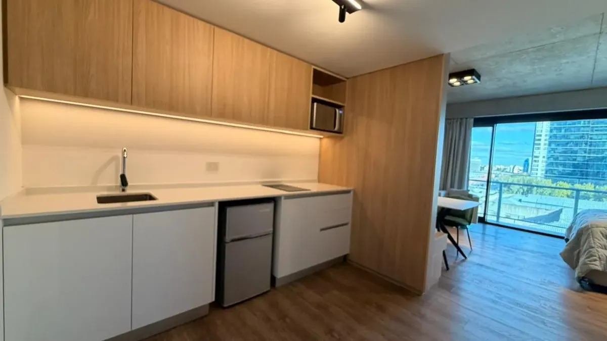 Квартира-студия с мебелью в San Telmo, Quartier del Bajo, площадь и этаж не указаны. Окна на балкон, панорамный вид на город и Puerto Madero. Кухня оборудована анэфе электрическим, холодильником с морозильной камерой (frigobar), микроволновой печью, есть обеденный стол на 4 человека. В ванной с душем установлена мебель для хранения. В студии гардероб, кровать Queen Size, Smart TV, кондиционер холод-горячий и затемняющие шторы. Есть бассейн с подогревом, SUM, зона гриля, тренажёрный зал, сауна, м