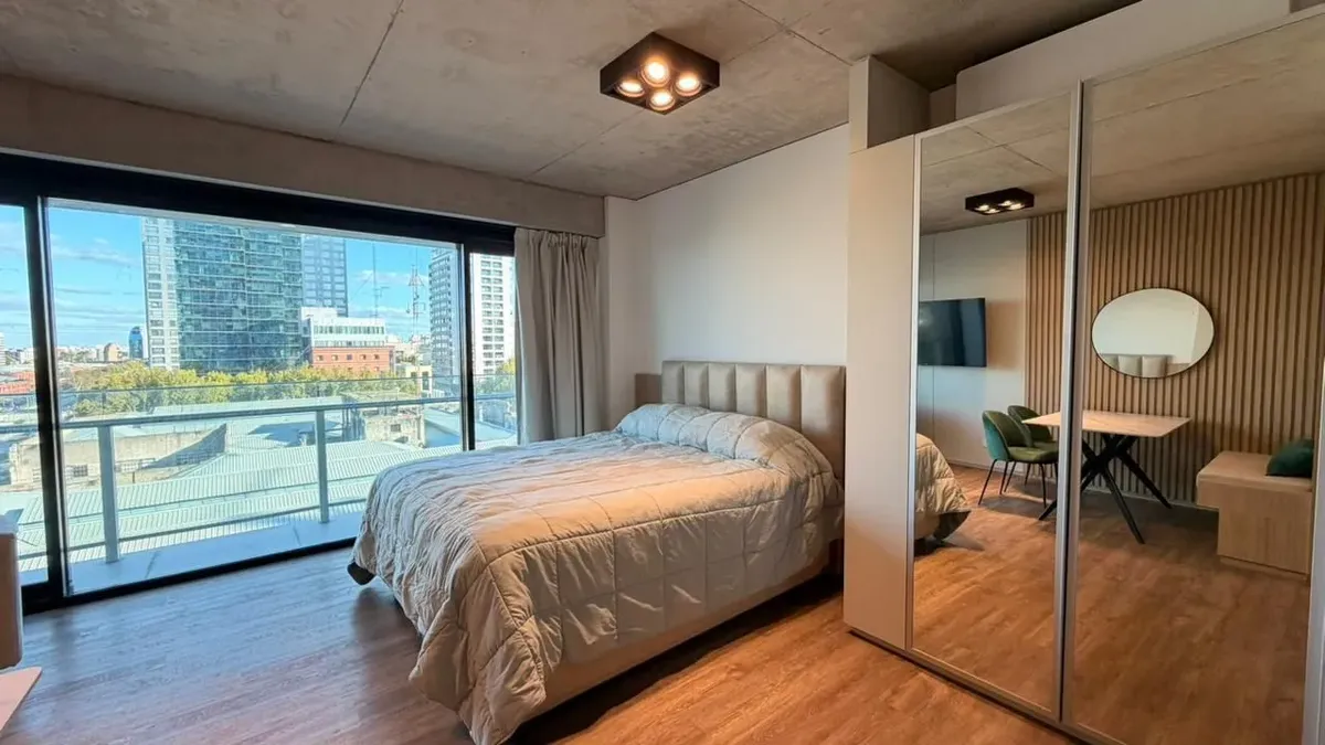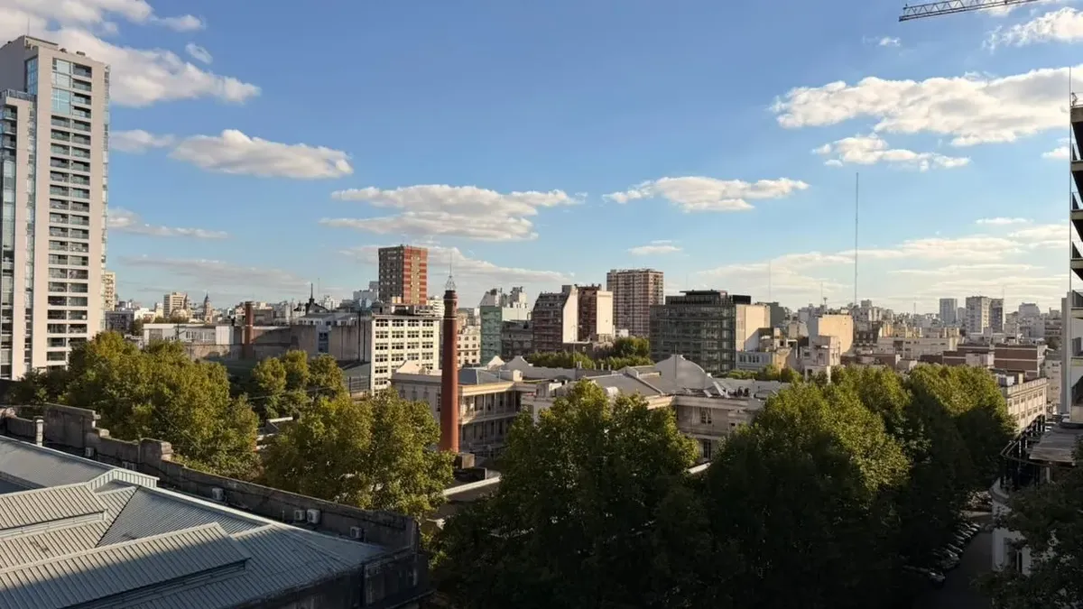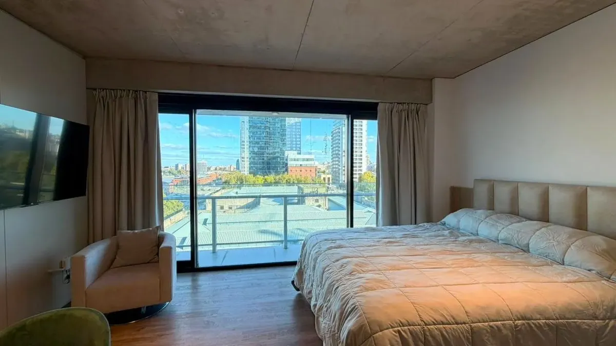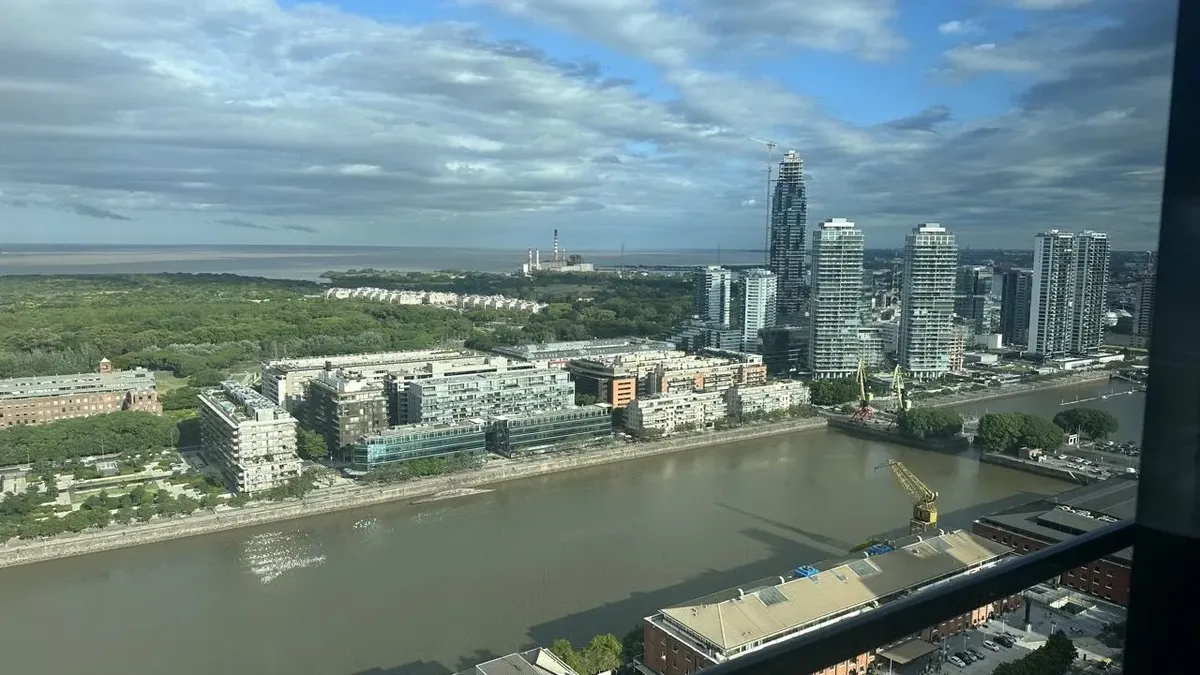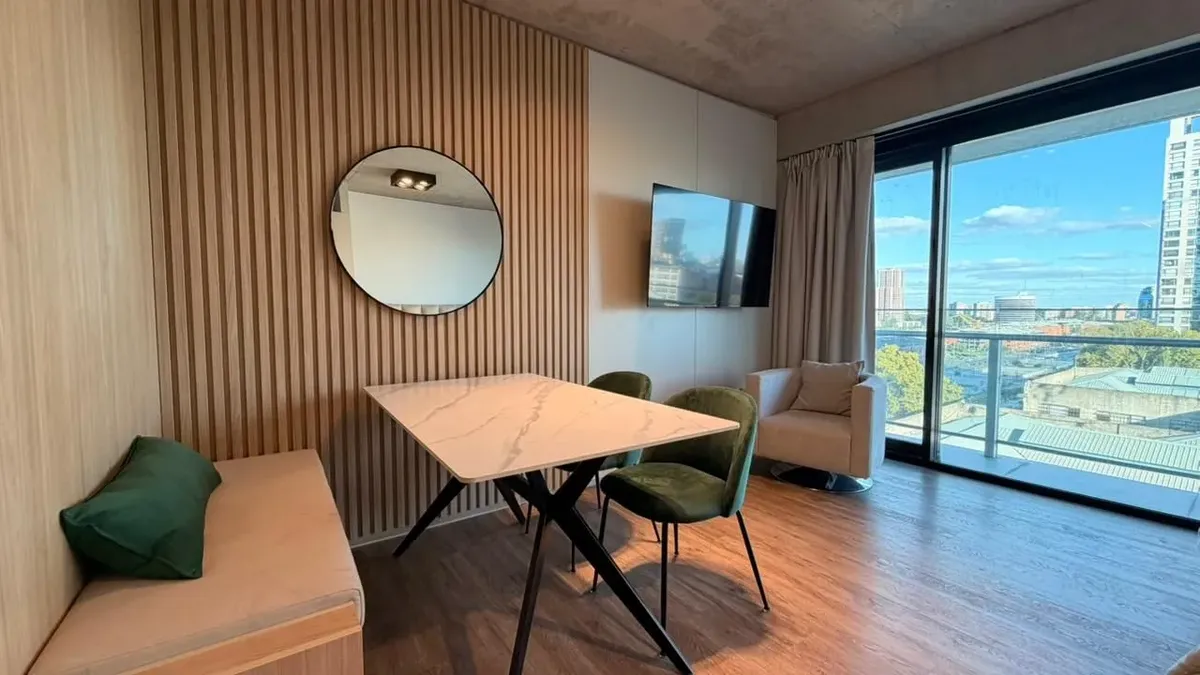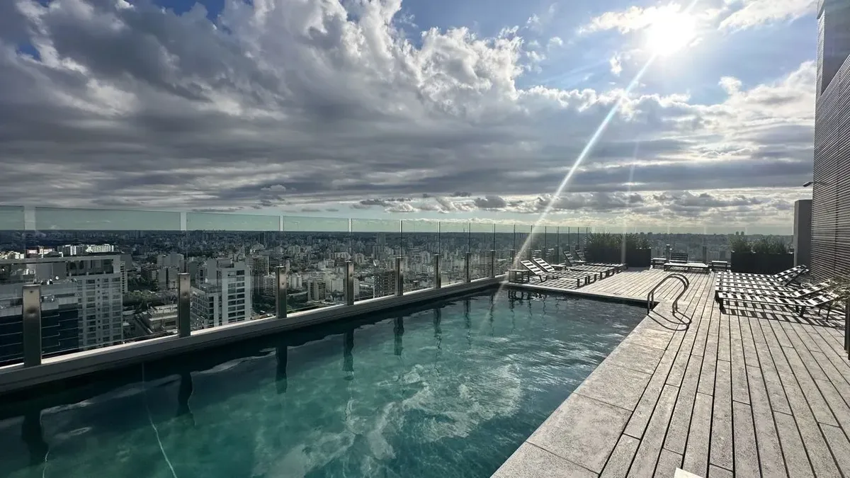 Квартира-студия с мебелью в San Telmo, Quartier del Bajo, площадь и этаж не указаны. Окна на балкон, панорамный вид на город и Puerto Madero. Кухня оборудована анэфе электрическим, холодильником с морозильной камерой (frigobar), микроволновой печью, есть обеденный стол на 4 человека. В ванной с душем установлена мебель для хранения. В студии гардероб, кровать Queen Size, Smart TV, кондиционер холод-горячий и затемняющие шторы. Есть бассейн с подогревом, SUM, зона гриля, тренажёрный зал, сауна, м