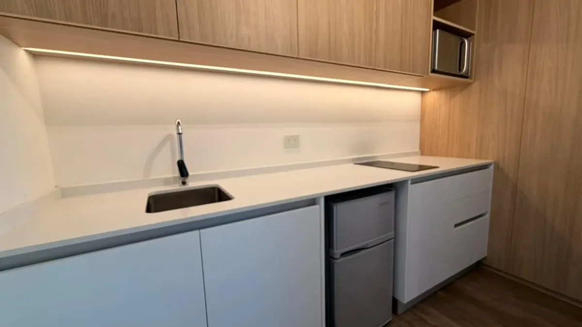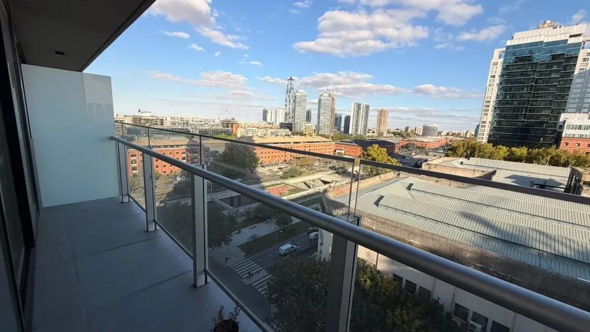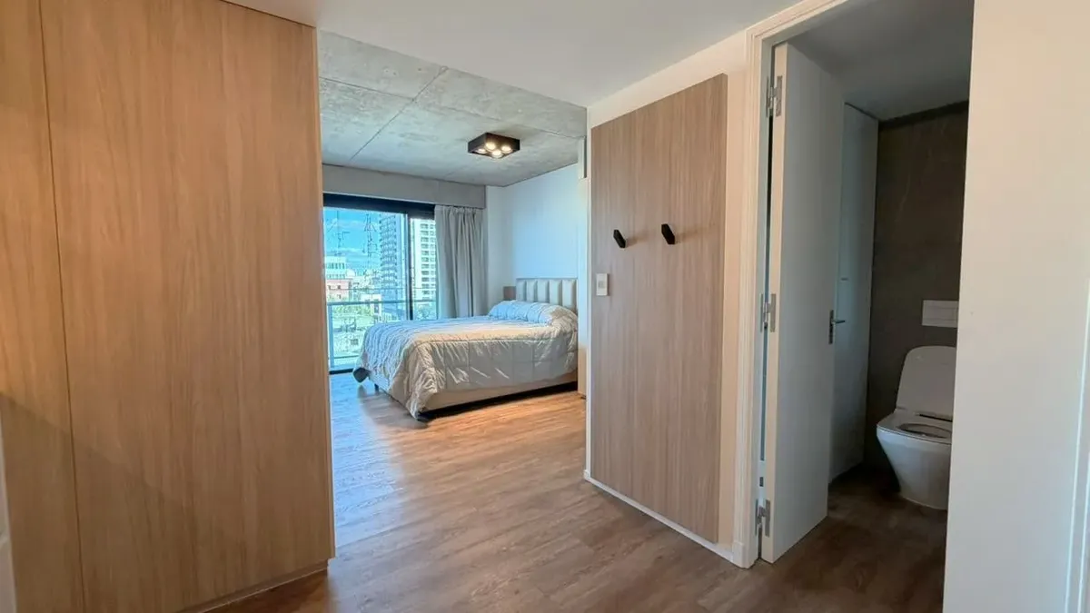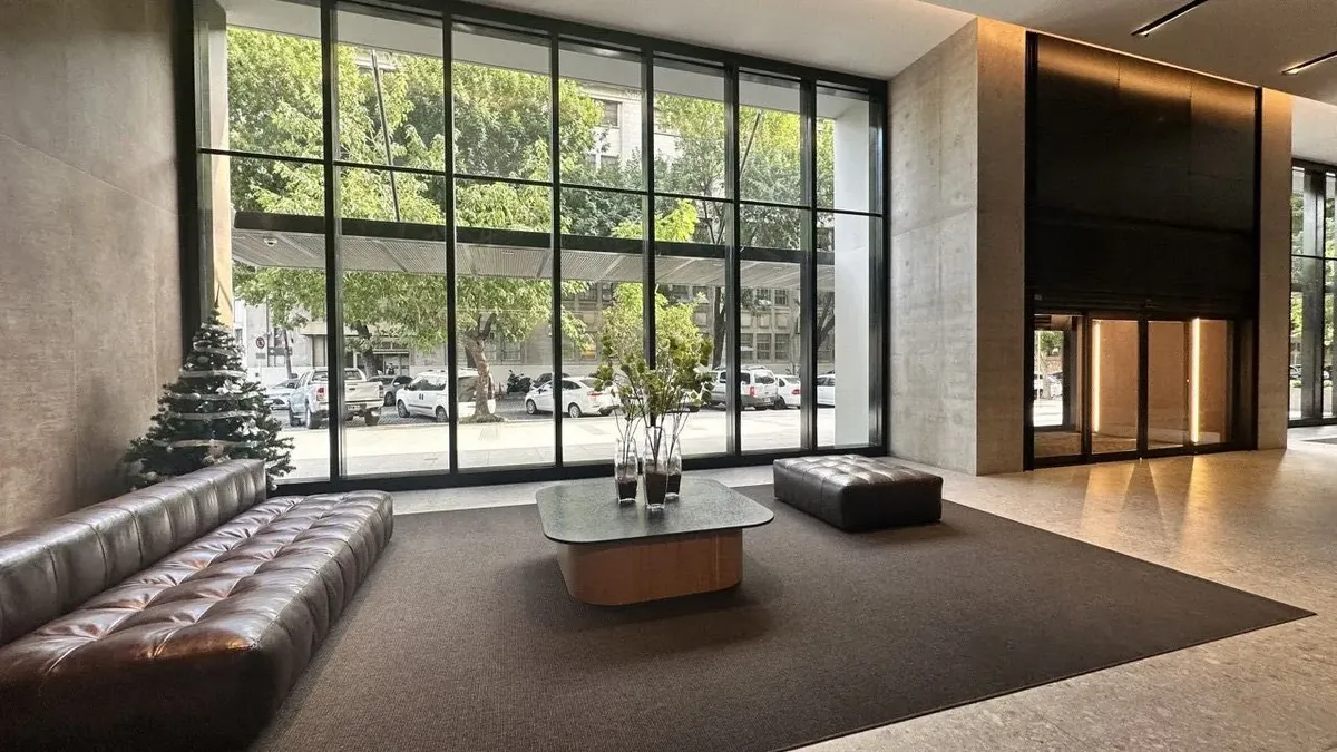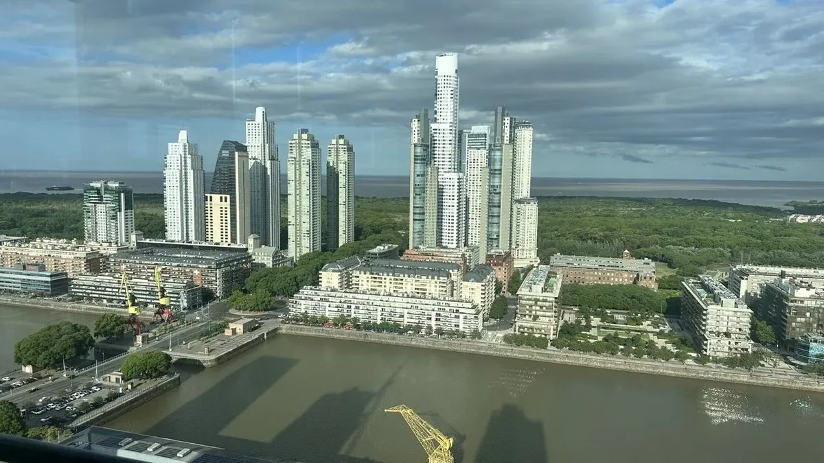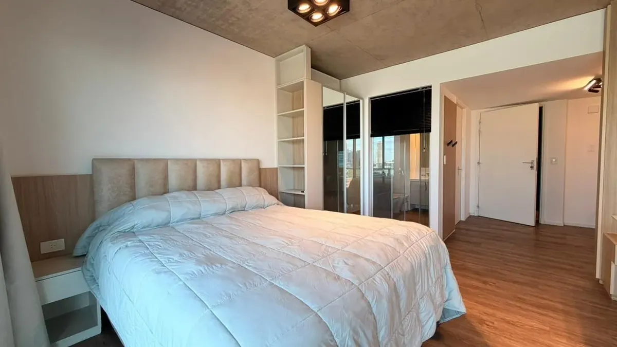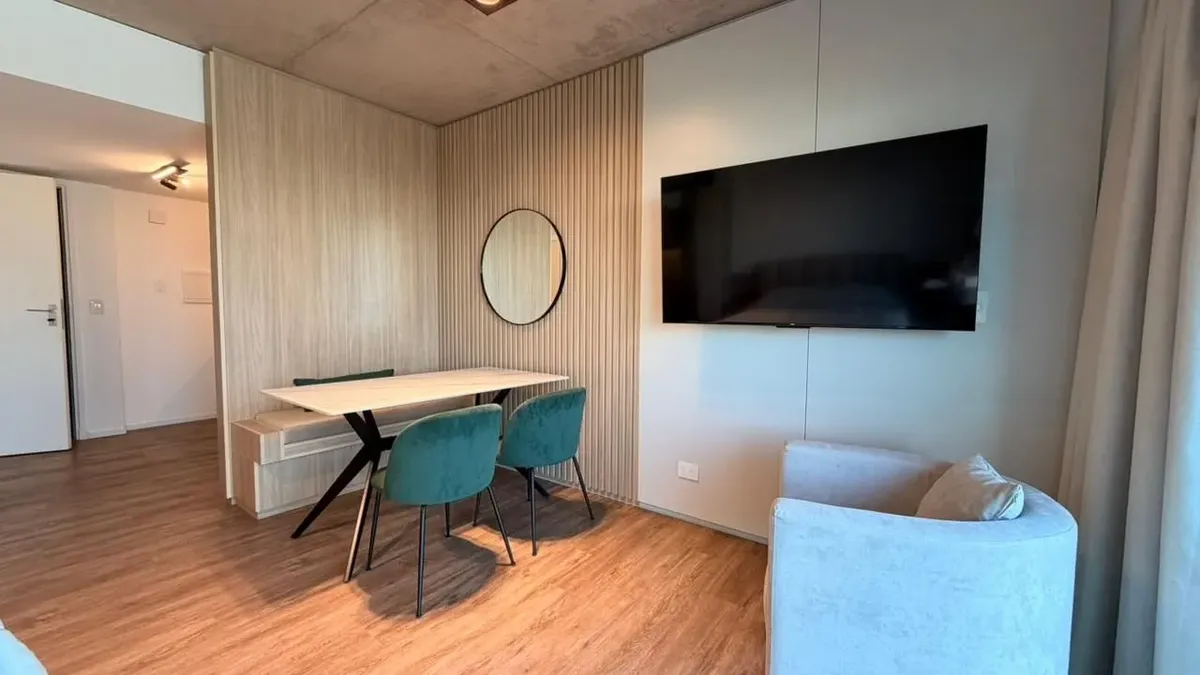 Квартира-студия с мебелью в San Telmo, Quartier del Bajo, площадь и этаж не указаны. Окна на балкон, панорамный вид на город и Puerto Madero. Кухня оборудована анэфе электрическим, холодильником с морозильной камерой (frigobar), микроволновой печью, есть обеденный стол на 4 человека. В ванной с душем установлена мебель для хранения. В студии гардероб, кровать Queen Size, Smart TV, кондиционер холод-горячий и затемняющие шторы. Есть бассейн с подогревом, SUM, зона гриля, тренажёрный зал, сауна, м
