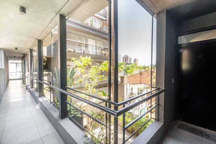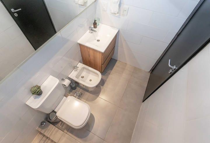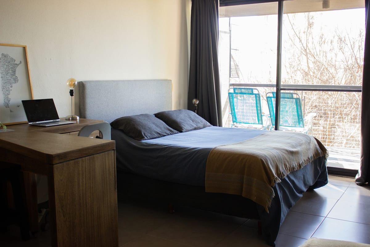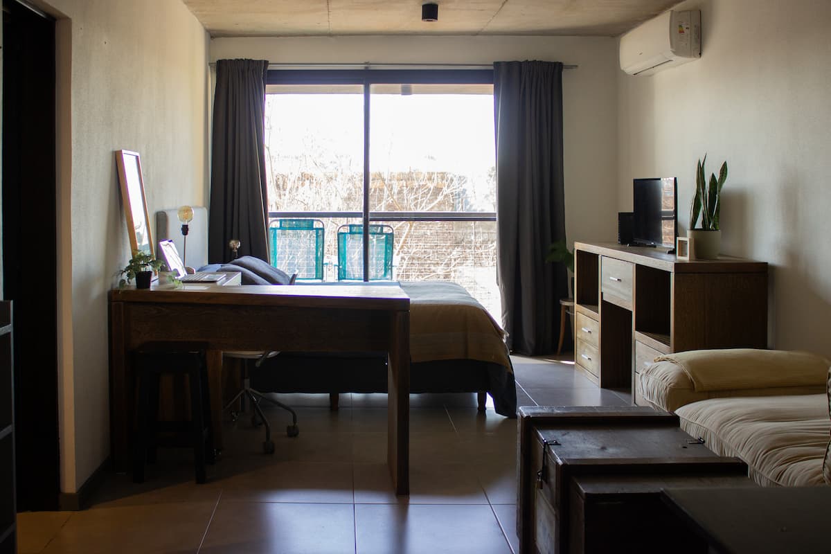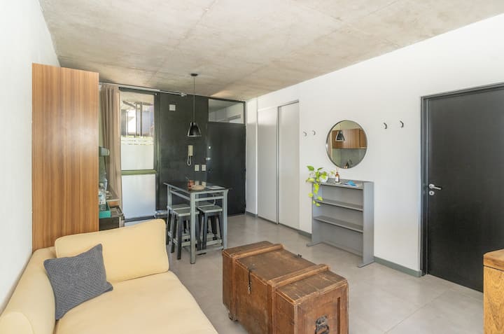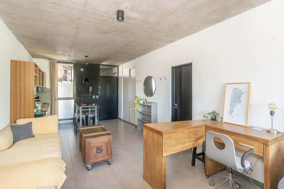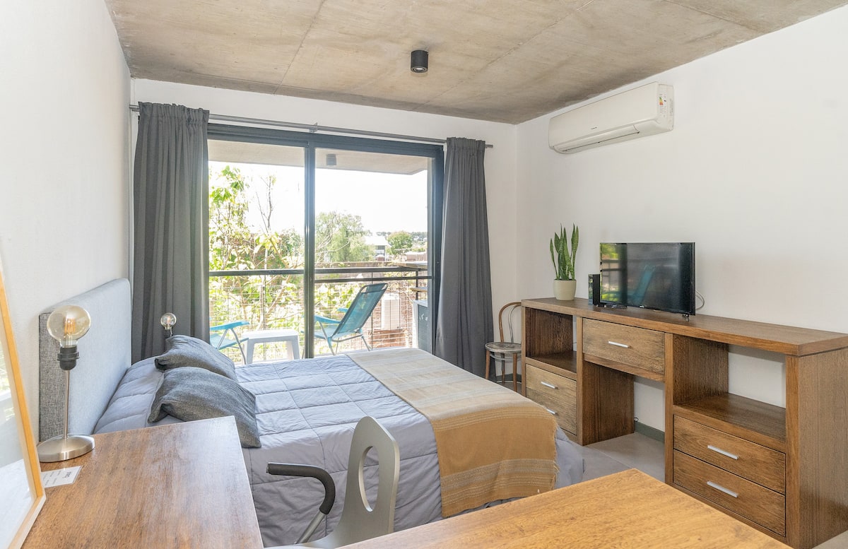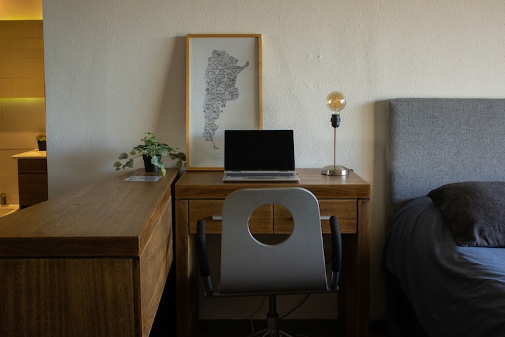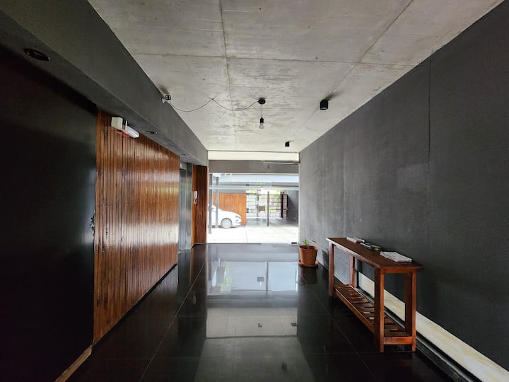 Квартира-студия в Tigre, на 2-м этаже, с частным балконом. После ремонта санузел; оборудованная кухня; обеденная и гостиная зоны объединены, есть рабочий стол. В здании предусмотрено парковочное место внутри для 1 автомобиля среднего размера (под SUV тоже), бесплатное; большие фургоны и 4x4 не помещаются. На террасе есть общая для жильцов прачечная.