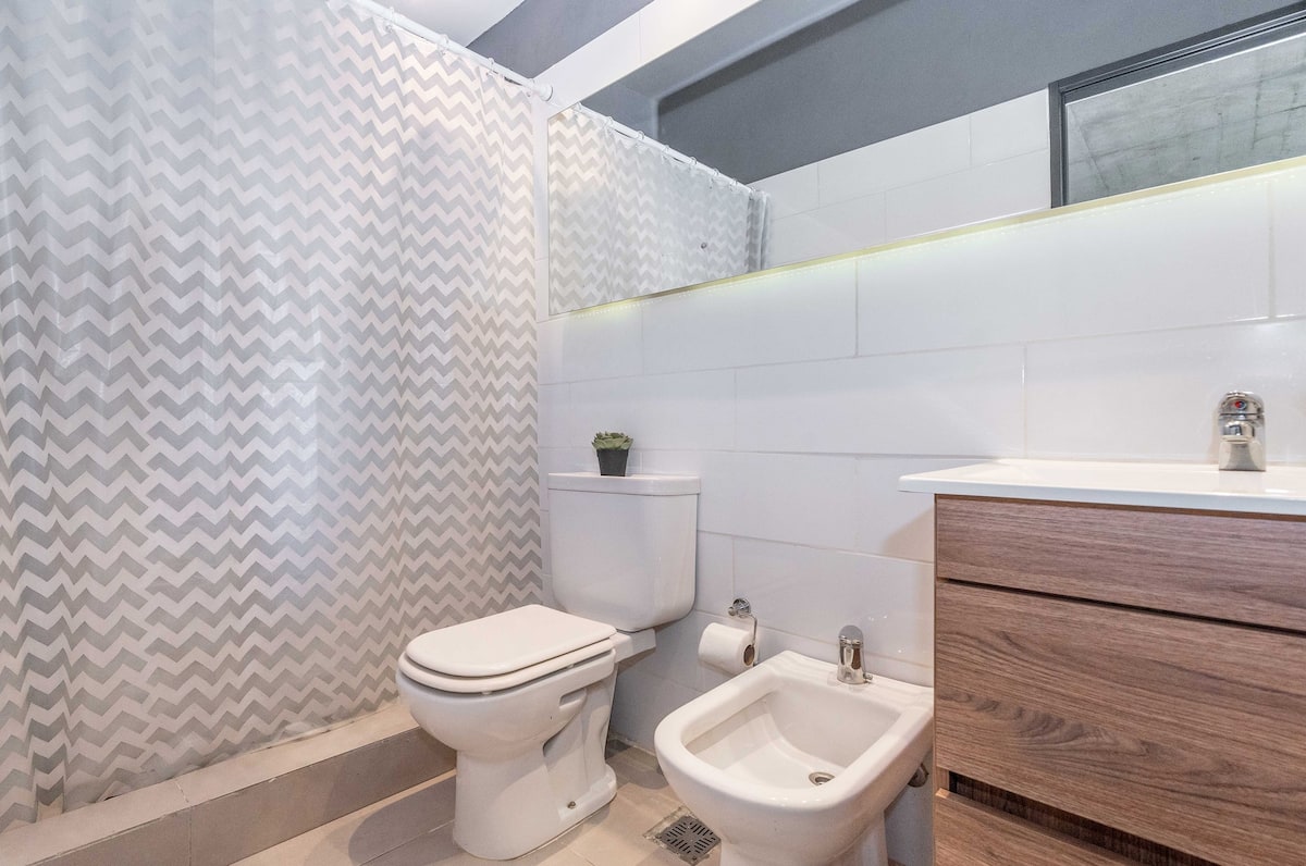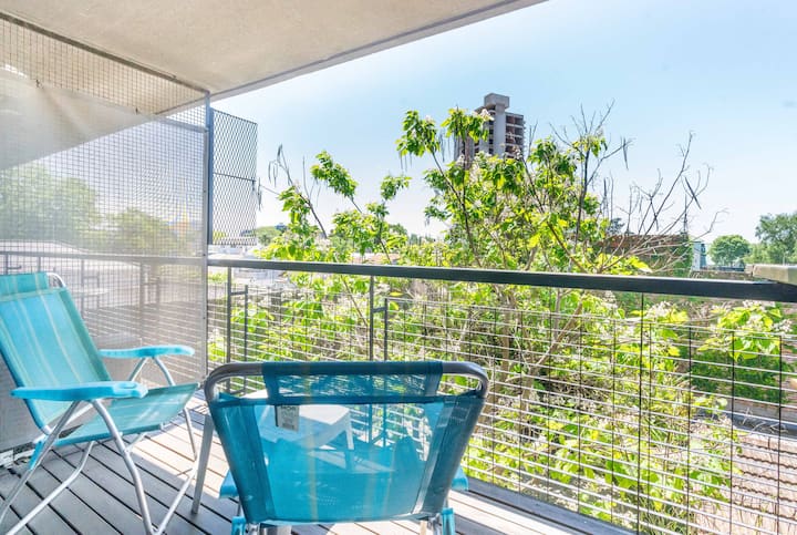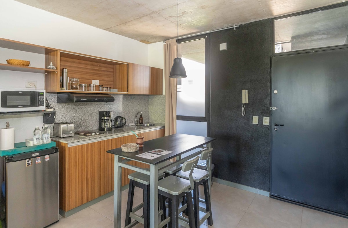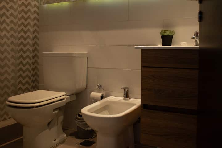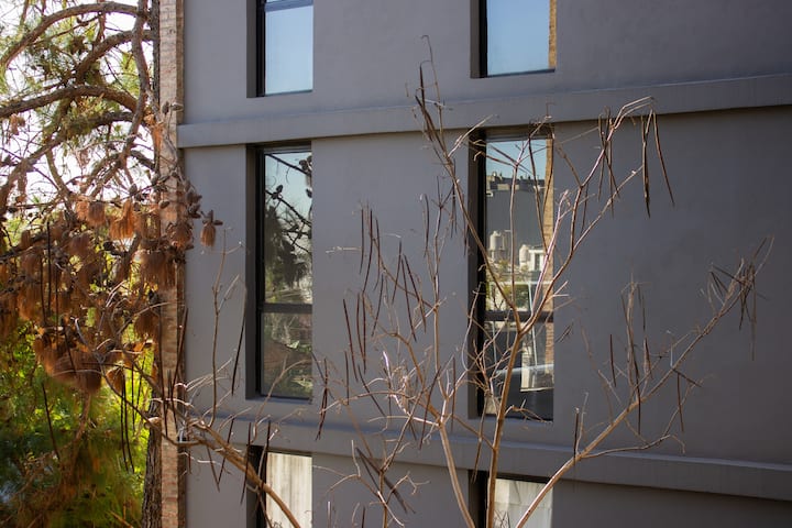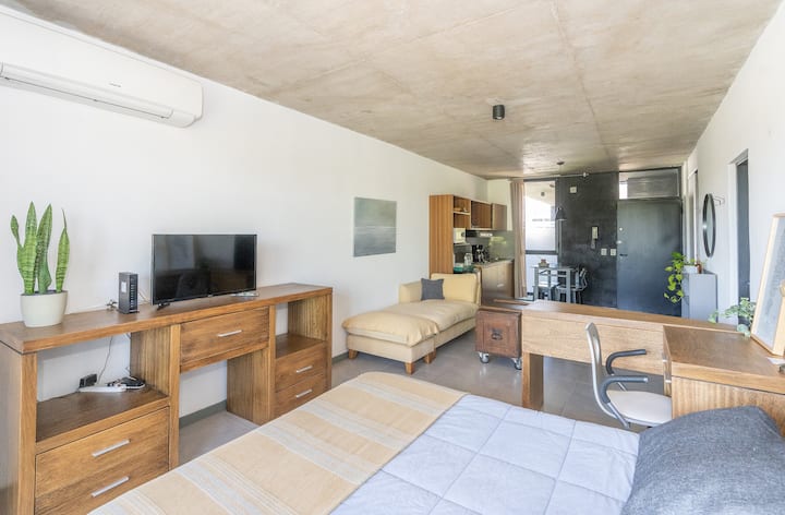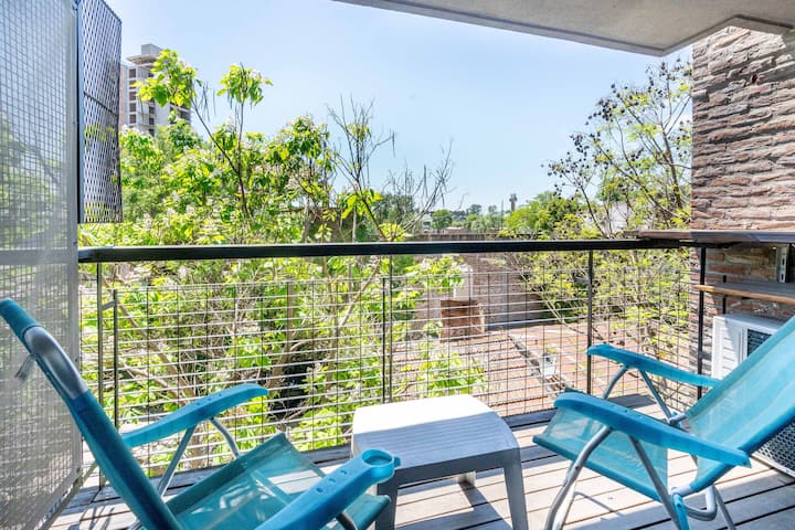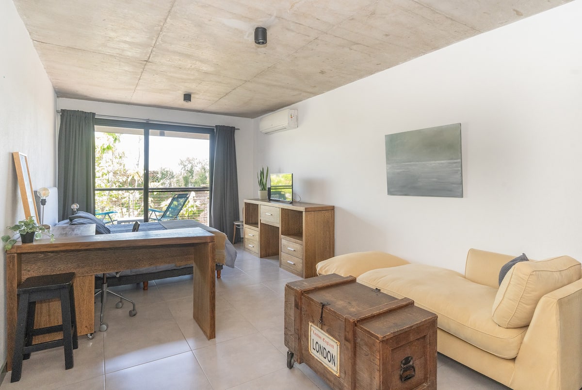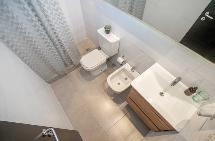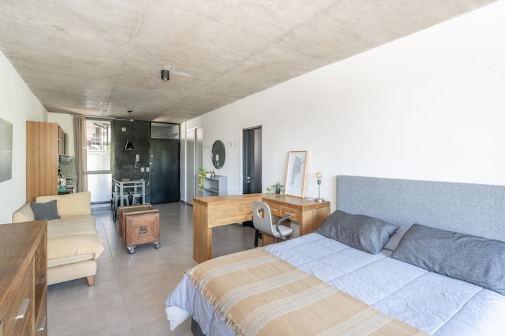 Квартира-студия в Tigre, на 2-м этаже, с частным балконом. После ремонта санузел; оборудованная кухня; обеденная и гостиная зоны объединены, есть рабочий стол. В здании предусмотрено парковочное место внутри для 1 автомобиля среднего размера (под SUV тоже), бесплатное; большие фургоны и 4x4 не помещаются. На террасе есть общая для жильцов прачечная.