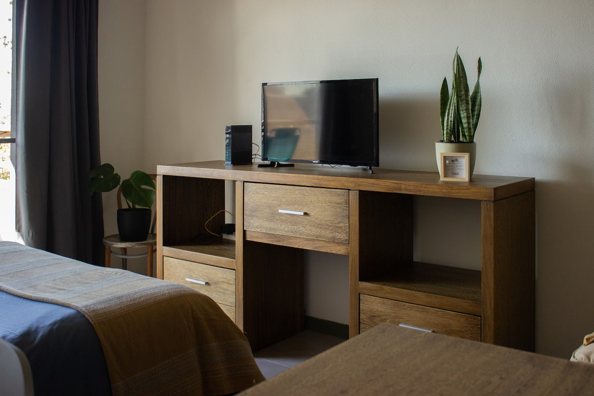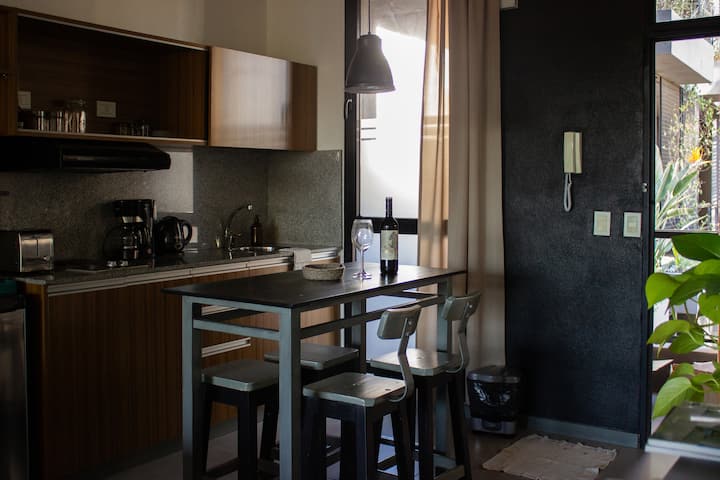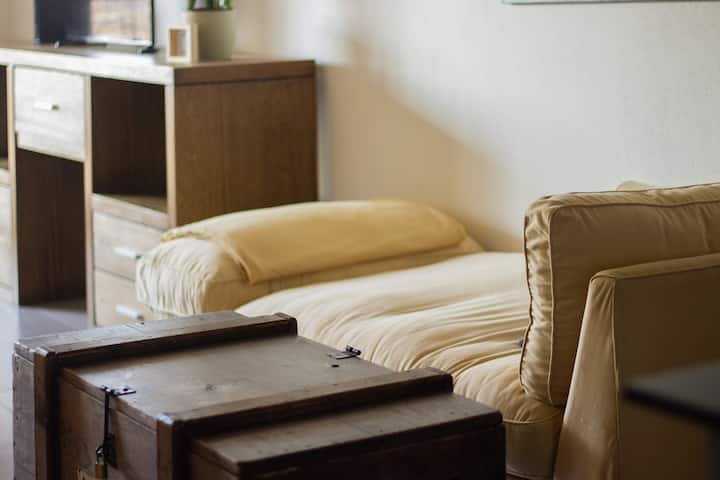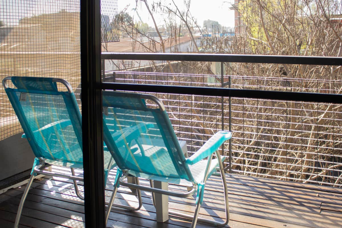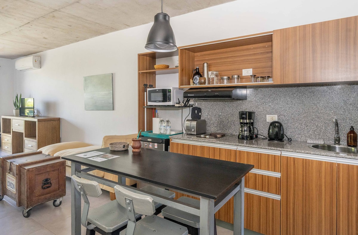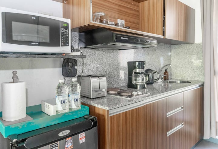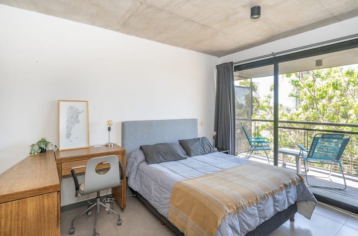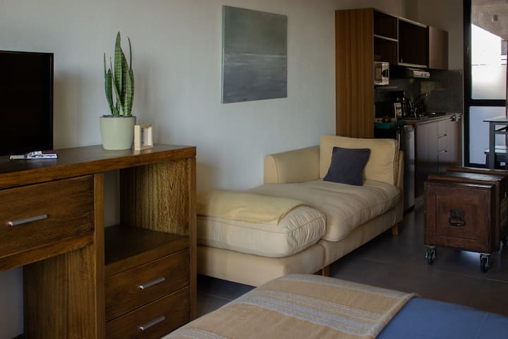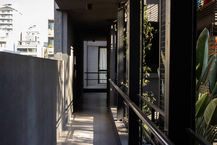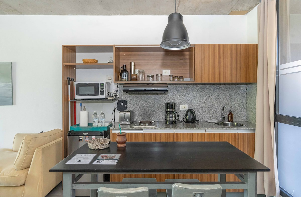 Квартира-студия в Tigre, на 2-м этаже, с частным балконом. После ремонта санузел; оборудованная кухня; обеденная и гостиная зоны объединены, есть рабочий стол. В здании предусмотрено парковочное место внутри для 1 автомобиля среднего размера (под SUV тоже), бесплатное; большие фургоны и 4x4 не помещаются. На террасе есть общая для жильцов прачечная.