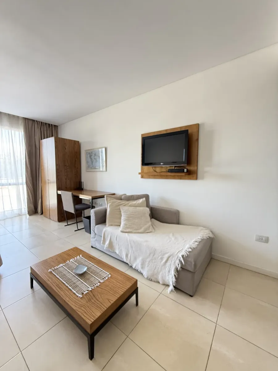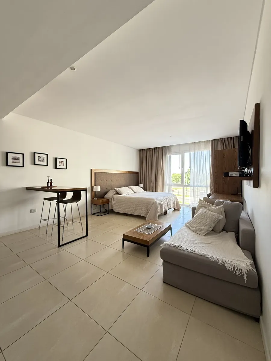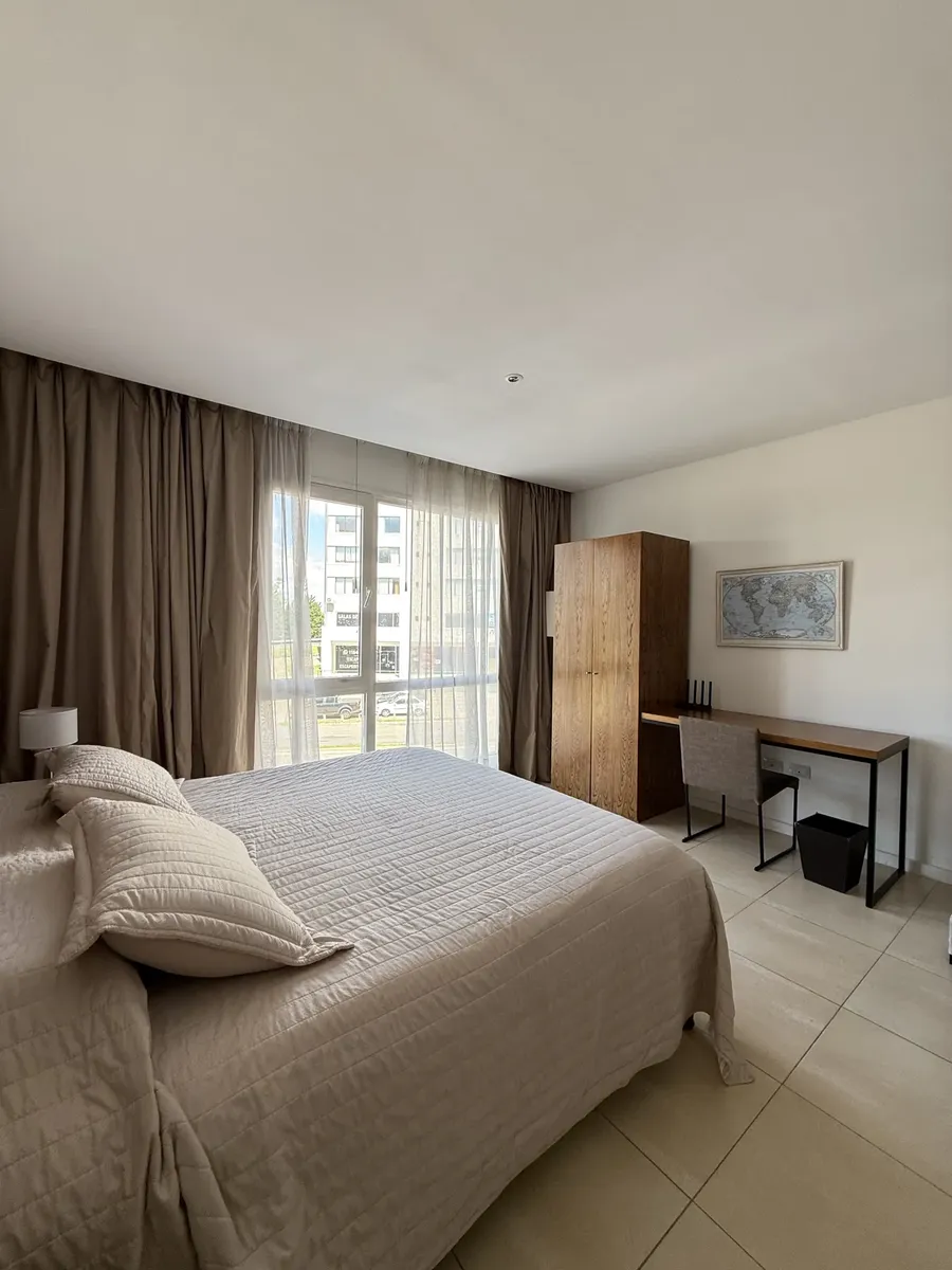 Квартира-студия в Nordelta, Tigre, G. B. a. Zona Norte, доступна с апреля. Площадь и этаж не указаны; окна выходят не указаны. Квартира полностью оборудована, с бельём и (закреплённым) крытым парковочным местом. Цена указана как пакет и включает коммунальные платежи здания, электроэнергию, AVN, муниципальные платежи и интернет. В здании есть спортзал; также предусмотрена возможность пользоваться членством отеля Wyndham, крытым и открытым бассейном с подогревом и SPA.