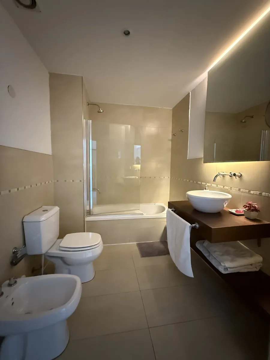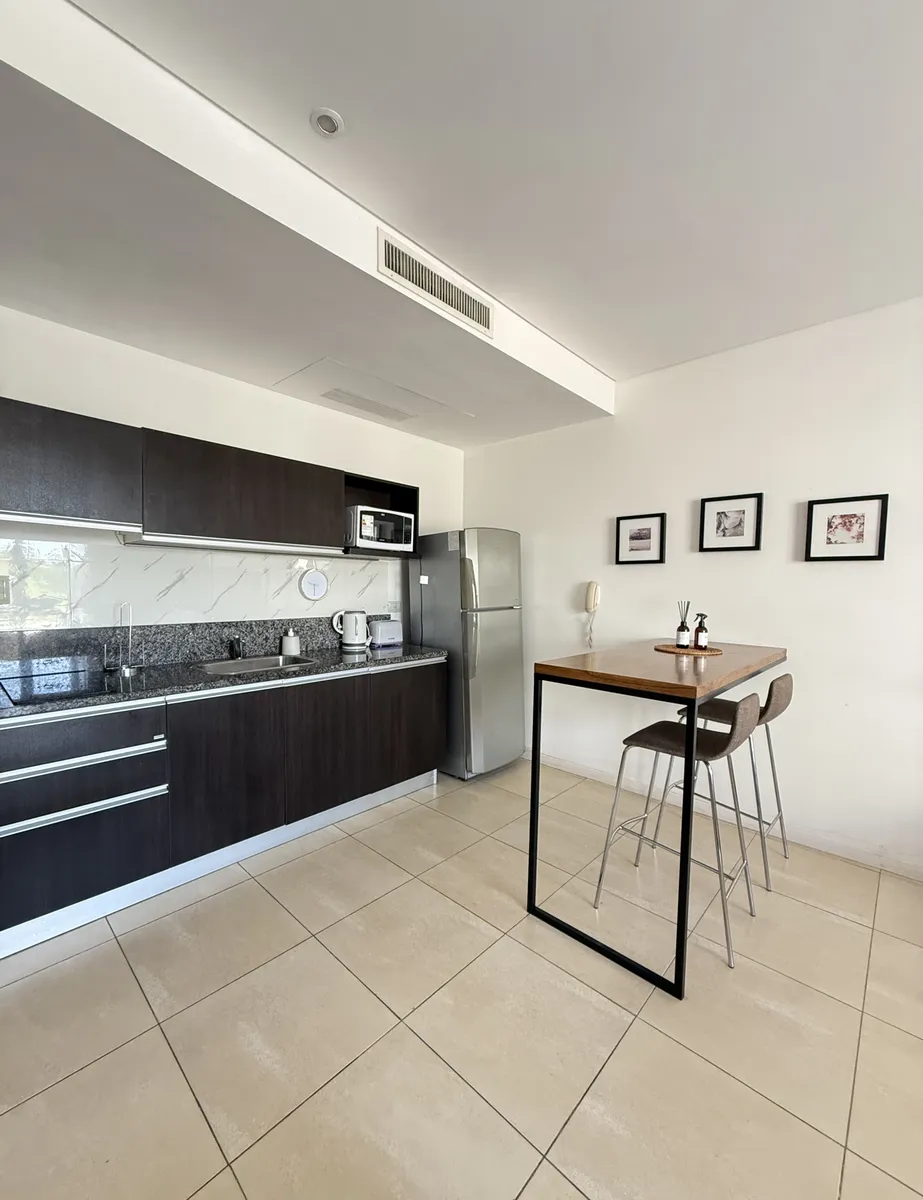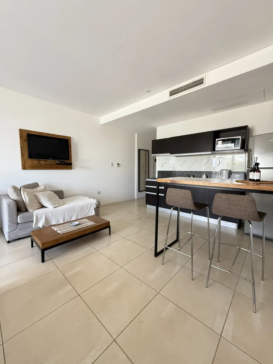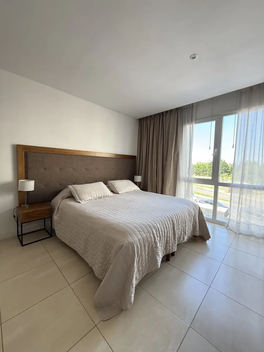 Квартира-студия в Nordelta, Tigre, G. B. a. Zona Norte, доступна с апреля. Площадь и этаж не указаны; окна выходят не указаны. Квартира полностью оборудована, с бельём и (закреплённым) крытым парковочным местом. Цена указана как пакет и включает коммунальные платежи здания, электроэнергию, AVN, муниципальные платежи и интернет. В здании есть спортзал; также предусмотрена возможность пользоваться членством отеля Wyndham, крытым и открытым бассейном с подогревом и SPA.