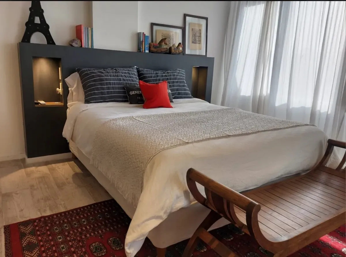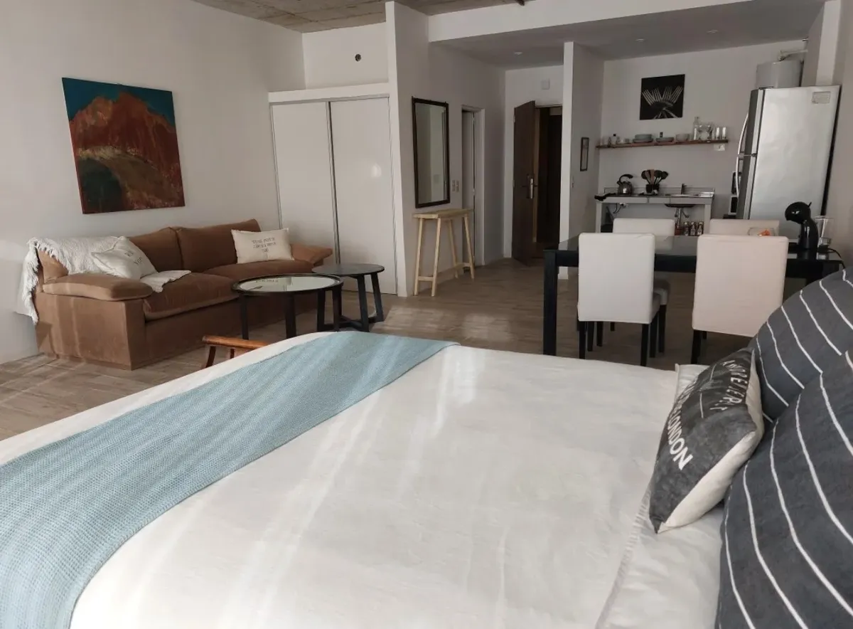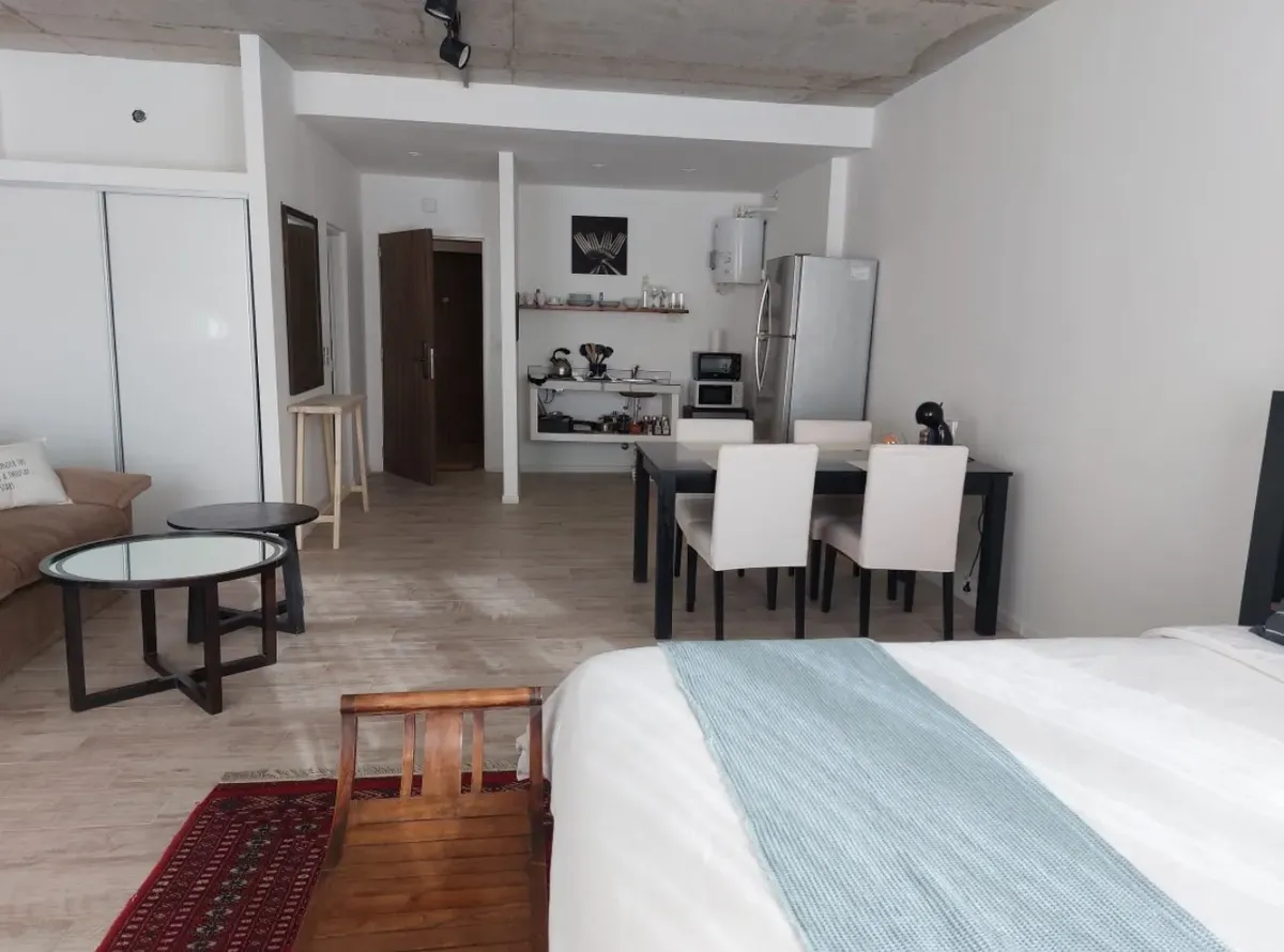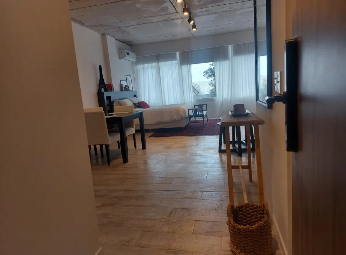 Квартира-студия в Delta Center в Tigre, 3-й этаж. Вариант сдачи с мебелью как на фото или без мебели. Внутри есть собственная ванная и (закреплённое) парковочное место. В здании работает охрана 24 часа в сутки. Среди удобств указаны открытый бассейн, солярий, valet parking и sky bar на последнем этаже; также упомянут встроенный генератор. Горячая вода — от индивидуального бойлера (calefón), доступ — по электронной блокировке с удалённым открытием. Коммунальные/эксплуатационные условия и площадь
