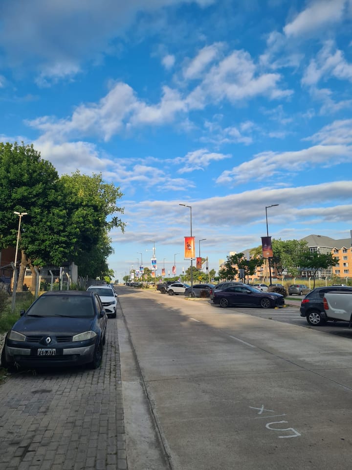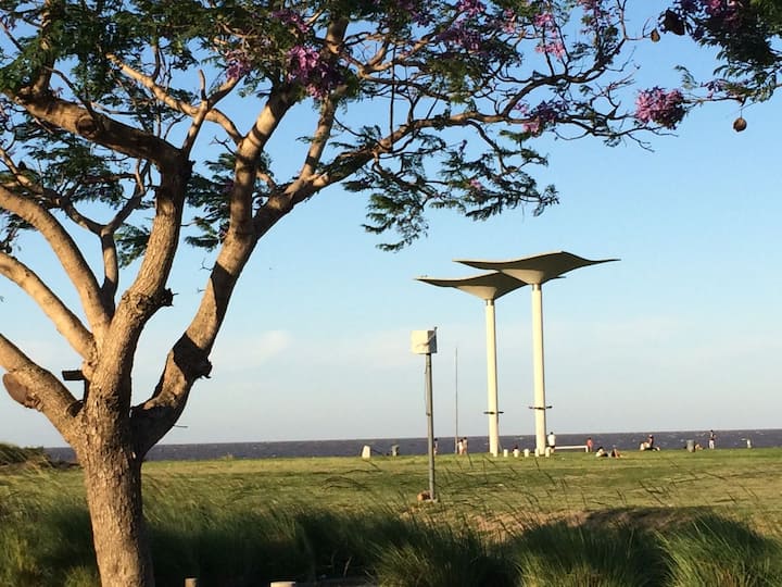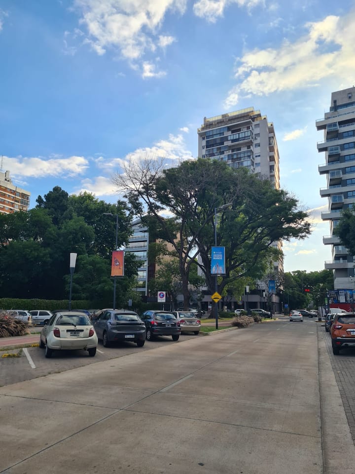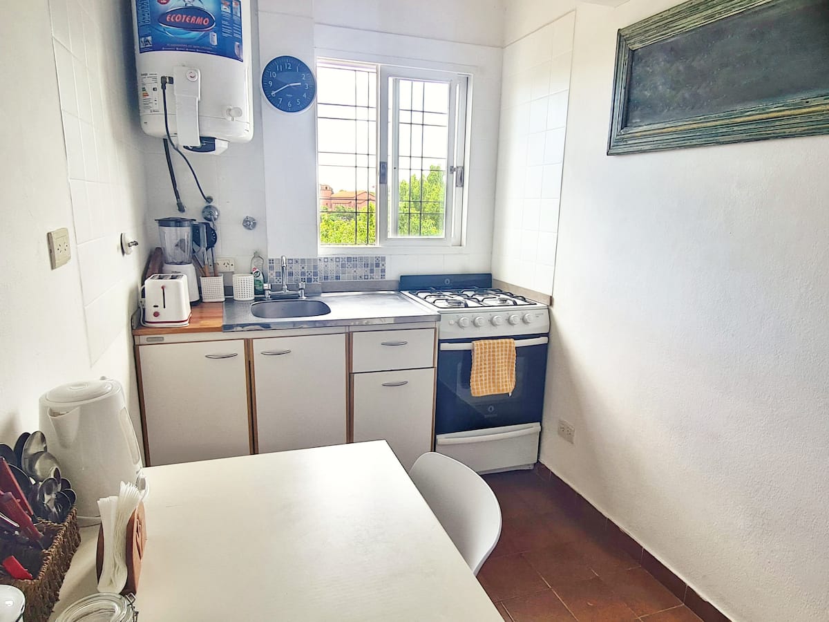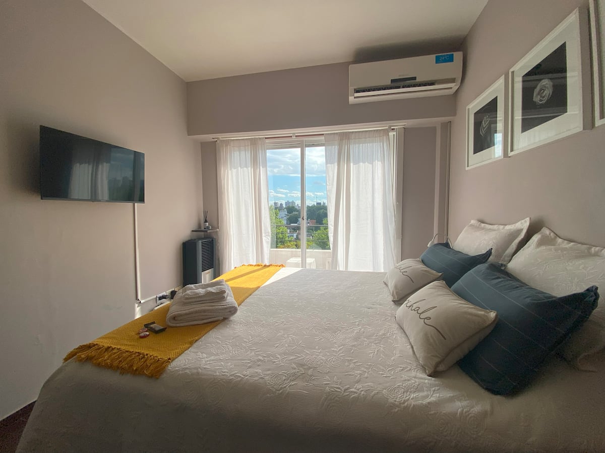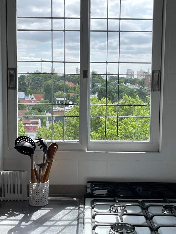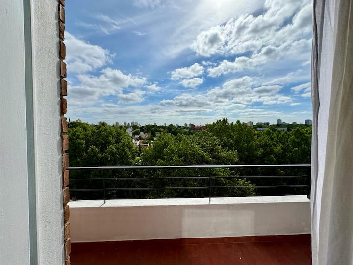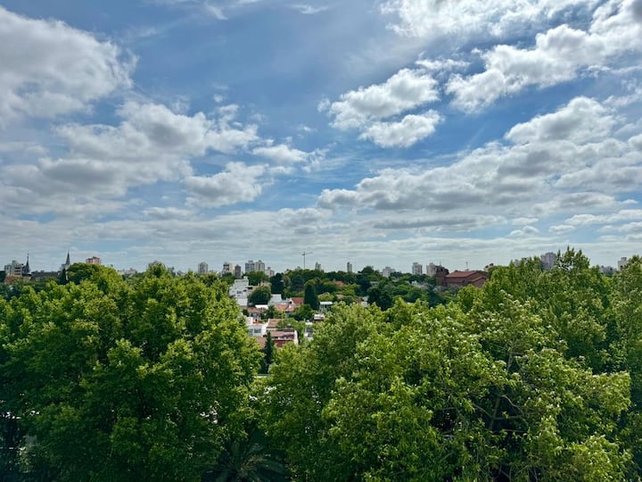 Квартира-студия в Vicente López. В ней есть двуспальная кровать, балкон и отдельная кухня с обеденным столом. В квартире установлены кондиционер и шкаф с вешалками, а также телевизор; в ванной душевая кабина, биде и унитаз. Кухня оборудована холодильником с морозильной камерой, плитой, духовкой, микроволновой печью, тостером и электрическим чайником. Указаны окна с видом на вершины деревьев и доступ к Wi‑Fi; вблизи Paseo de la Costa, примерно в 400 метрах от супермаркета.